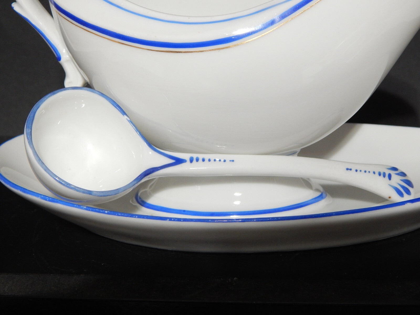 La salsiera in stile impero decorata a mano nello stabilimento Ginori a Doccia misura cm 18 x 7 e 10 cm di altezza il piatto alla base misura 23 x 13,5 cm, il cucchiaio misura 16 cm di lunghezza