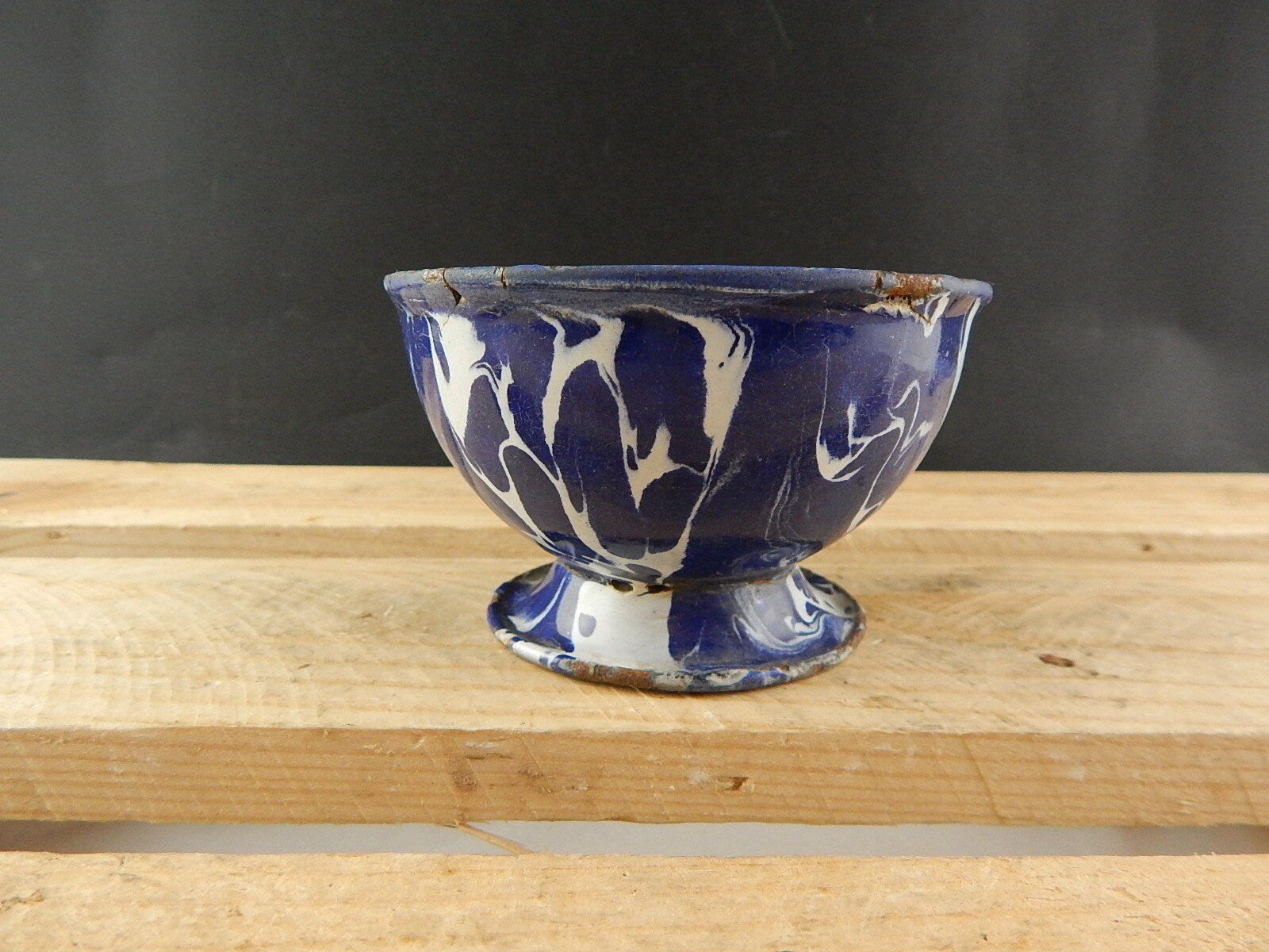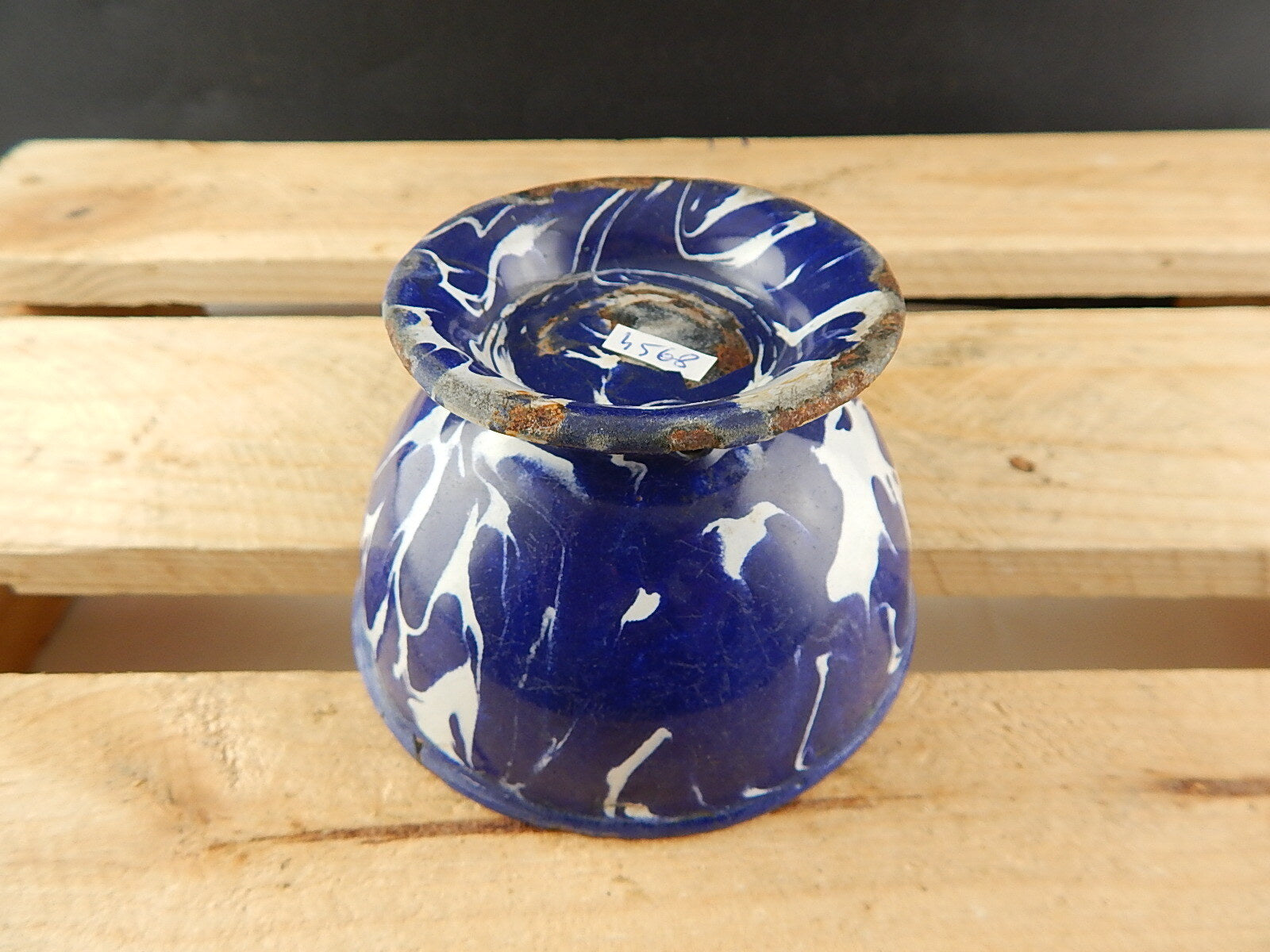 ANTICA RARA SCODELLA CIOTOLA LATTA METALLO SMALTATA BIANCA E BLU COUNTRY CHIC