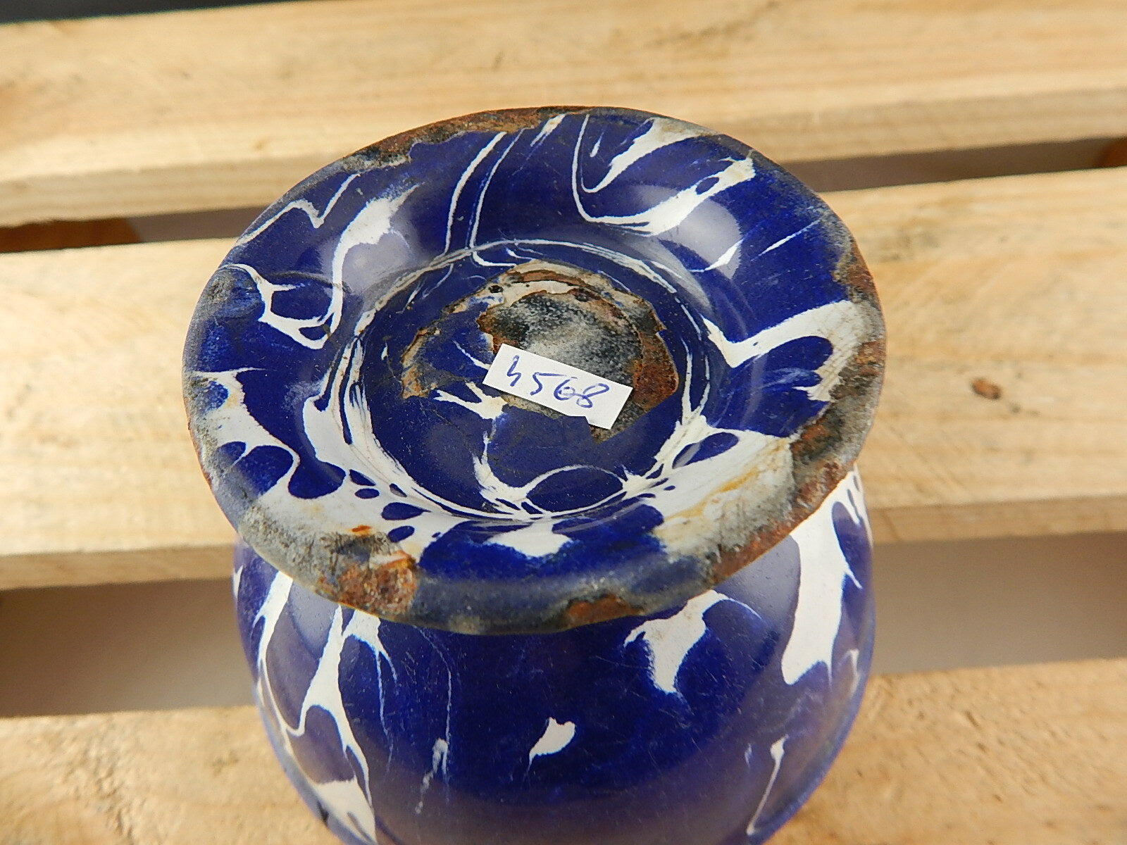 ANTICA SCODELLA CIOTOLA LATTA METALLO SMALTATA CAMOUFLAGE BLU COUNTRY CHIC
