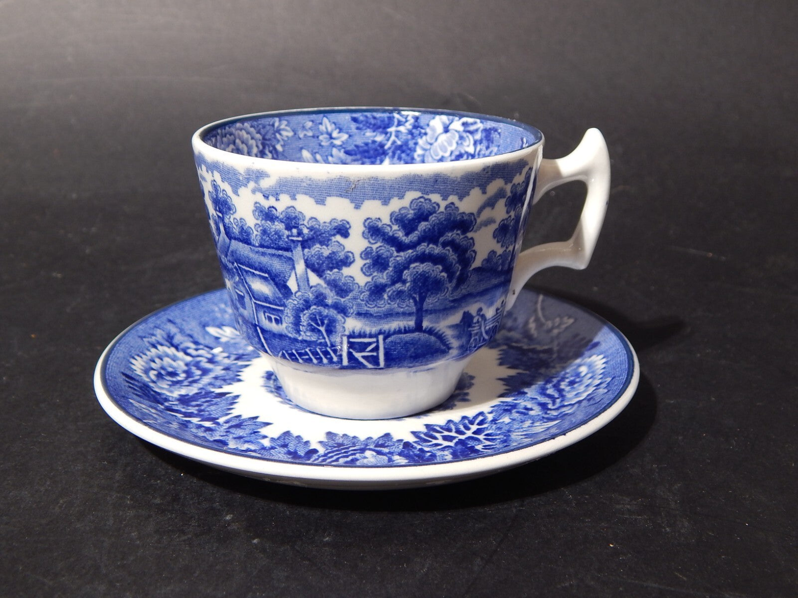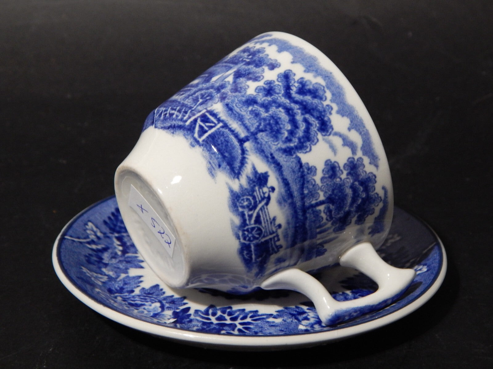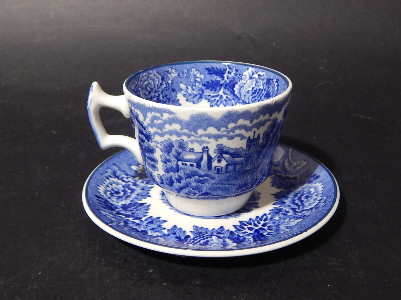 La tazza con decoro English Scenery blu misura 6 cm. di altezza e 8 cm. di diametro, il piattino 12,5 cm di diametro