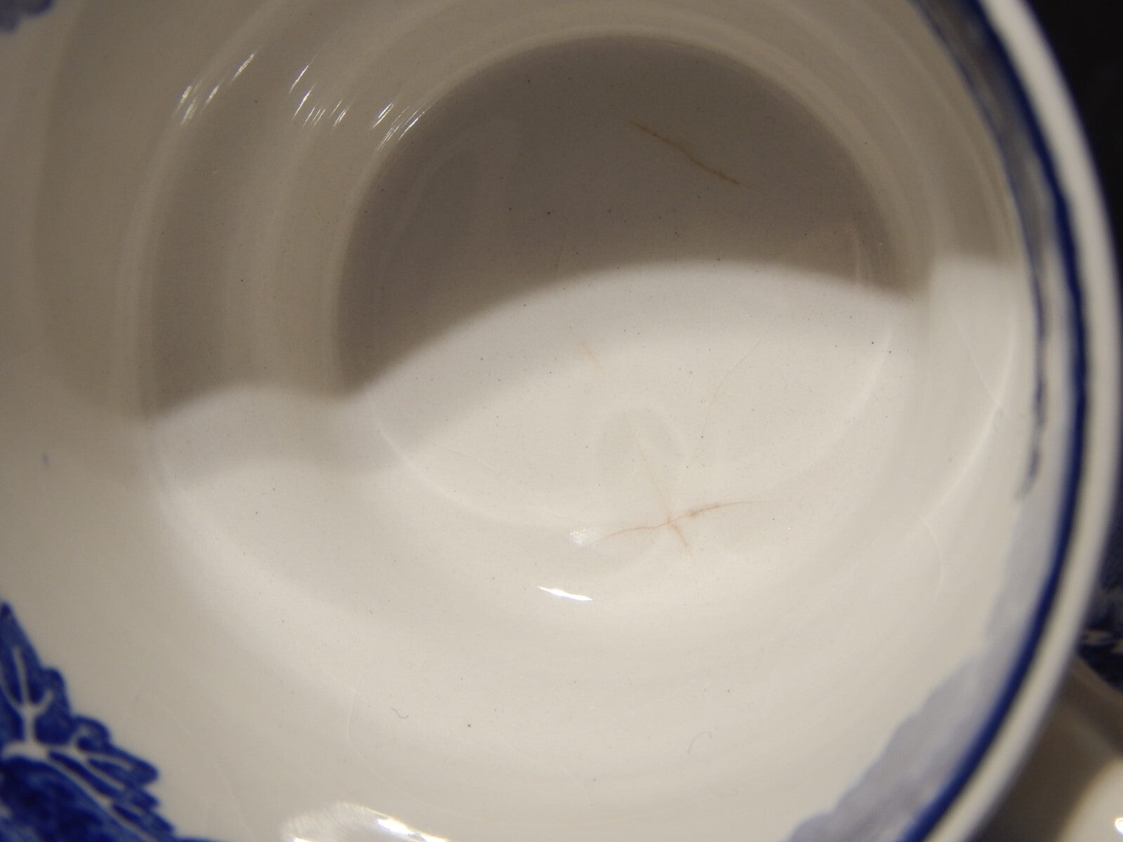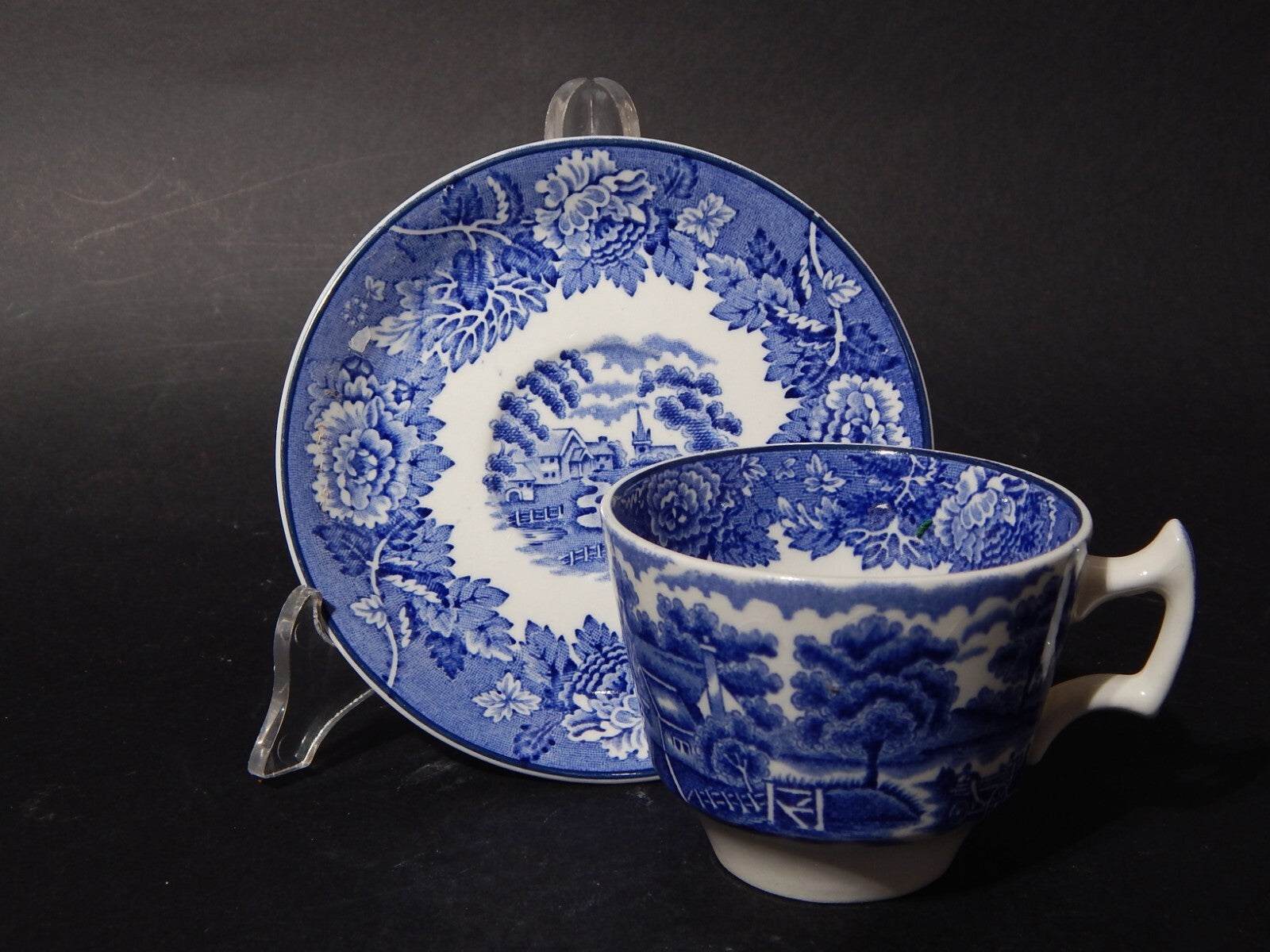 La tazza con decoro English Scenery blu misura 6 cm. di altezza e 8 cm. di diametro, il piattino 12,5 cm di diametro, come si può vedere dalle foto è presente un segno sul fondo della tazza