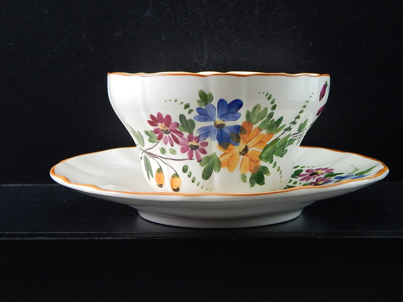 In questa inserzione viene presentata un antico raro set da colazione composto da tazza e piattino in ceramica bianca realizzata dalla manifattura Verbanum Stone di Laveno, il set è stato dipinto a mano in policromia e firmato da Elena 1934