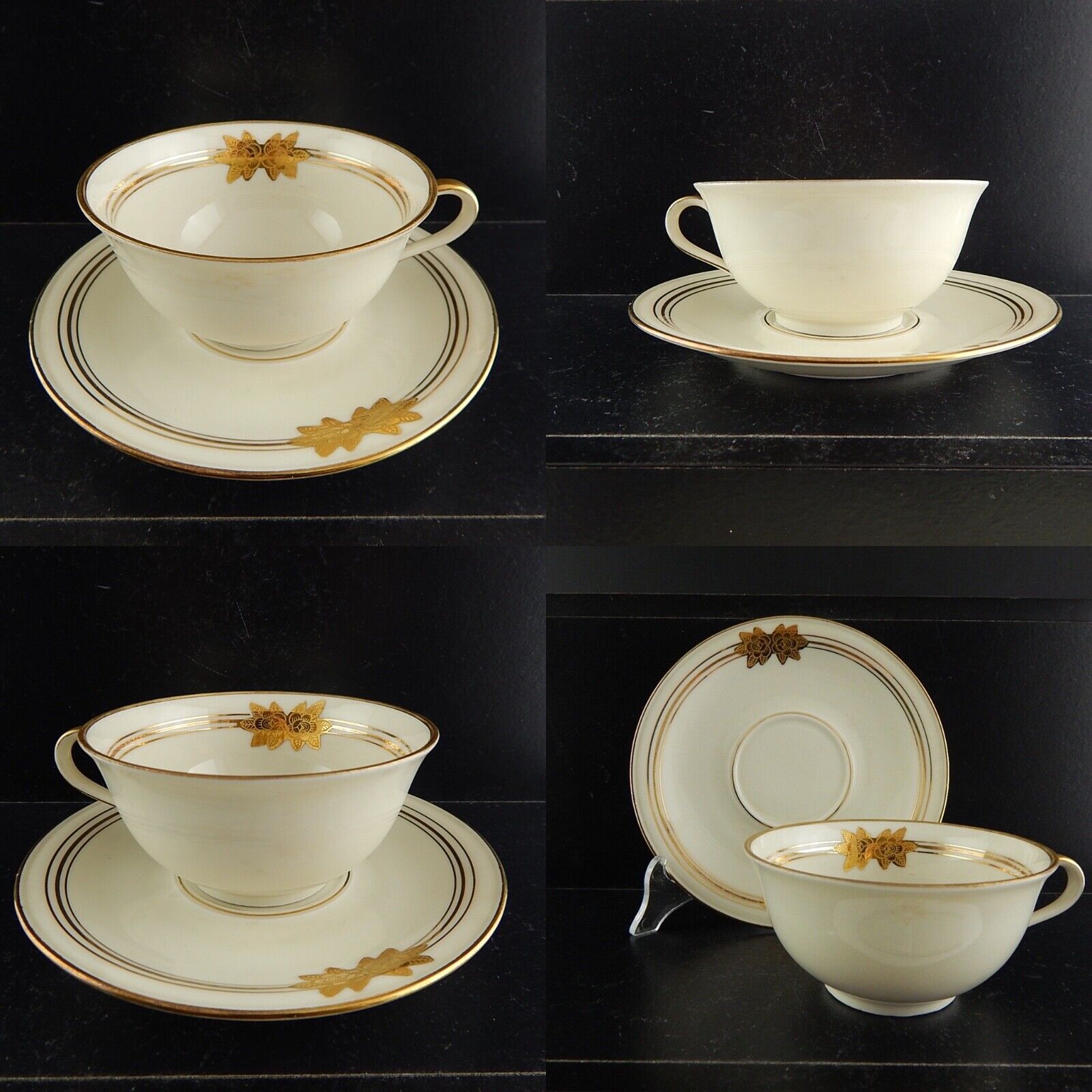 In questa inserzione viene presentata un'antica tazza da tè con relativo piattino realizzati dalla famosa Manifattura tedesca Oscar Schaller Bavaria negli anni trenta, come si evince dal marchio sotto la base. Il set è stato realizzato in porcellana color avorio e decorato con rose e profili in oro zecchino