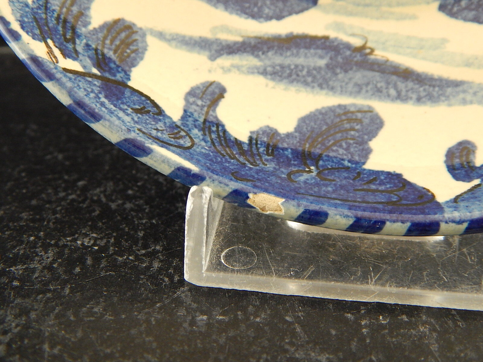 La tazza misura 10 cm di diametro e 5 cm di altezza, il piattino 15 cm di diametro, come si può notare dalle foto ha una minima scheggiatura sul bordo