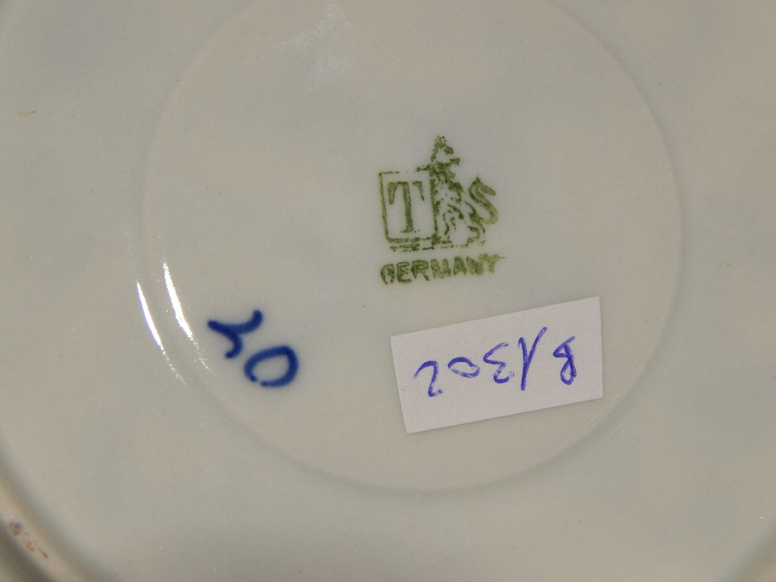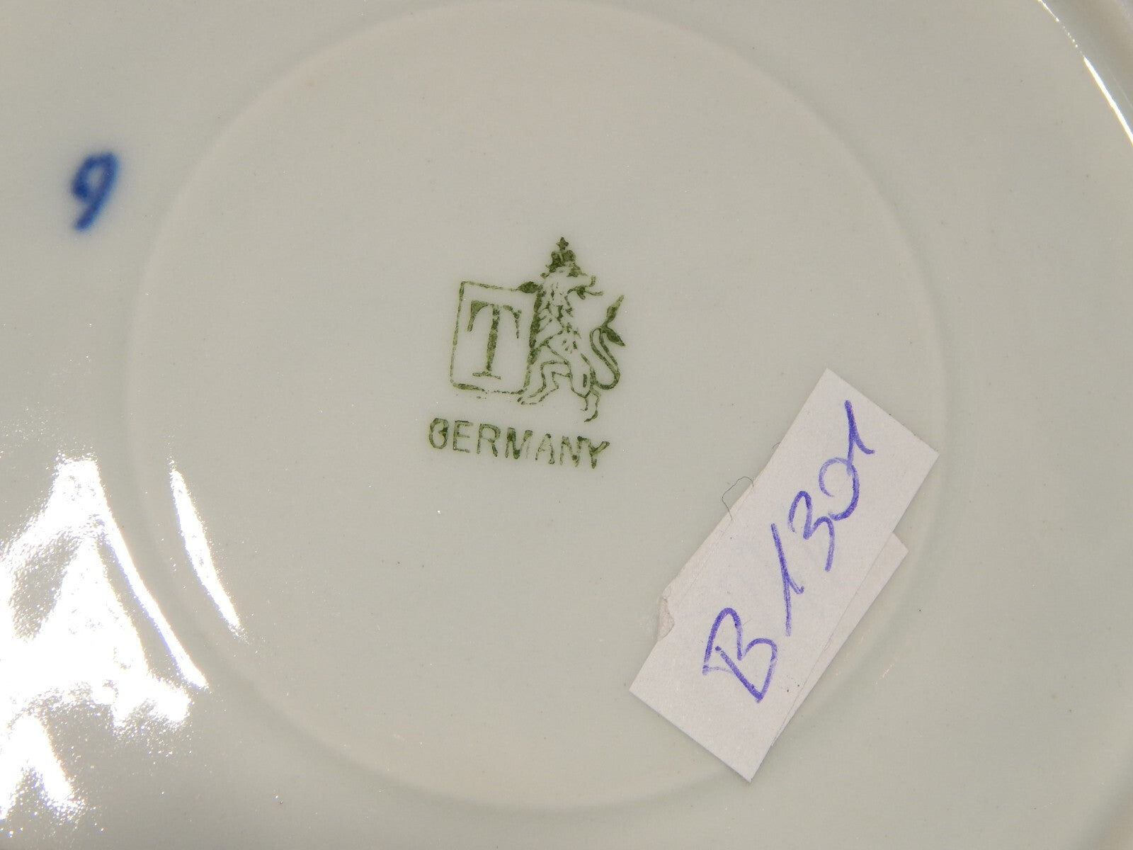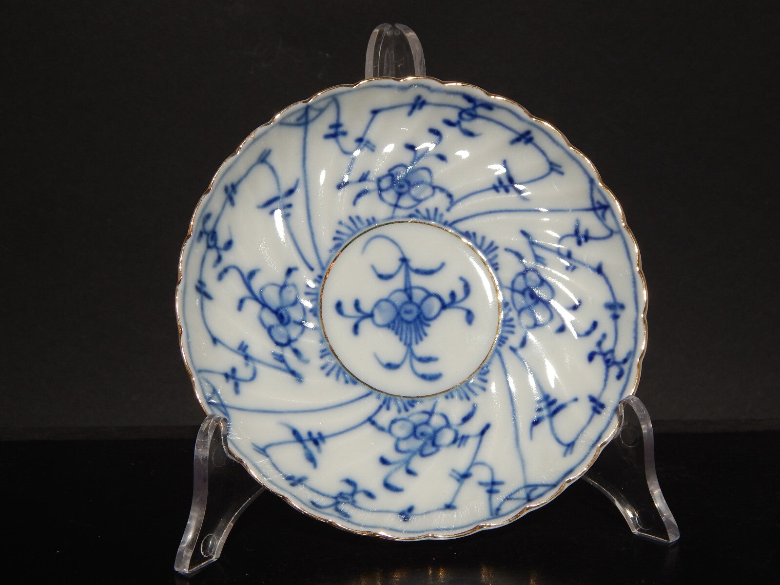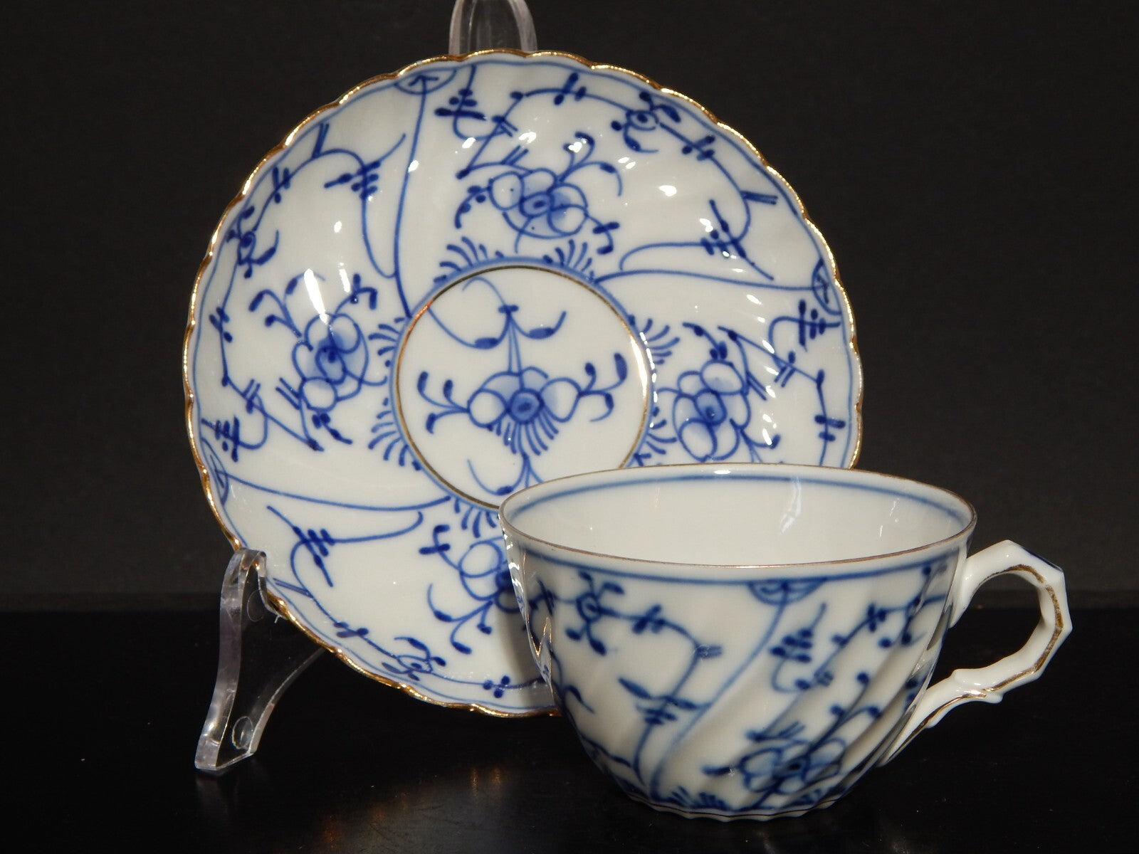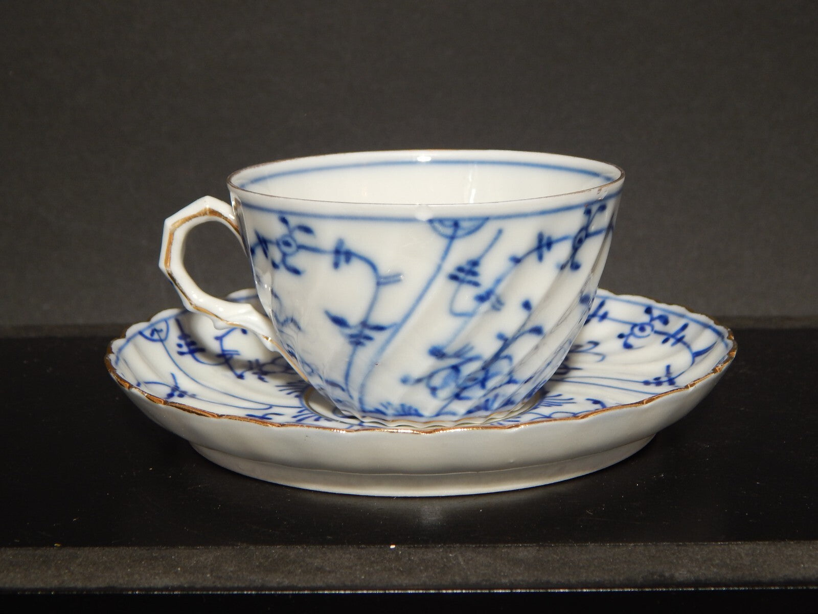 In questa inserzione viene presentata una tazza da tè realizzata dalla famosa Manifattura tedesca Royal Tettau nella prima metà del 900. La tazza con relativo piattino sono decorati a mano in blu cobalto nel famoso disegno Blue Fluted e rifiniti con profili in oro zecchino