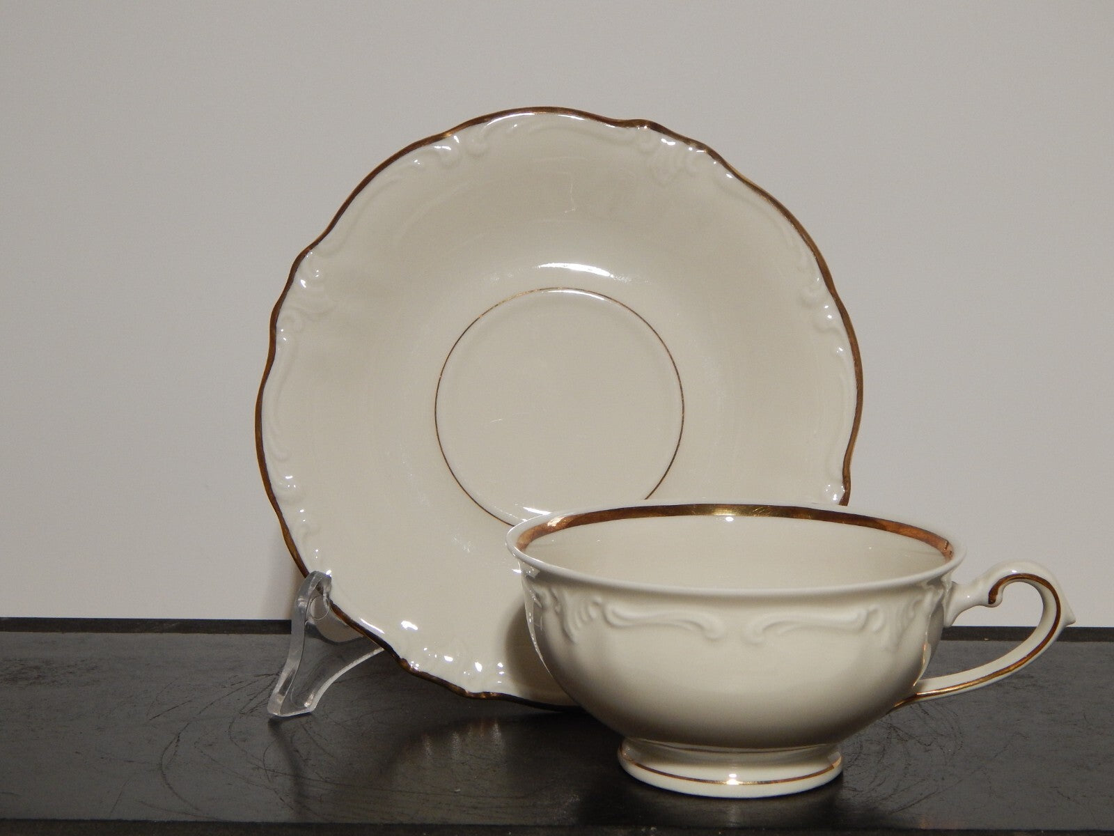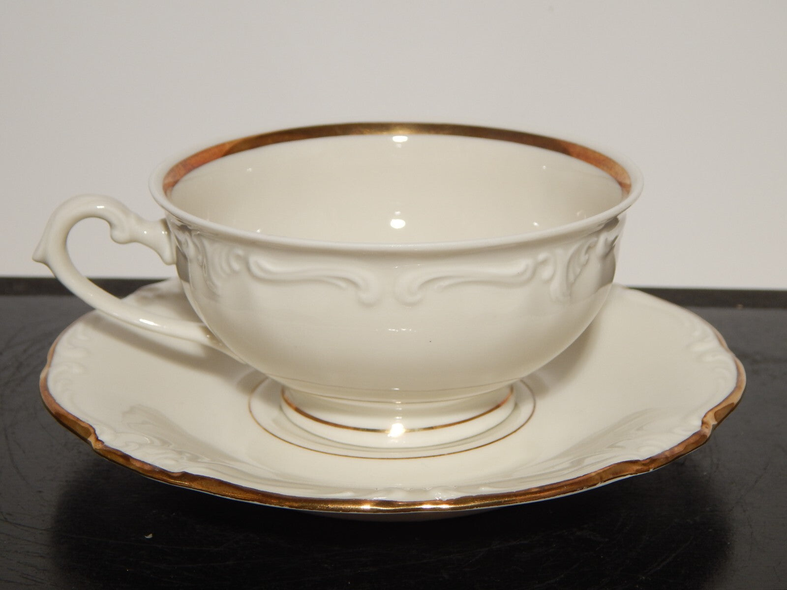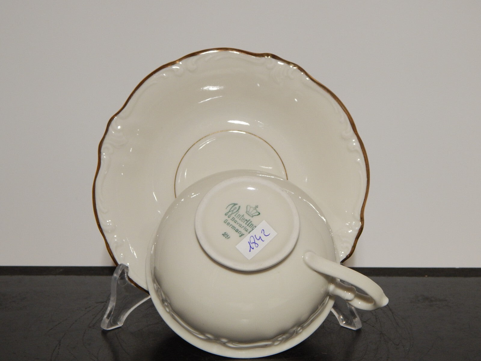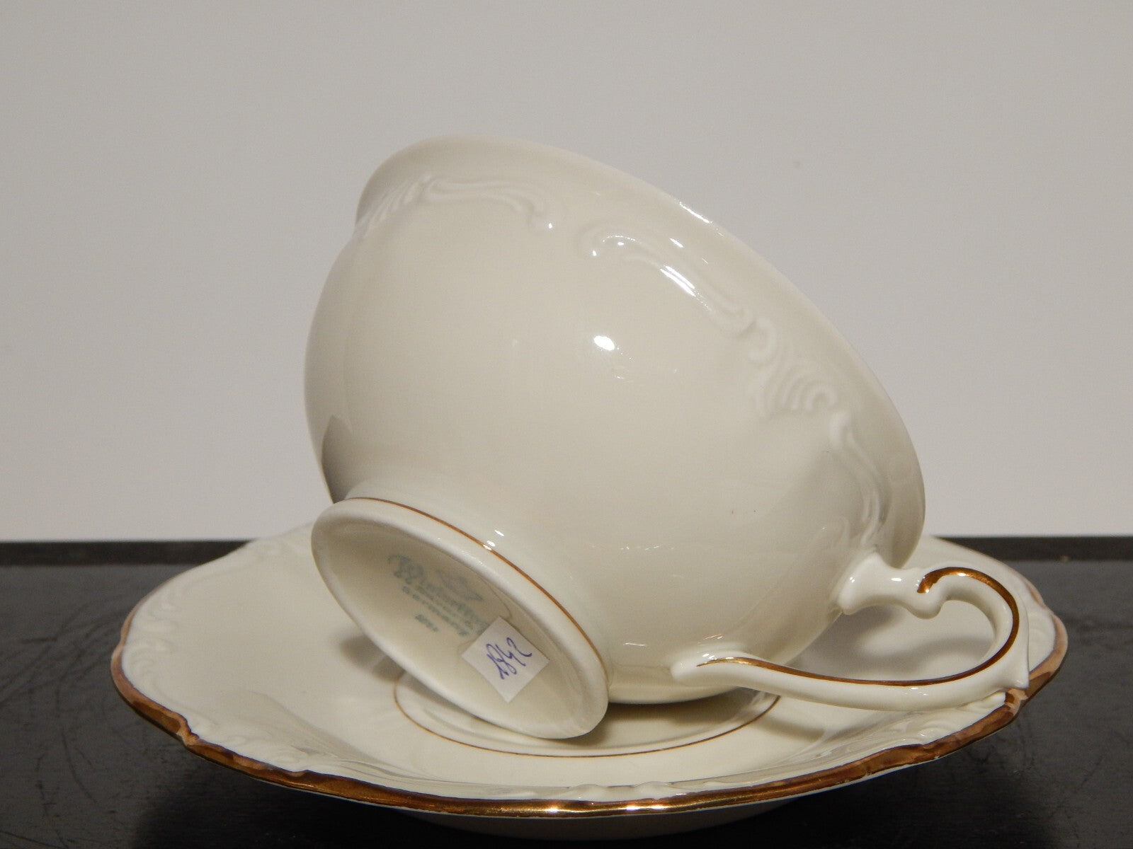 In questa inserzione viene presentata una tazza tè con relativo piattino modellata in stile rocaille in porcellana color avorio di altissima qualità e rifinita in oro zecchino. La tazza è stata realizzata dalla manifattura tedesca Bavaria Winterling nella prima metà del 900