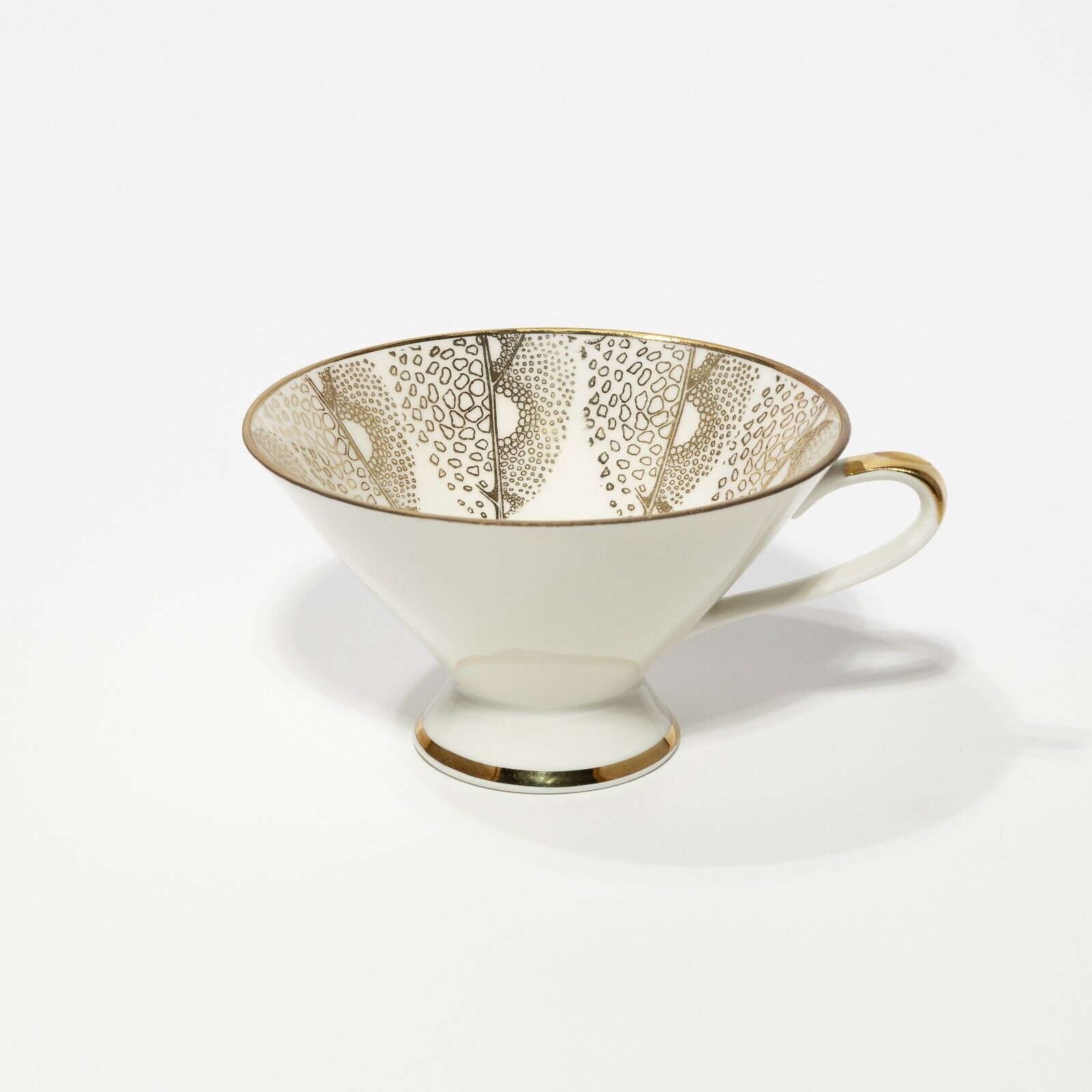 In questa inserzione viene presentata una tazza da tè realizzata dalla famosa Manifattura tedesca Oscar Schaller Bavaria negli anni trenta, come si evince dal marchio sotto la base. La tazza realizzata in porcellana color avorio, è stata decorata in oro zecchino e con un disegno floreale all'interno sul fondo della tazza