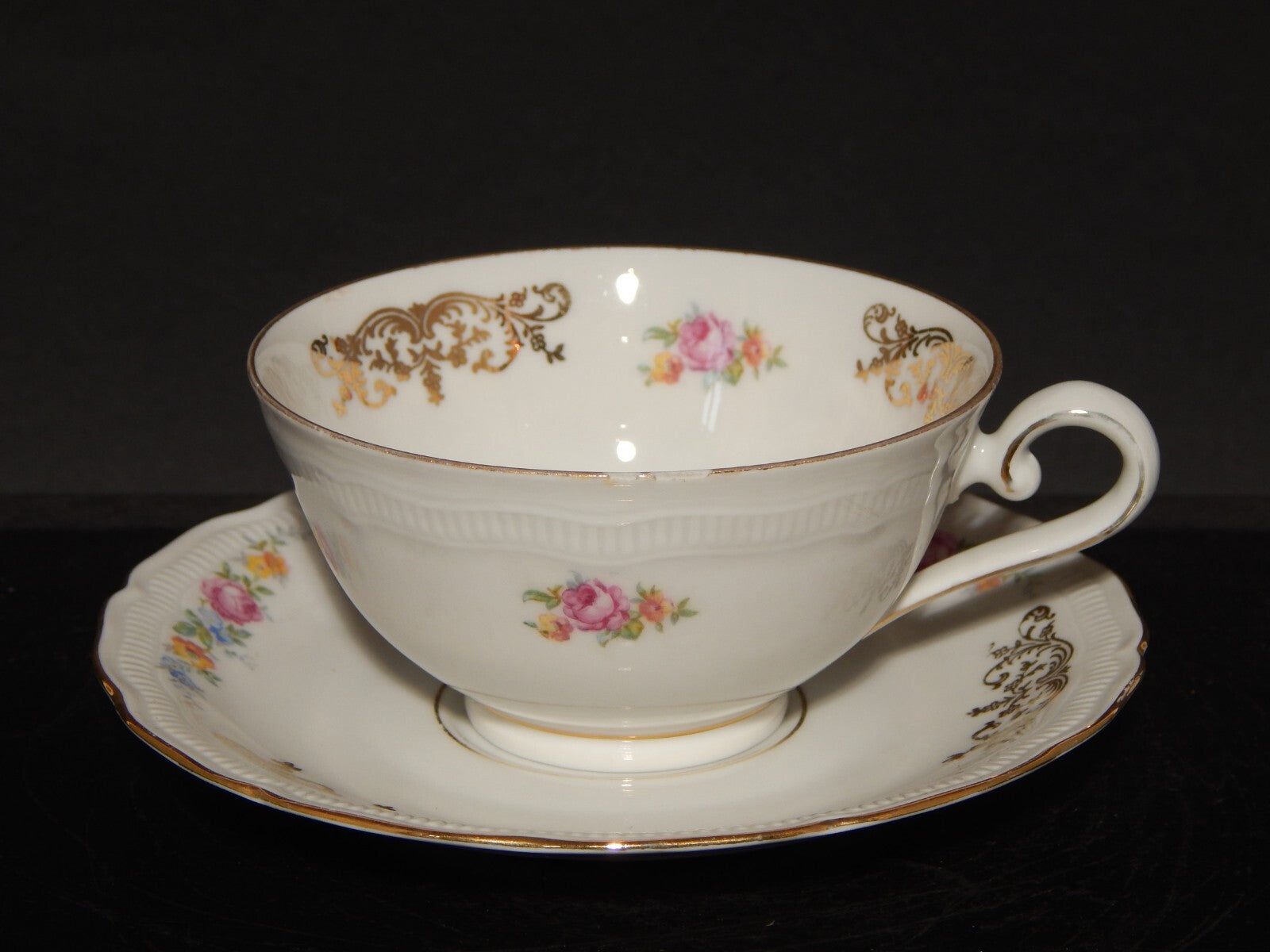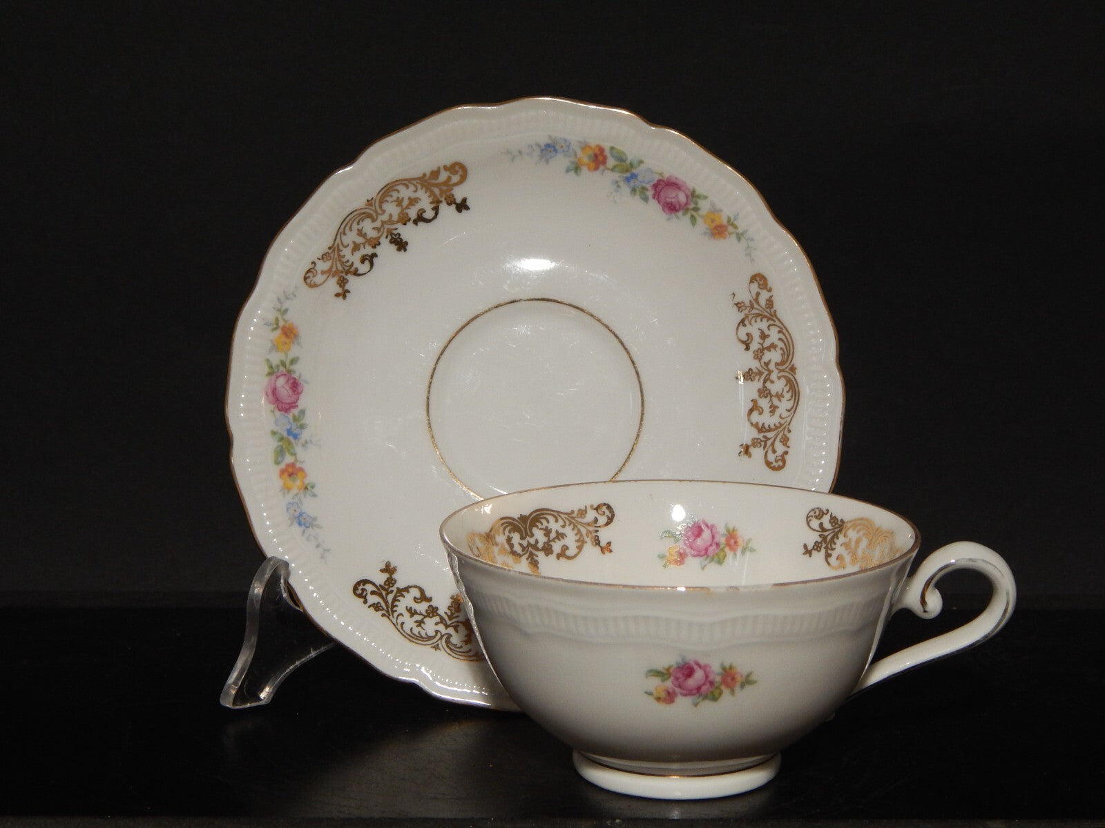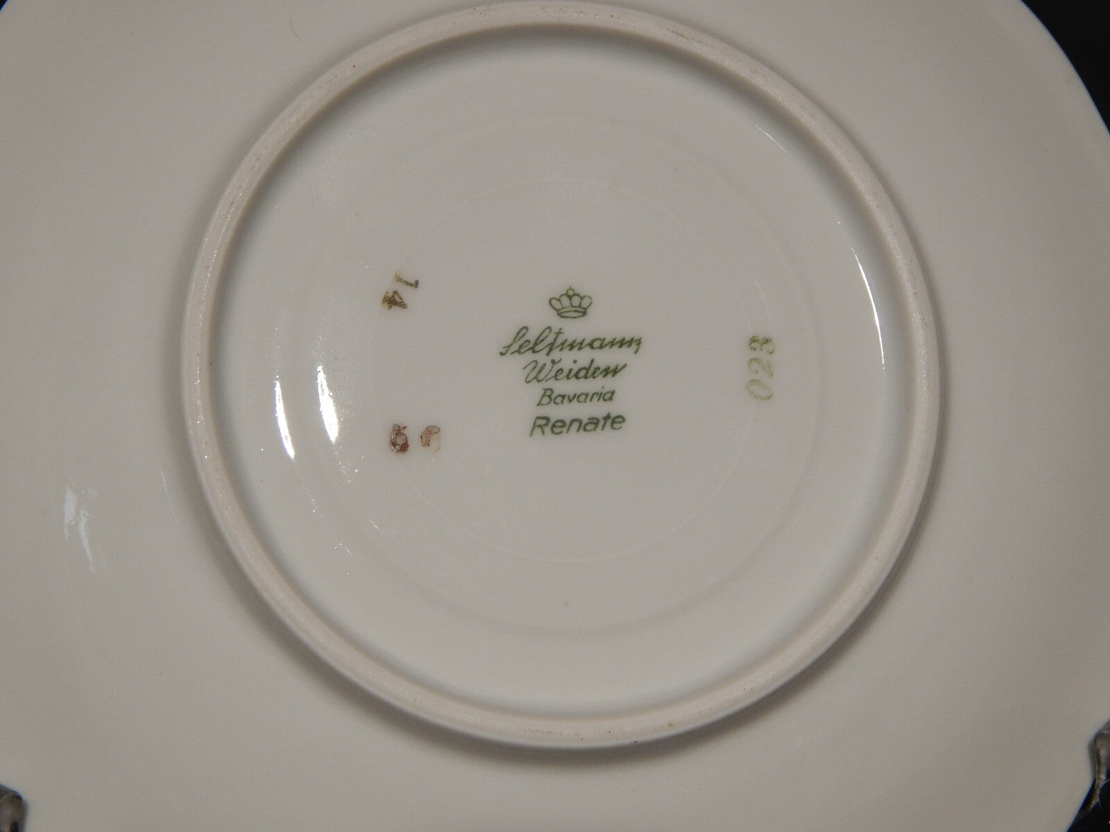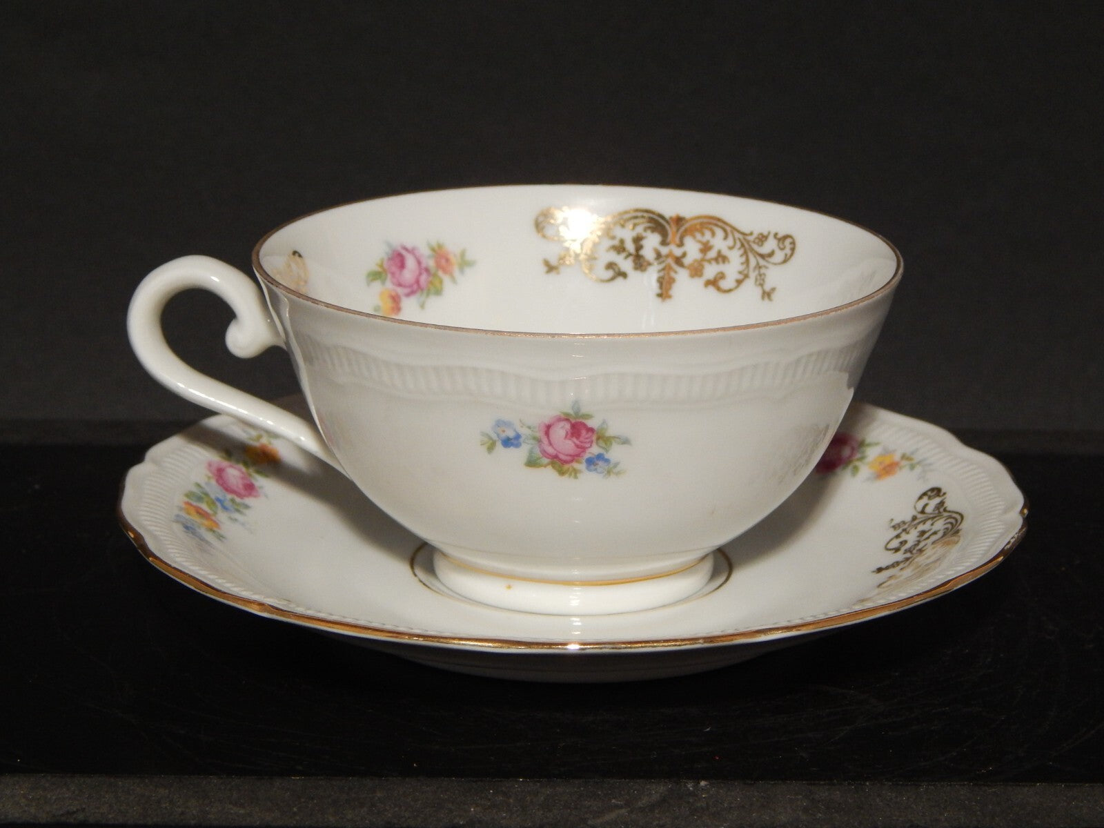 In questa inserzione viene presentata una tazza antica con piattino, realizzata negli anni '40 dalla manifattura tedesca Bavaria Seltmann Weiden-E nel modello Renate in porcellana bianca con arabeschi in oro zecchino e fiori policromi