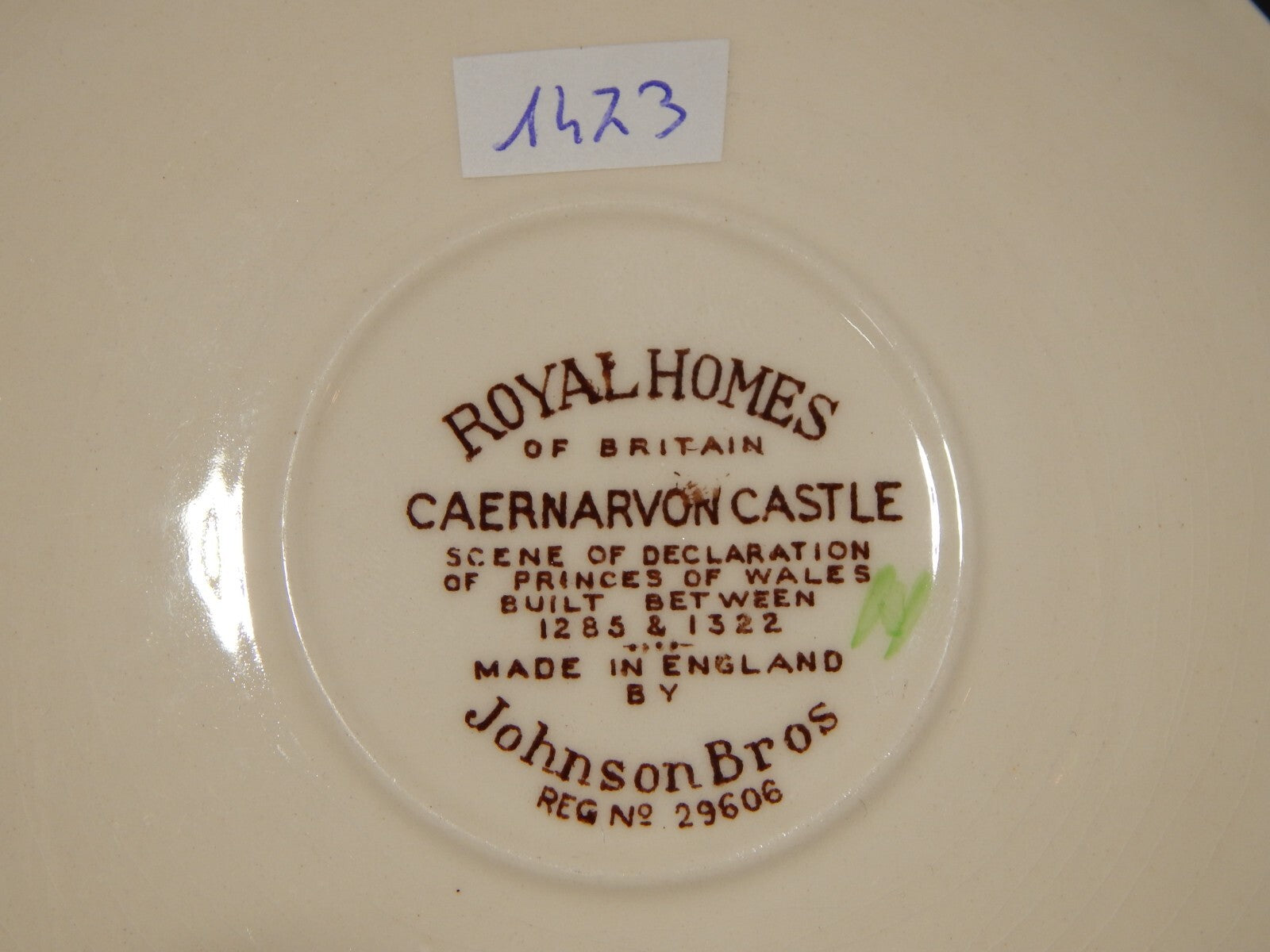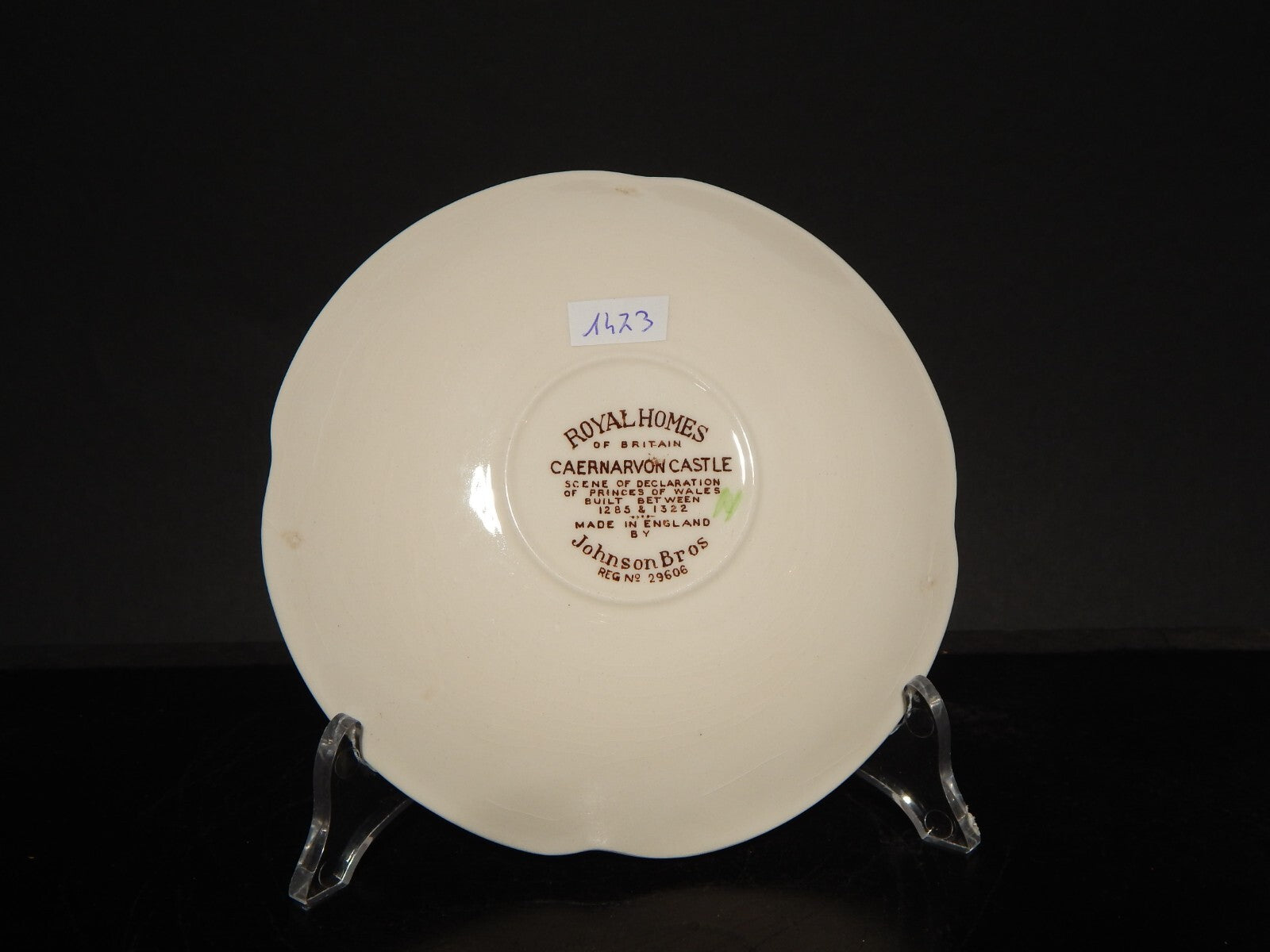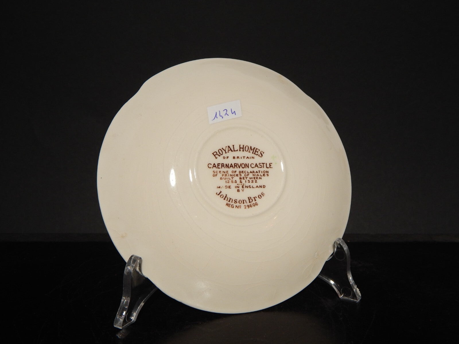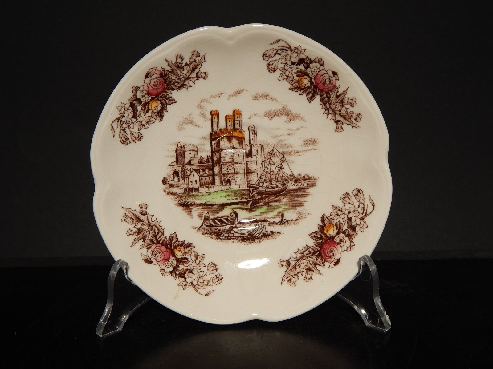 La tazza stampata a mano, raffigurante Caernarvon Castle misura 9 cm di diametro e 6 cm di altezza, il piattino misura 14,5 cm di diametro, è presente una leggera cavillatura
