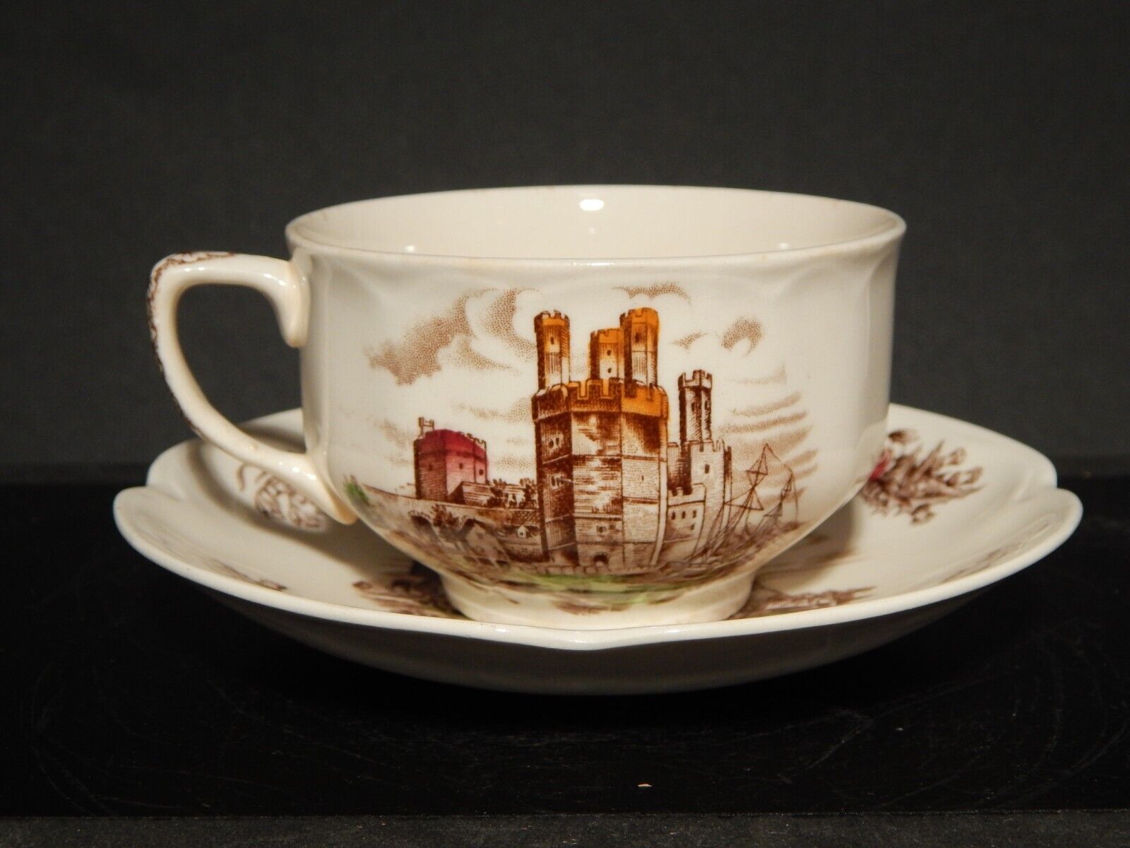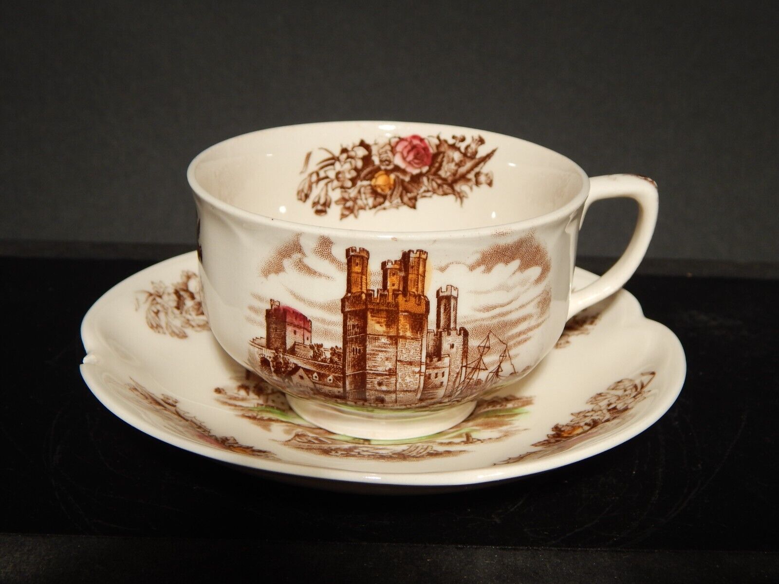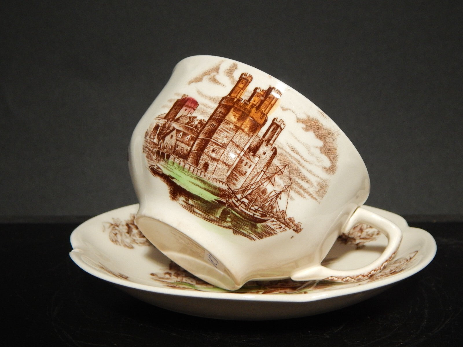 La tazza stampata a mano, raffigurante Caernarvon Castle misura 9 cm di diametro e 6 cm di altezza, il piattino misura 14,5 cm di diametro