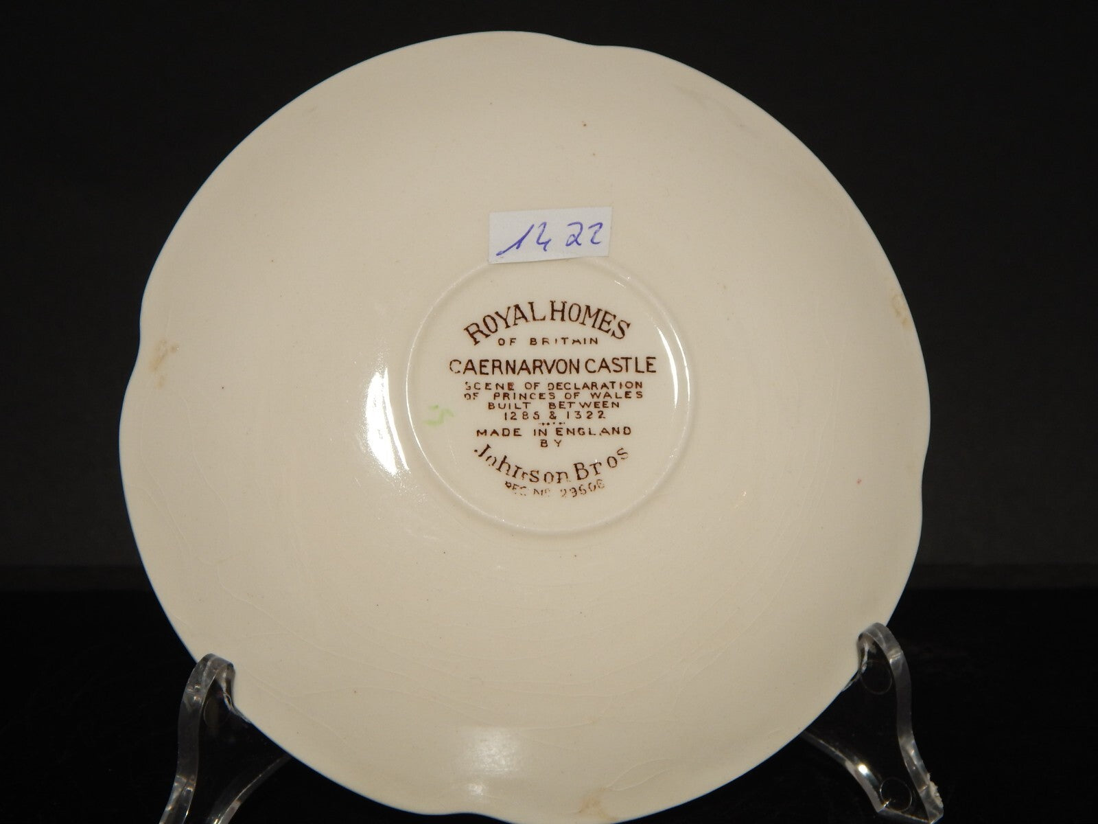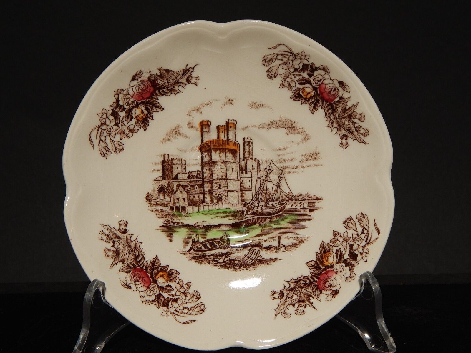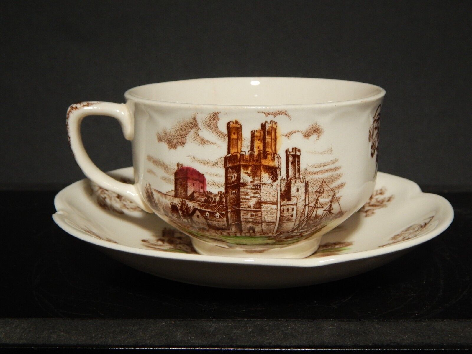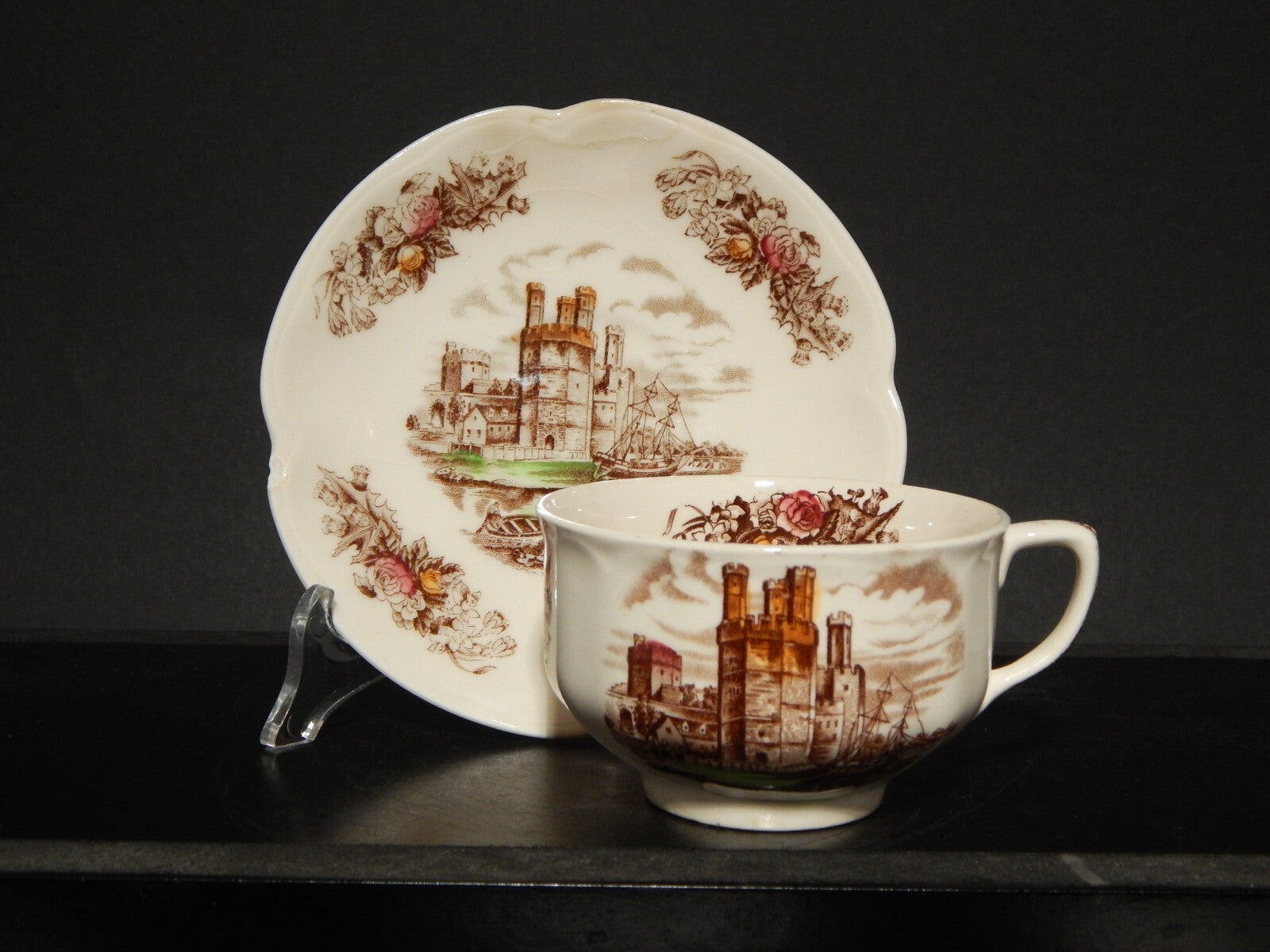 La tazza stampata a mano, raffigurante Caernarvon Castle misura 9 cm di diametro e 6 cm di altezza, il piattino misura 14,5 cm di diametro
