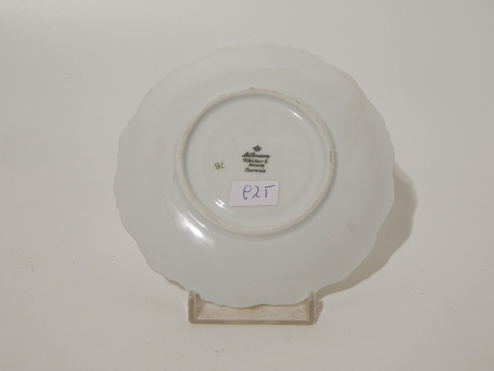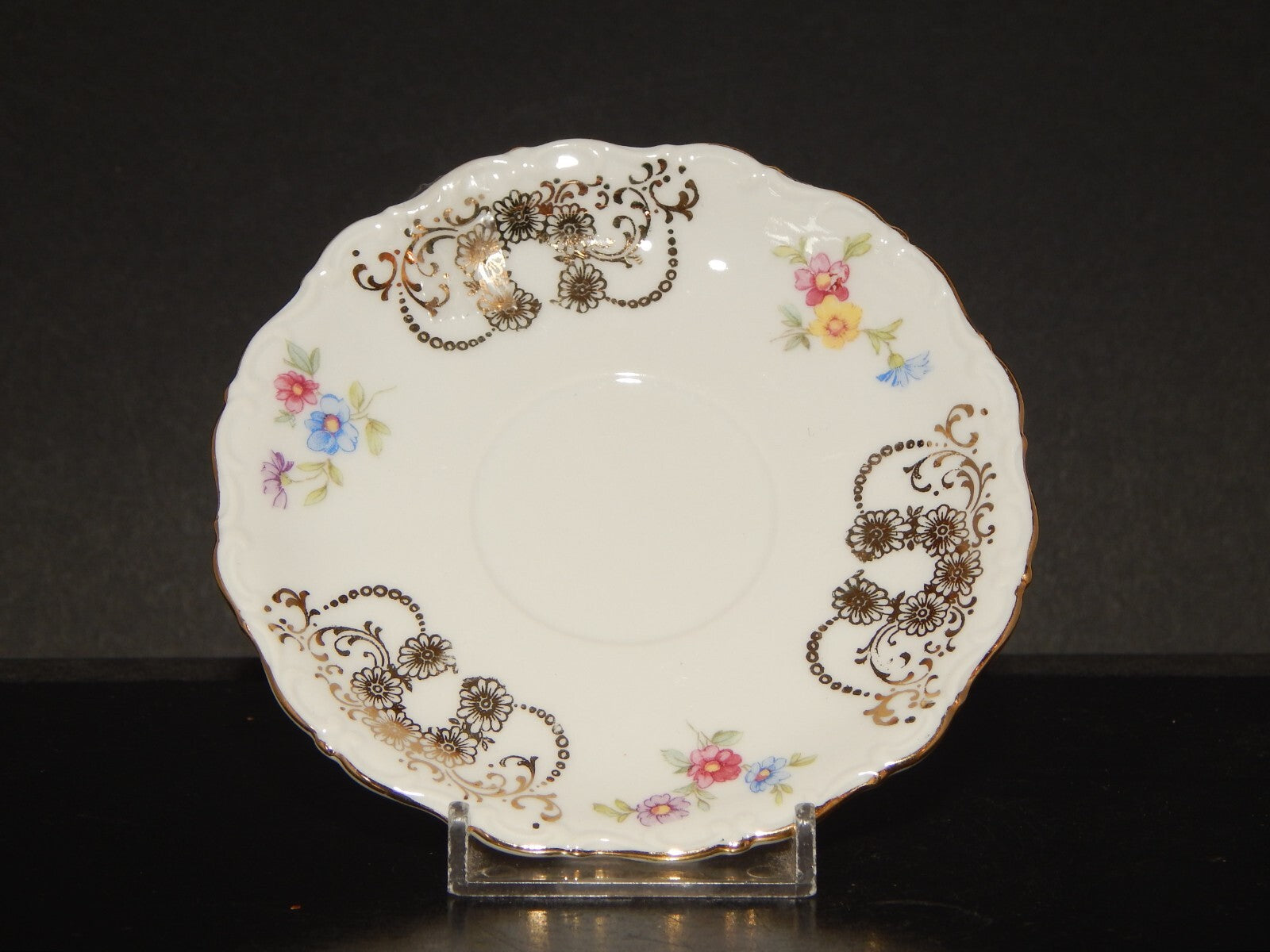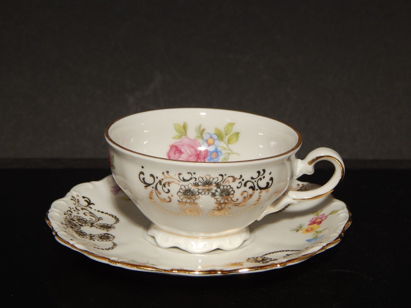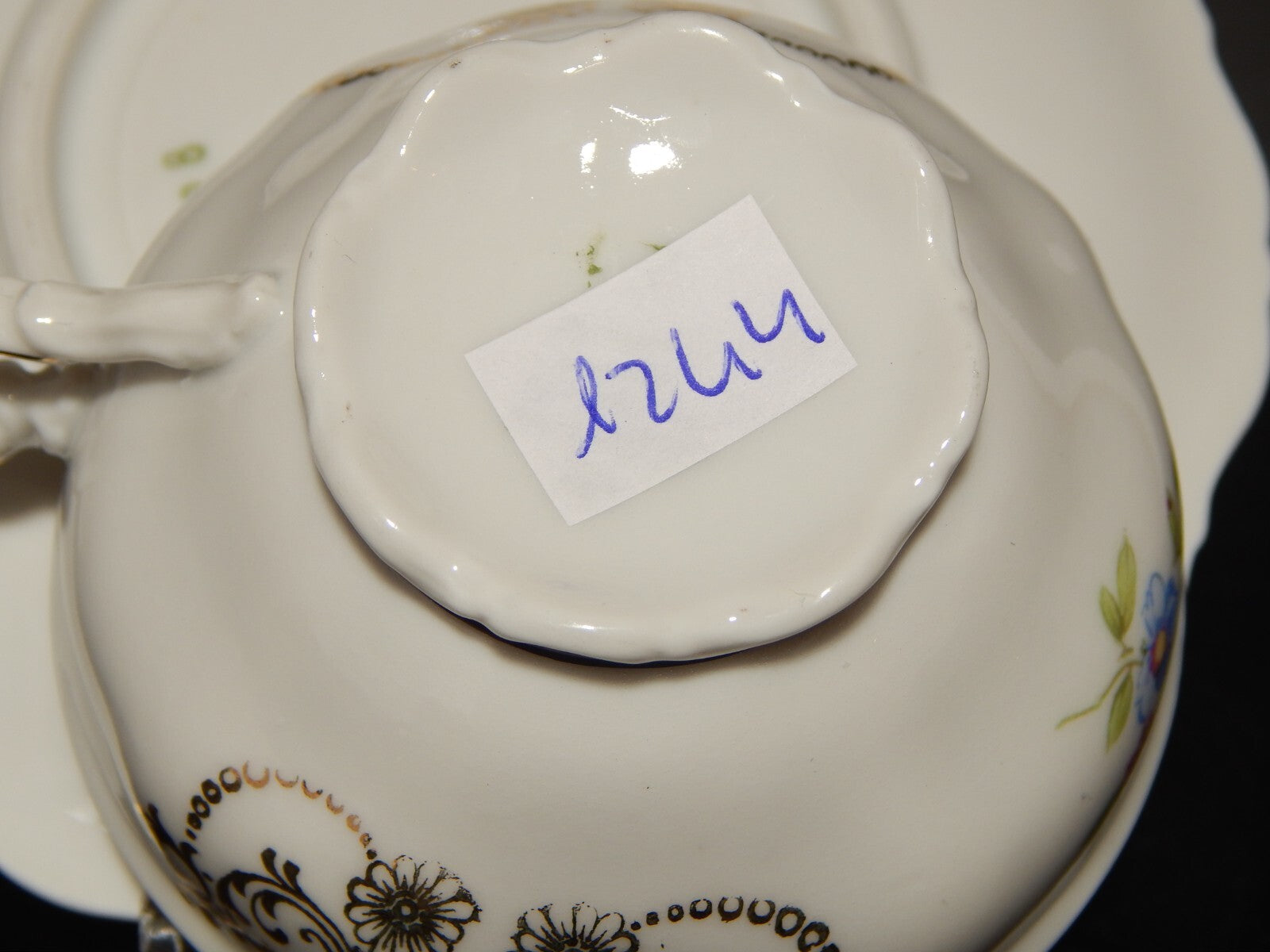 In questa inserzione viene presentata un'antica tazzina con relativo piattino in porcellana bianca con decori floreali e arabeschi in oro zecchino realizzata negli anni '40 dalla manifattura tedesca Bavaria Seltmann Weiden nel modello Theresia