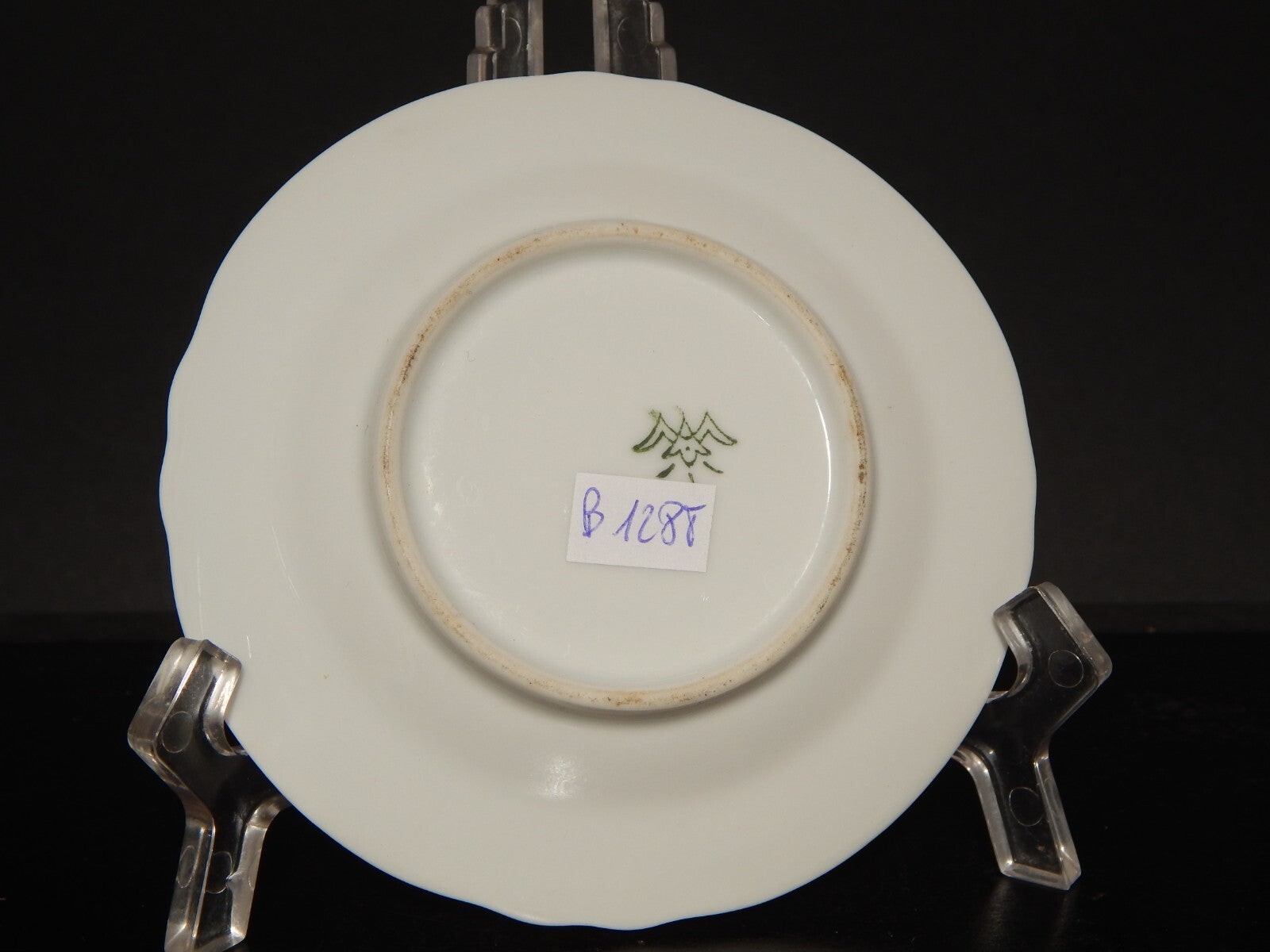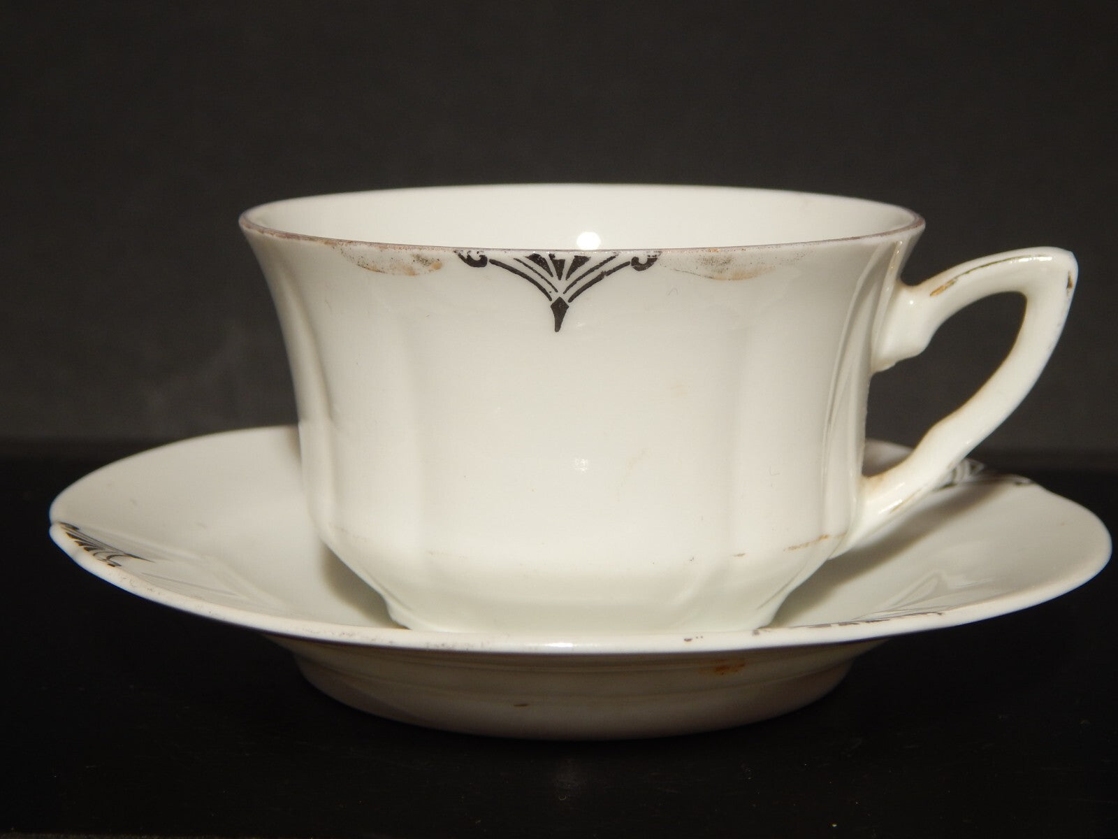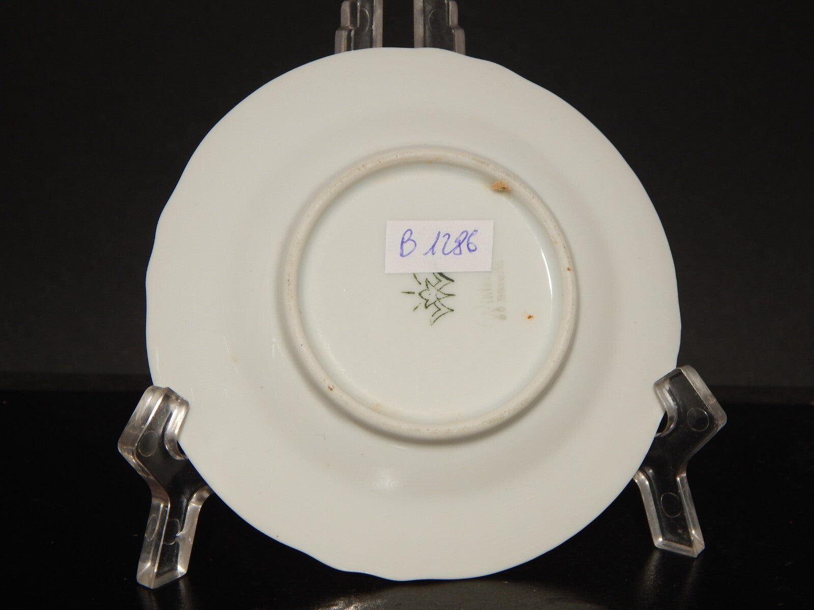 La tazzina misura 4 cm di altezza e 7 cm di diametro, il piattino misura 11 cm di diametro, pur essendo priva di scheggiature e filature presenta qualche segno del tempo