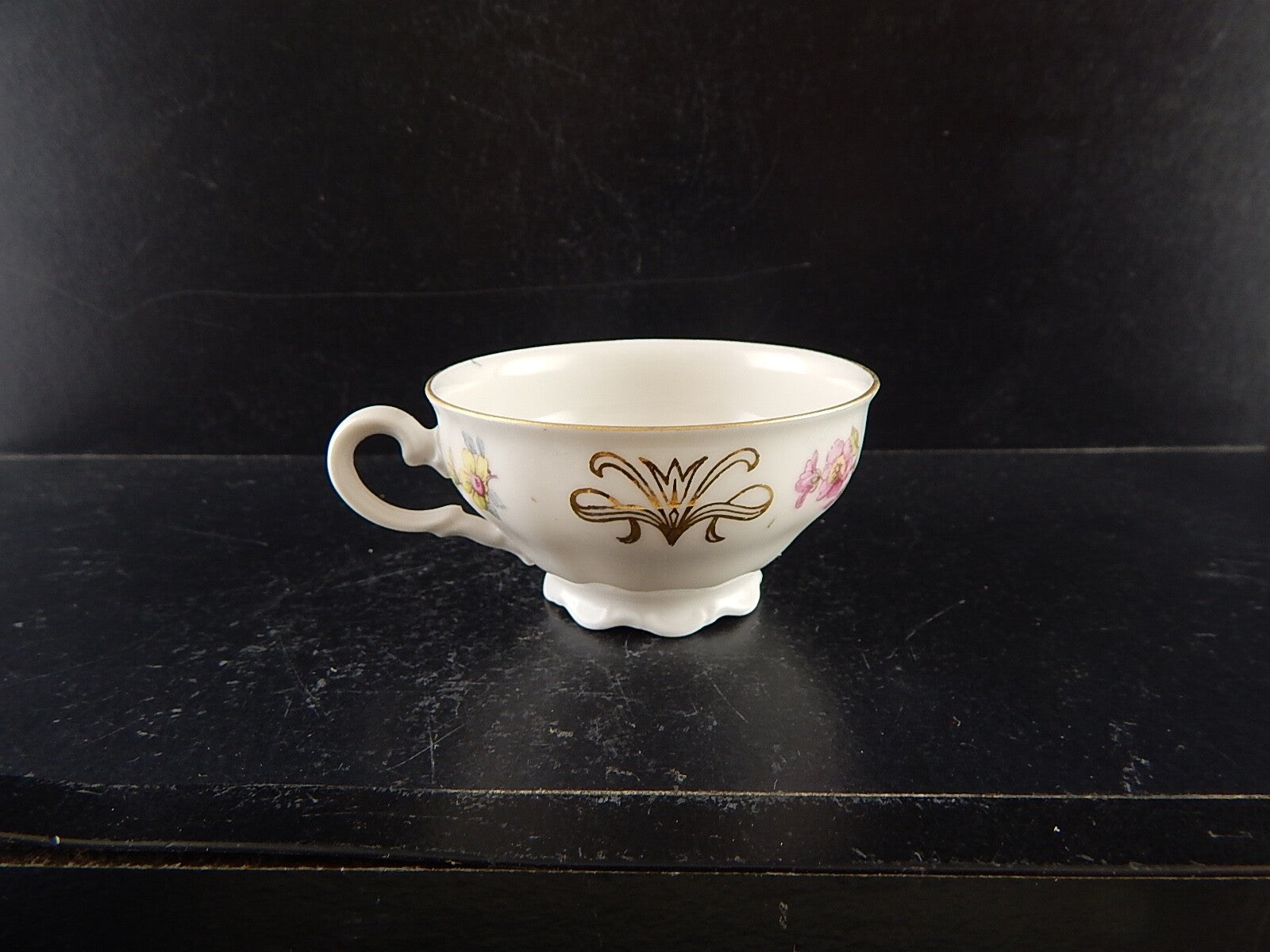 In questa inserzione viene presentata una tazzina antica in porcellana bianca con decori floreali e arabeschi in oro zecchino realizzata negli anni '40 dalla manifattura tedesca Bavaria Seltmann Weiden-E nel modello Theresia
