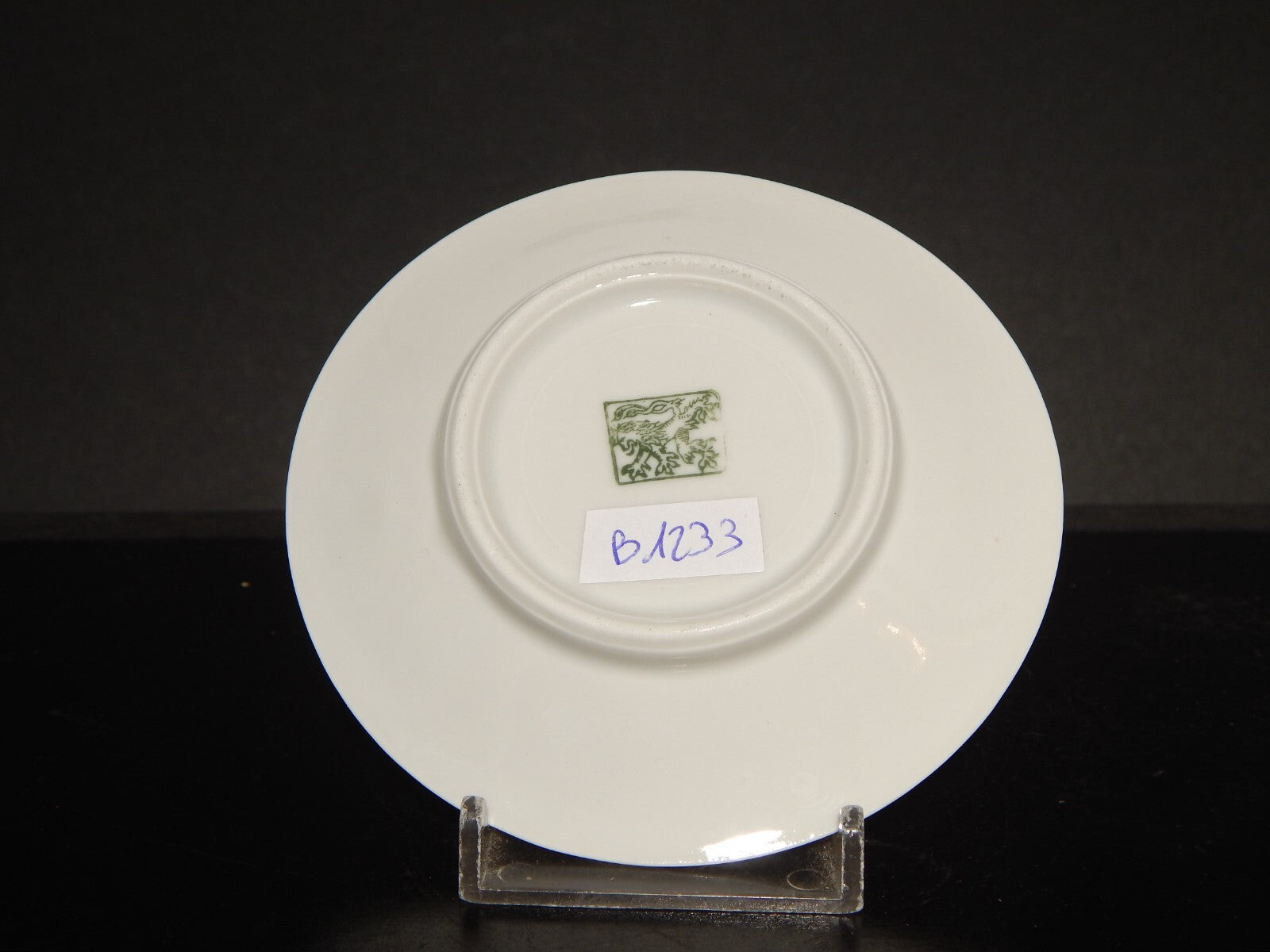 La tazzina di porcellana di ottima qualità reca un marchio che non siamo riusciti a identificare, sappiamo però che il decoro è stato usato sia dalla manifattura Richard Ginori che dalla manifattura tedesca Thomas appartenente al gruppo Rosenthal