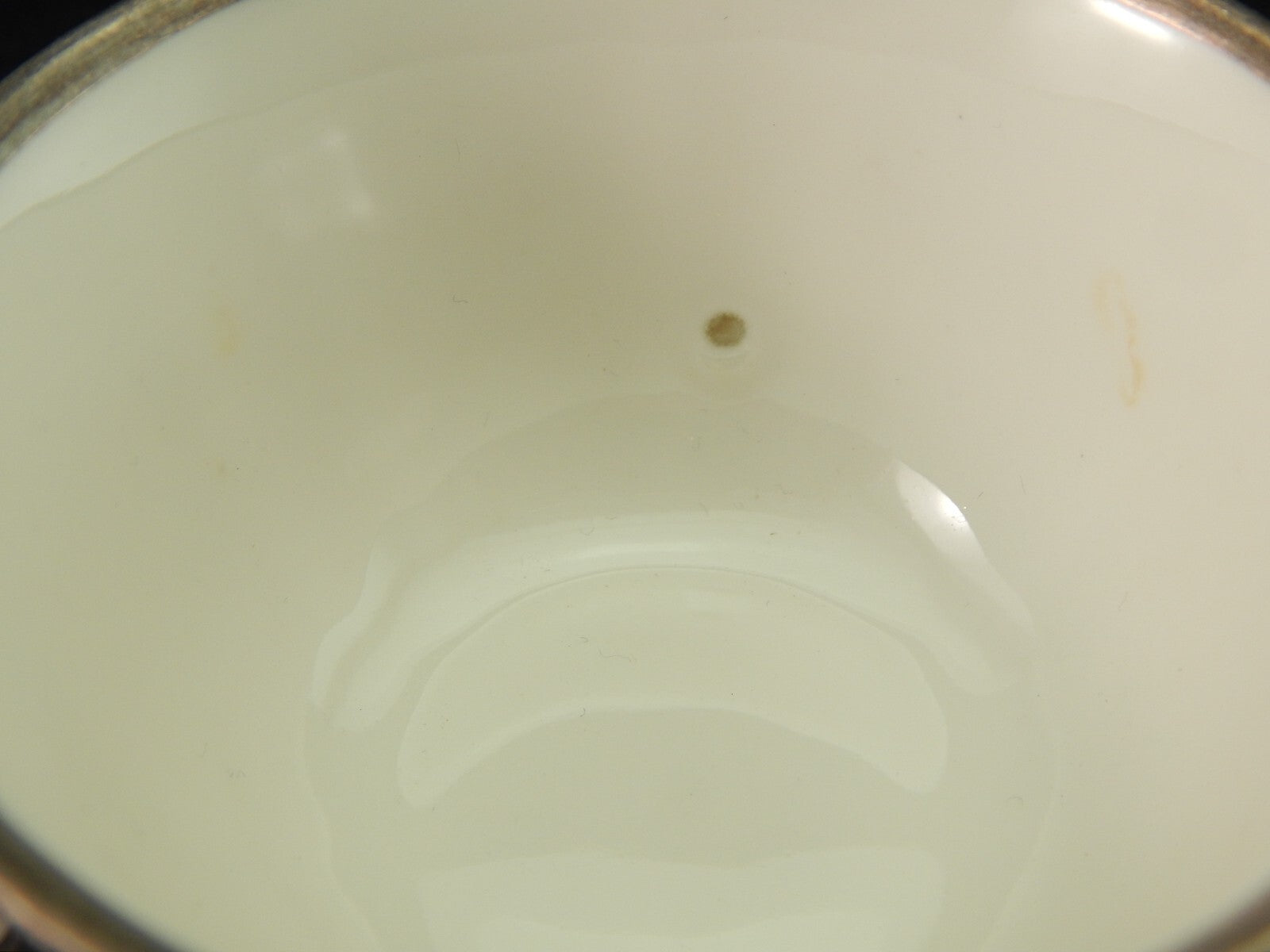 La tazzina con piattino realizzati in porcellana bianca sono stati decorati a mano con argento 925, come si può vedere dalle foto presenta una macchia grigia all'interno, probabilmente una goccia d'argento caduta in fase di decorazione