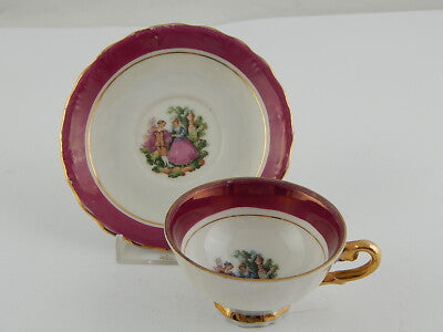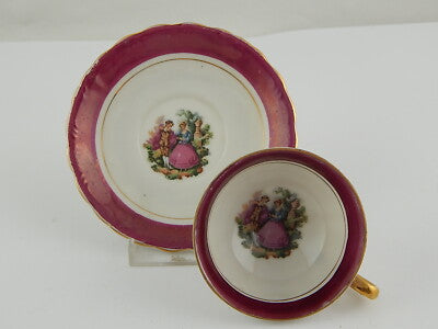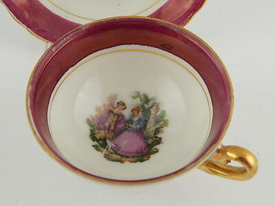 In questa inserzione viene presentata una tazzina con il suo piattino di porcellana, il decoro con scena galante policromo dipinto a mano è rifinito in oro zecchino