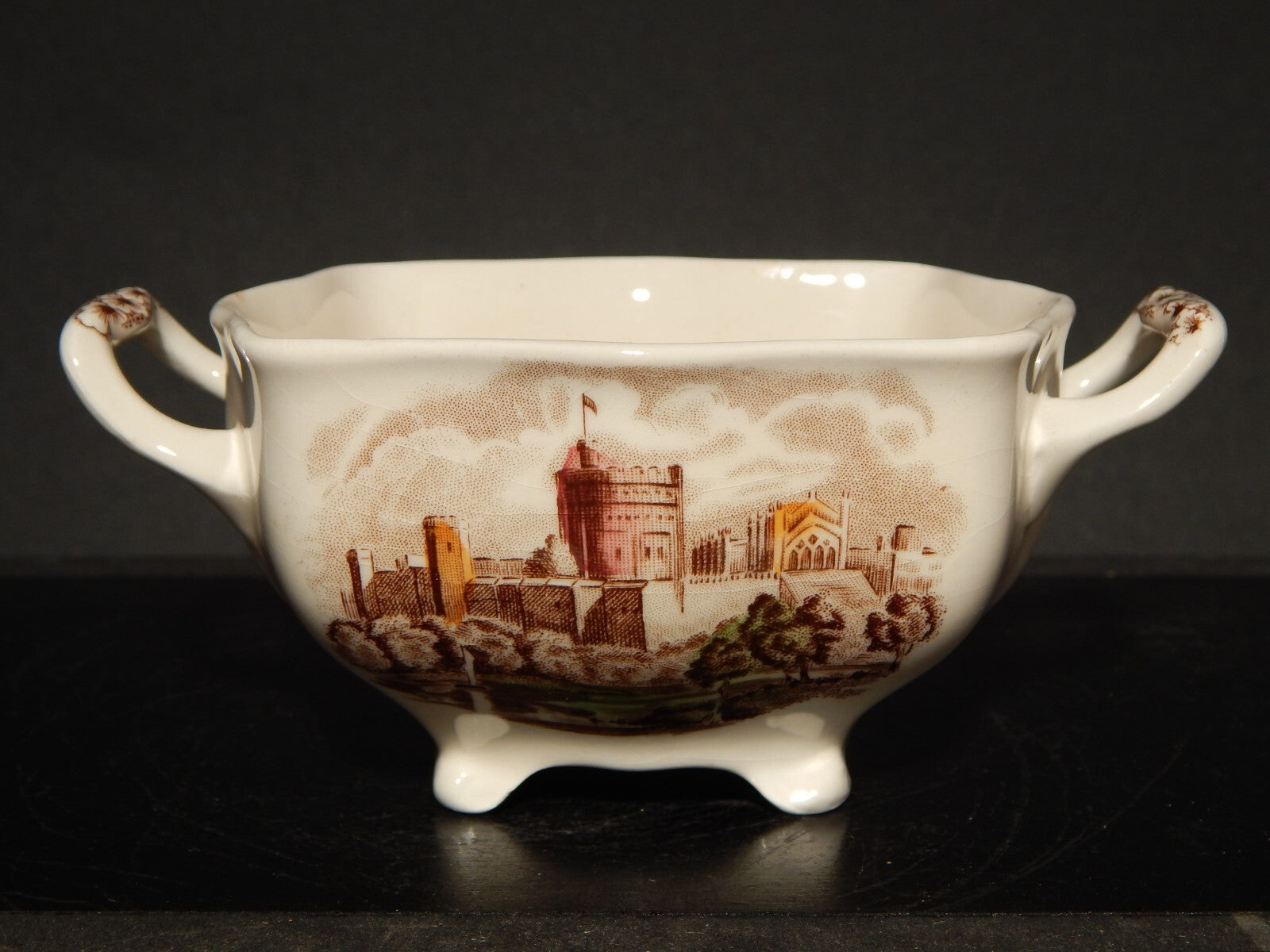 La zuccheriera stampata a mano, raffigurante Windsor Castle misura 11 x 10 cm e 6,5 cm di altezza, 15,5 cm da manico a manico, presenta una leggera cavillatura