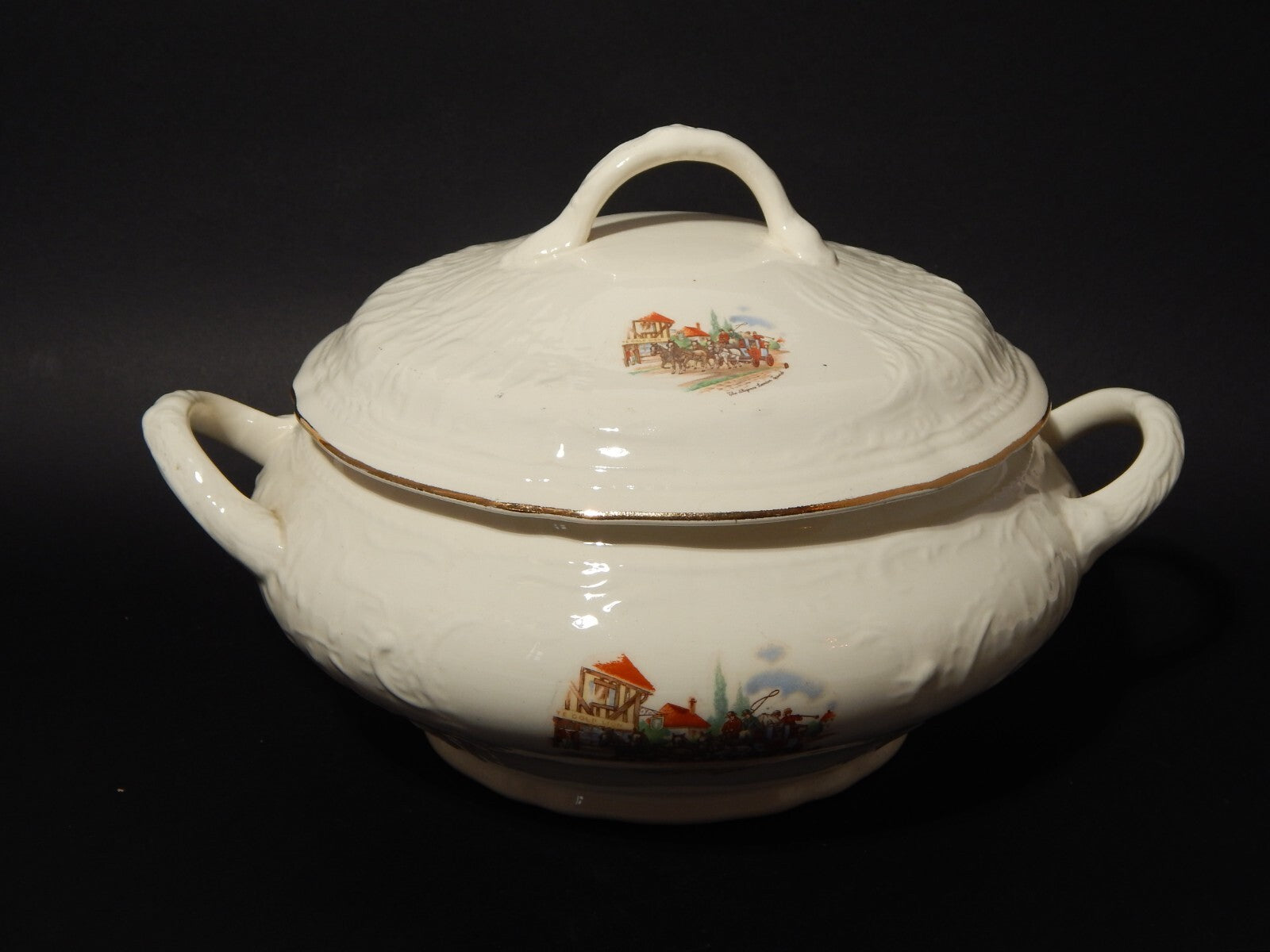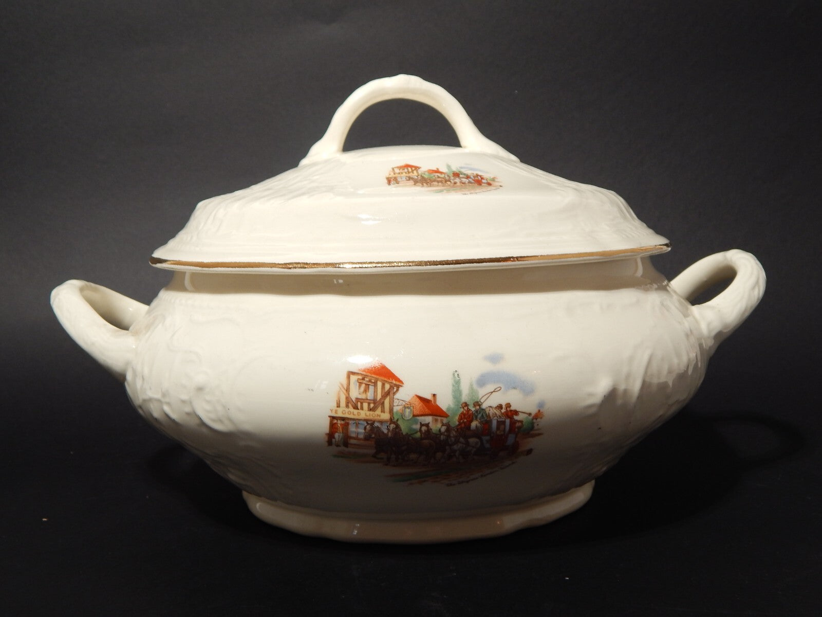ANTICA ZUPPIERA CENTROTAVOLA CERAMICA LAVENO 1856 THE DILIGENCE LONDON IPSWICH