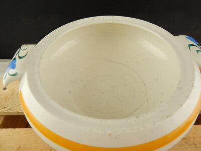 Il design e decoro del centrotavola è attribuibile a Gio’ Ponti, è dipinto a mano e misura 30 cm. da manico a manico e 17 cm di altezza con il coperchio