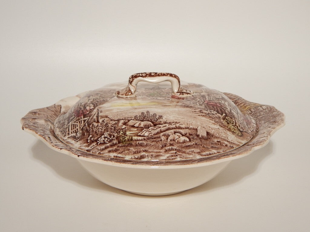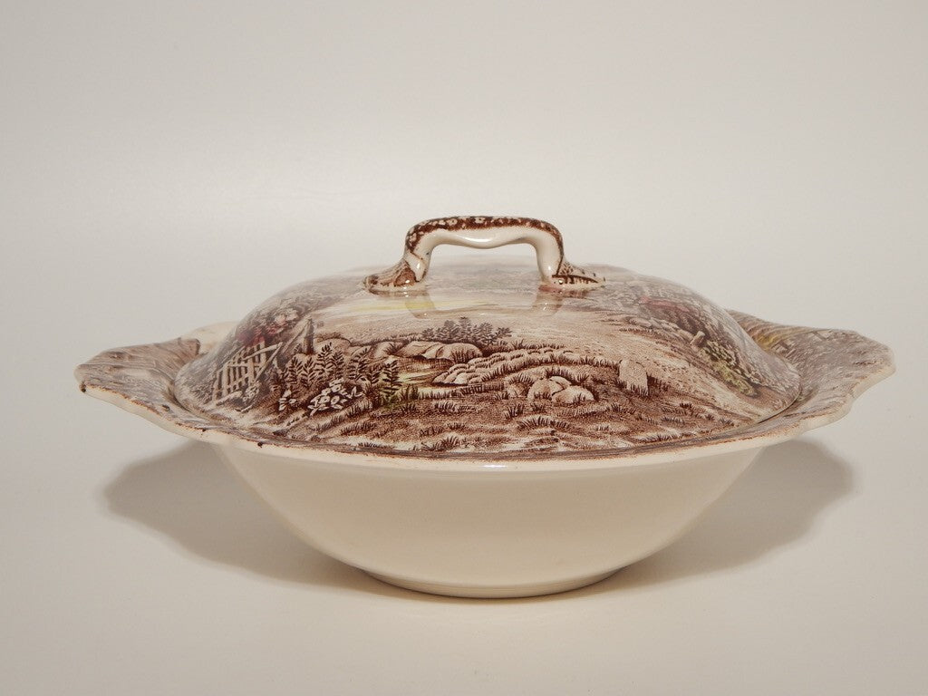 In questa inserzione viene presentata un'antica legumiera o zuppiera in semi porcellana inglese della manifattura Johnson Bros nel decoro stampato a mano Olde English Countryside