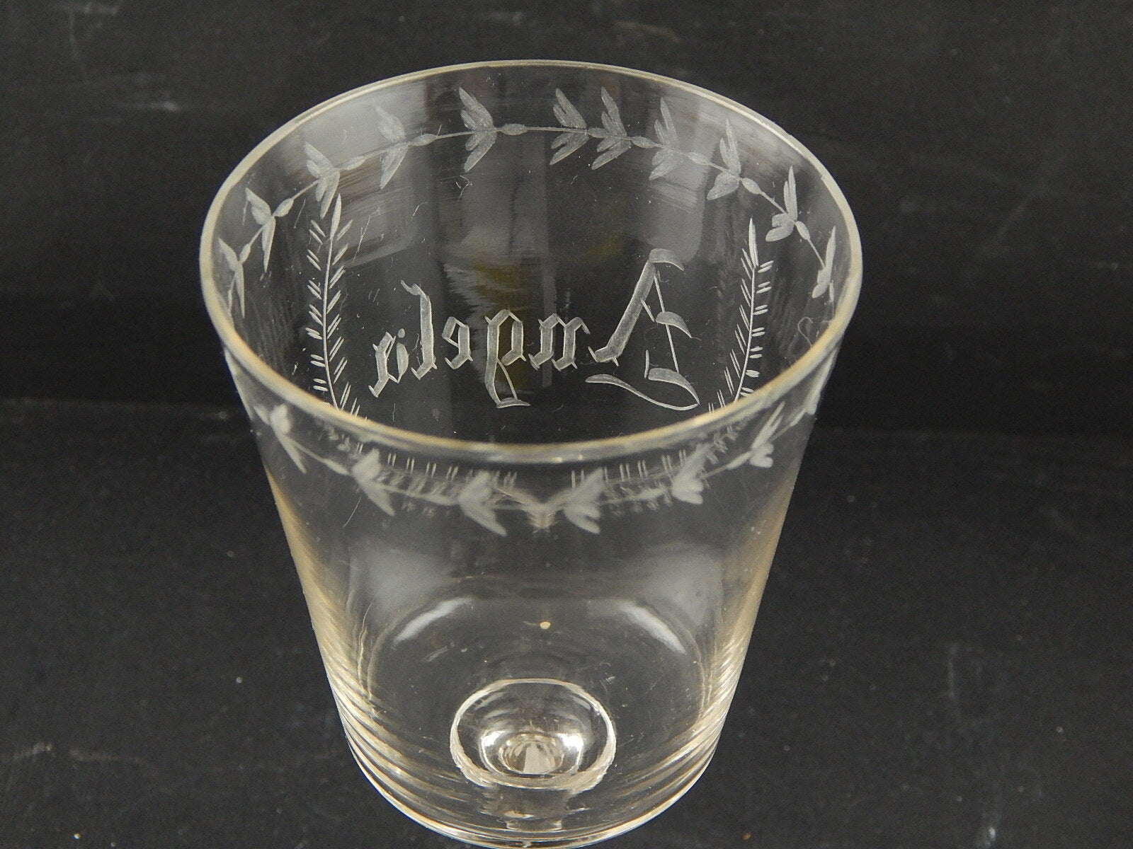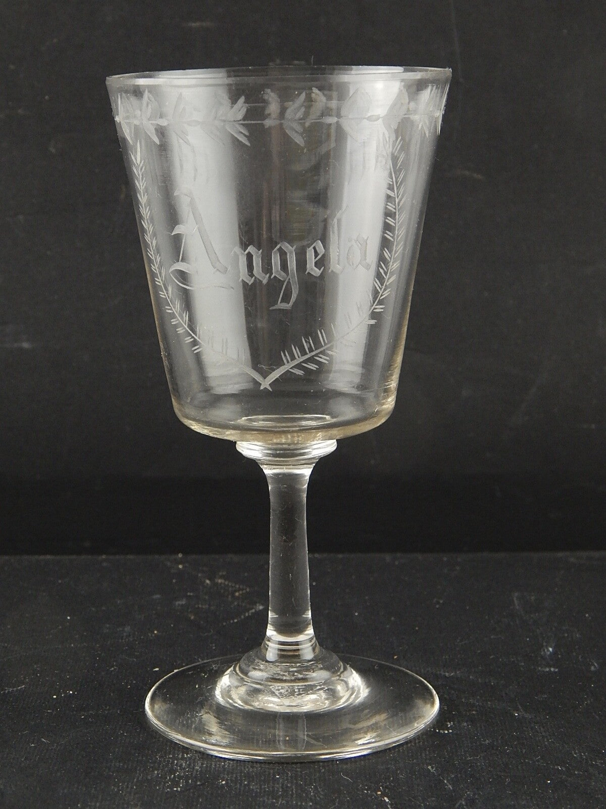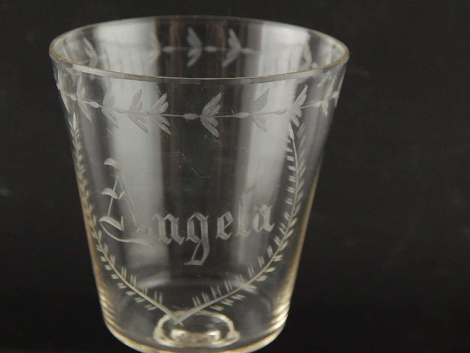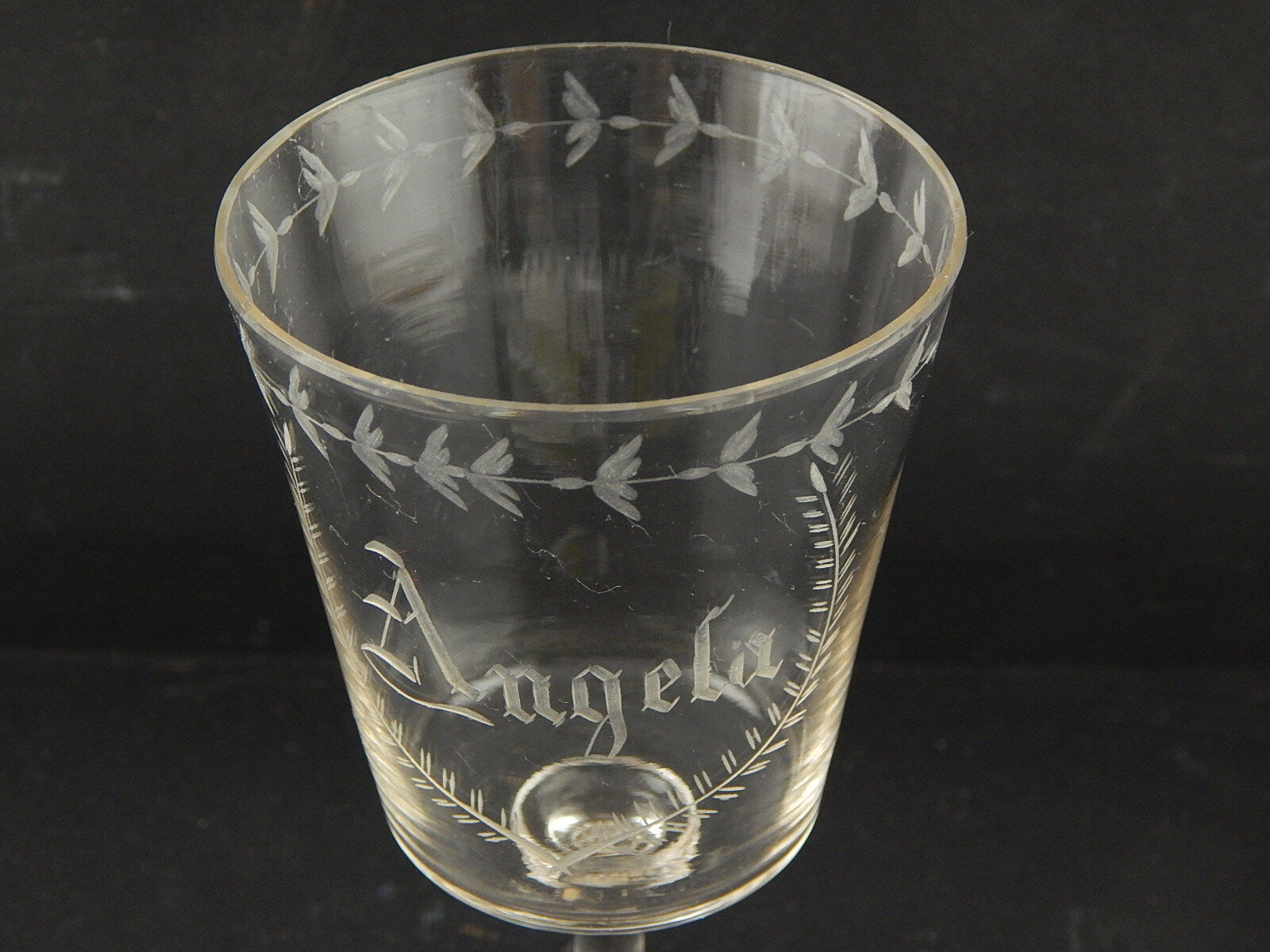 In questa inserzione viene presentato un antico bicchiere di cristallo inciso all'acido risalente al 1800. E' inciso anche il nome Angela
