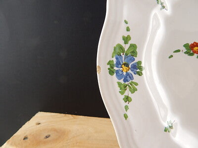 Il piatto è stato realizzato al tornio e dipinto a mano, misura 24 cm di diametro, come si può vedere dalle foto ha una minima scheggiatura sul bordo