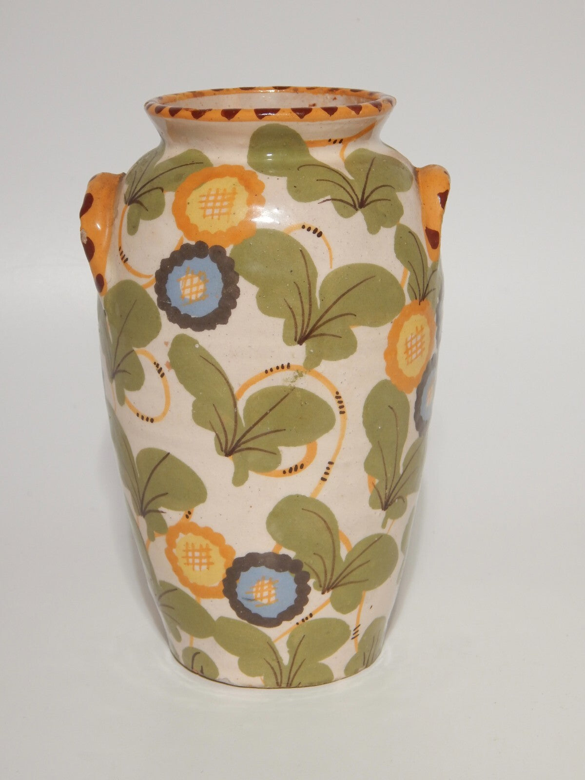 Albarello in maiolica decorata a mano, con motivi floreali stilizzati nei toni del verde, giallo, blu e marrone.