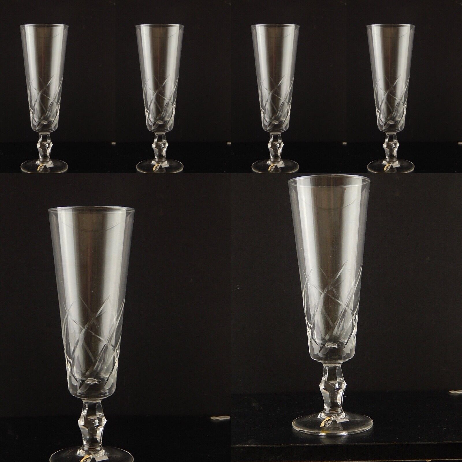 In questa inserzione viene presentato un set di 6 antichi bicchieri a Flute di cristallo incisi e molati dei primi decenni del 1900