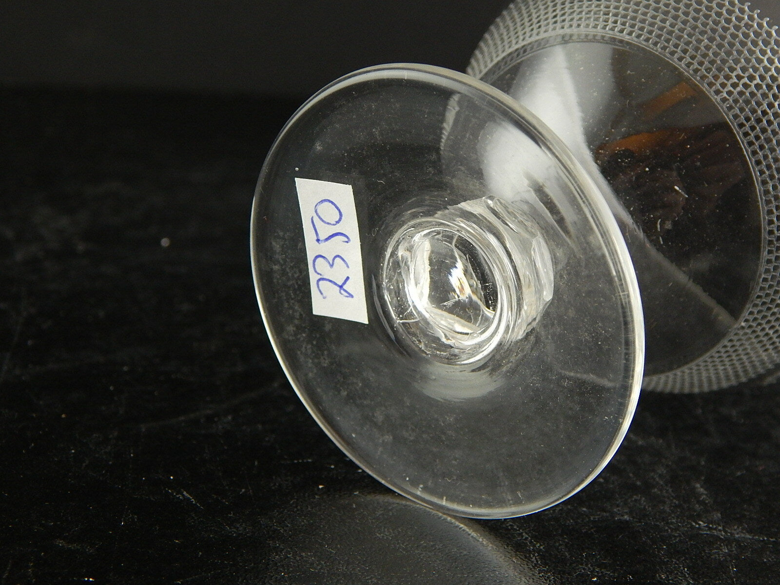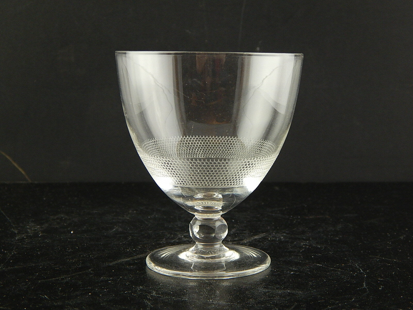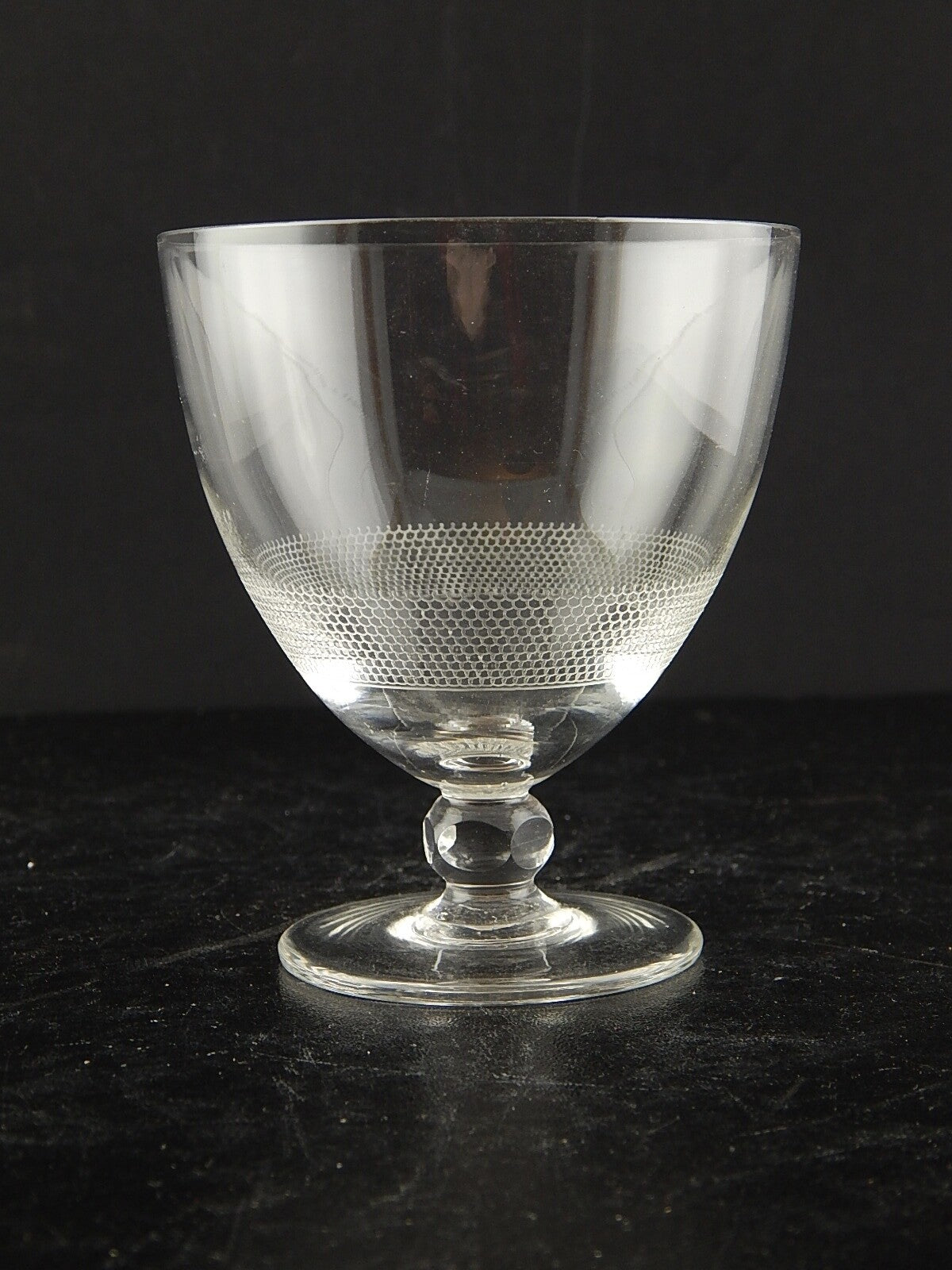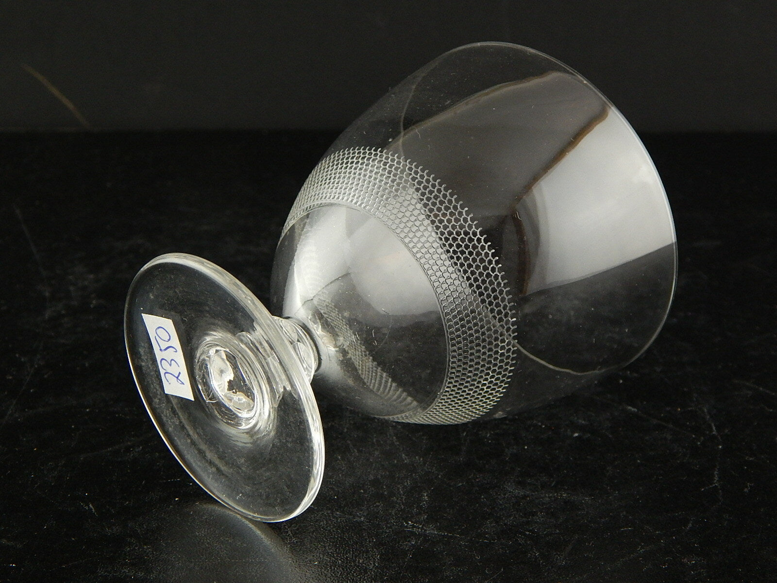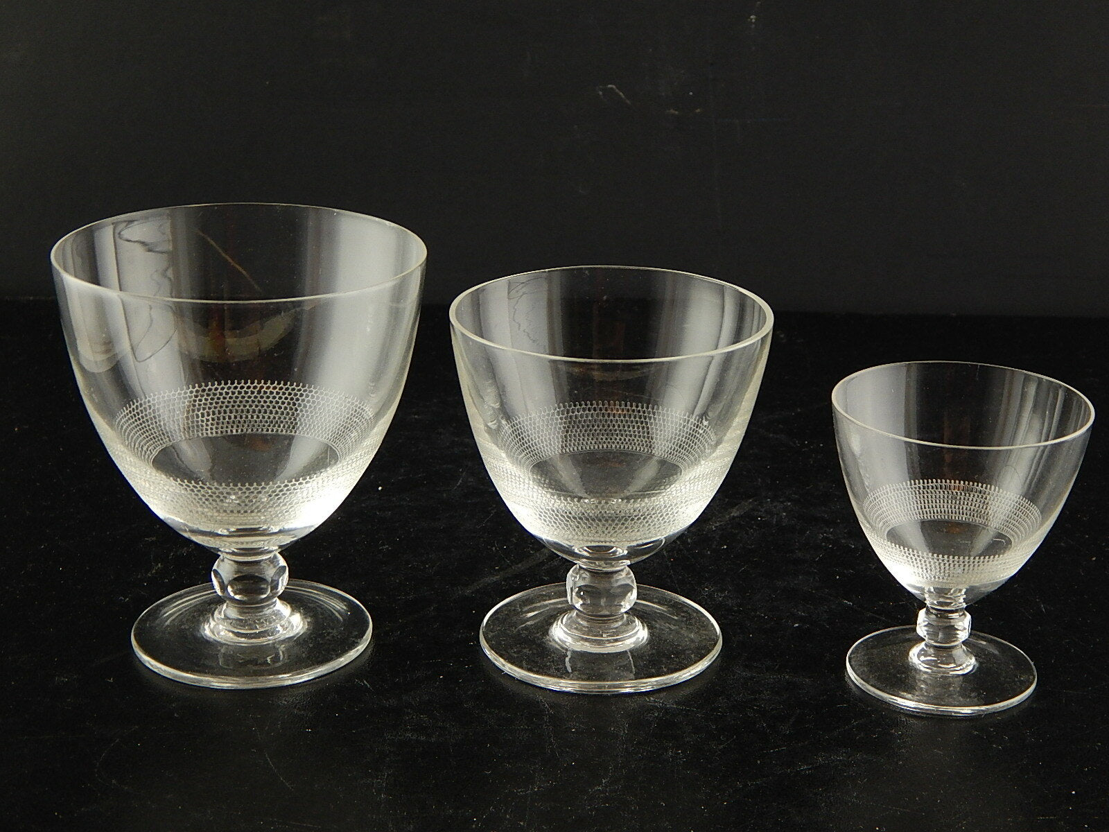 In questa inserzione viene presentato un set composto da 3 antichi bicchieri a calice di cristallo serigrafato