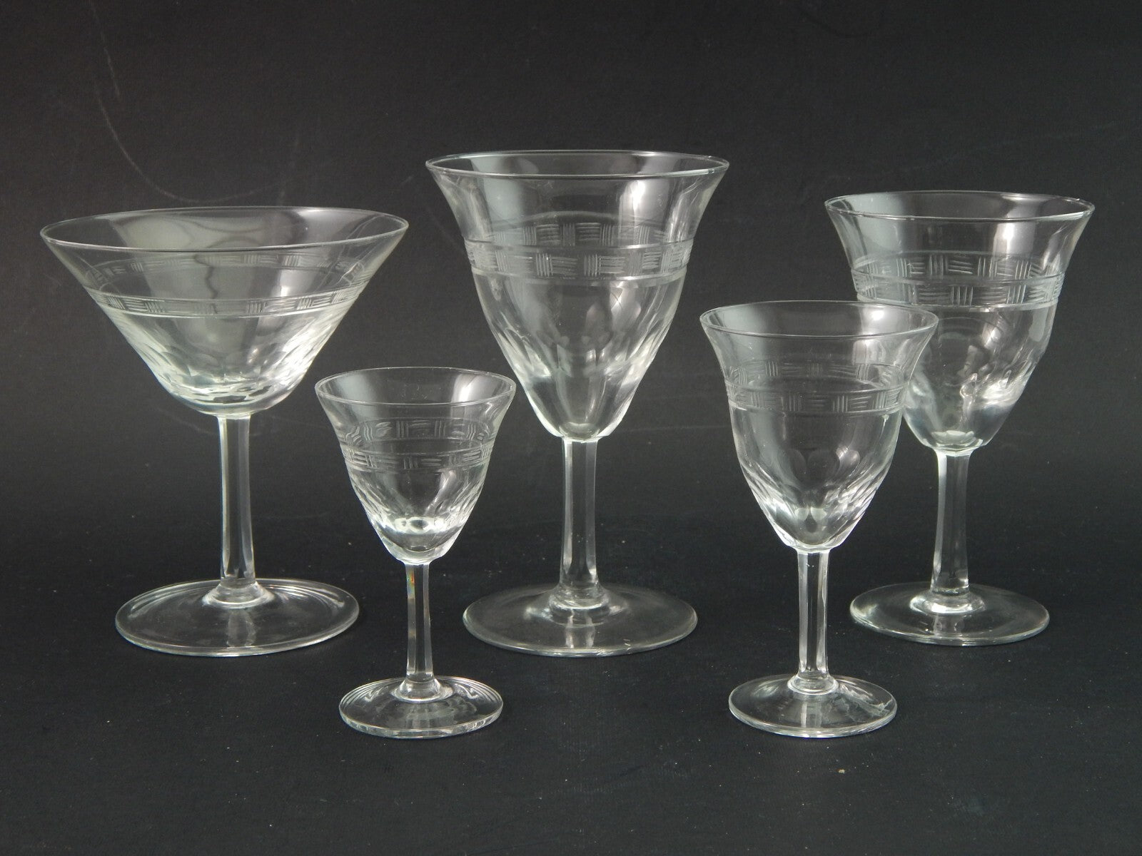 ANTICO ELEGANTE RARO ART DECO SERVIZIO 27 CALICI CRISTALLO INCISO