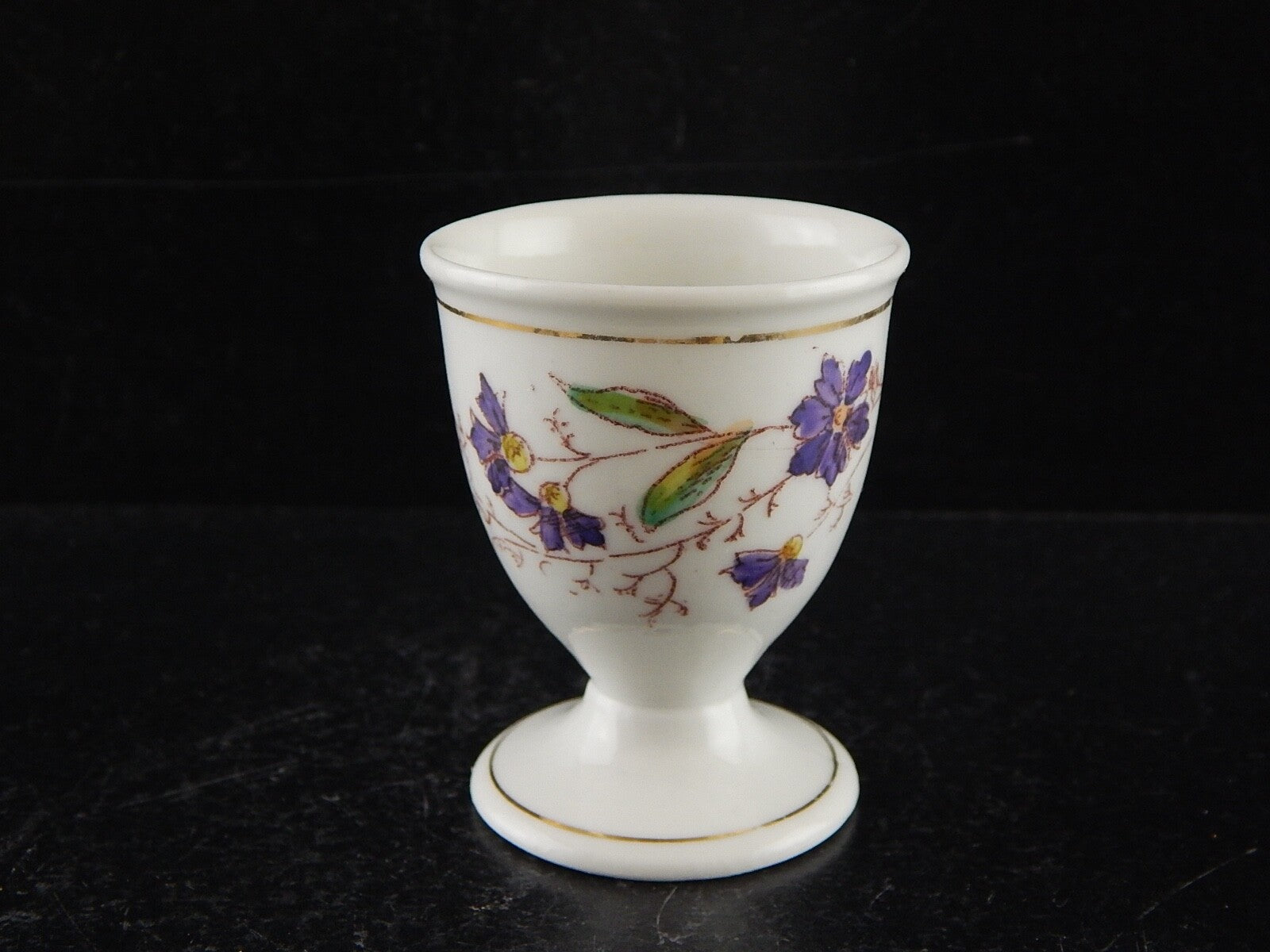 Il porta uovo in porcellana bianca con decoro policromo dipinto a mano e profili in oro zecchino misura 4,7 cm di diametro e 6 cm di altezza