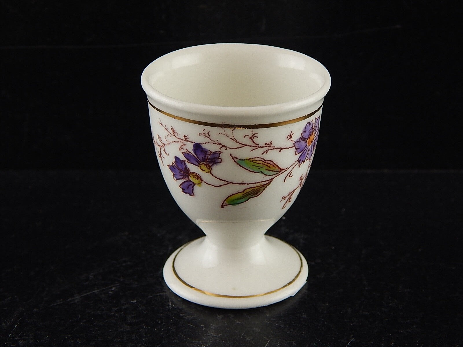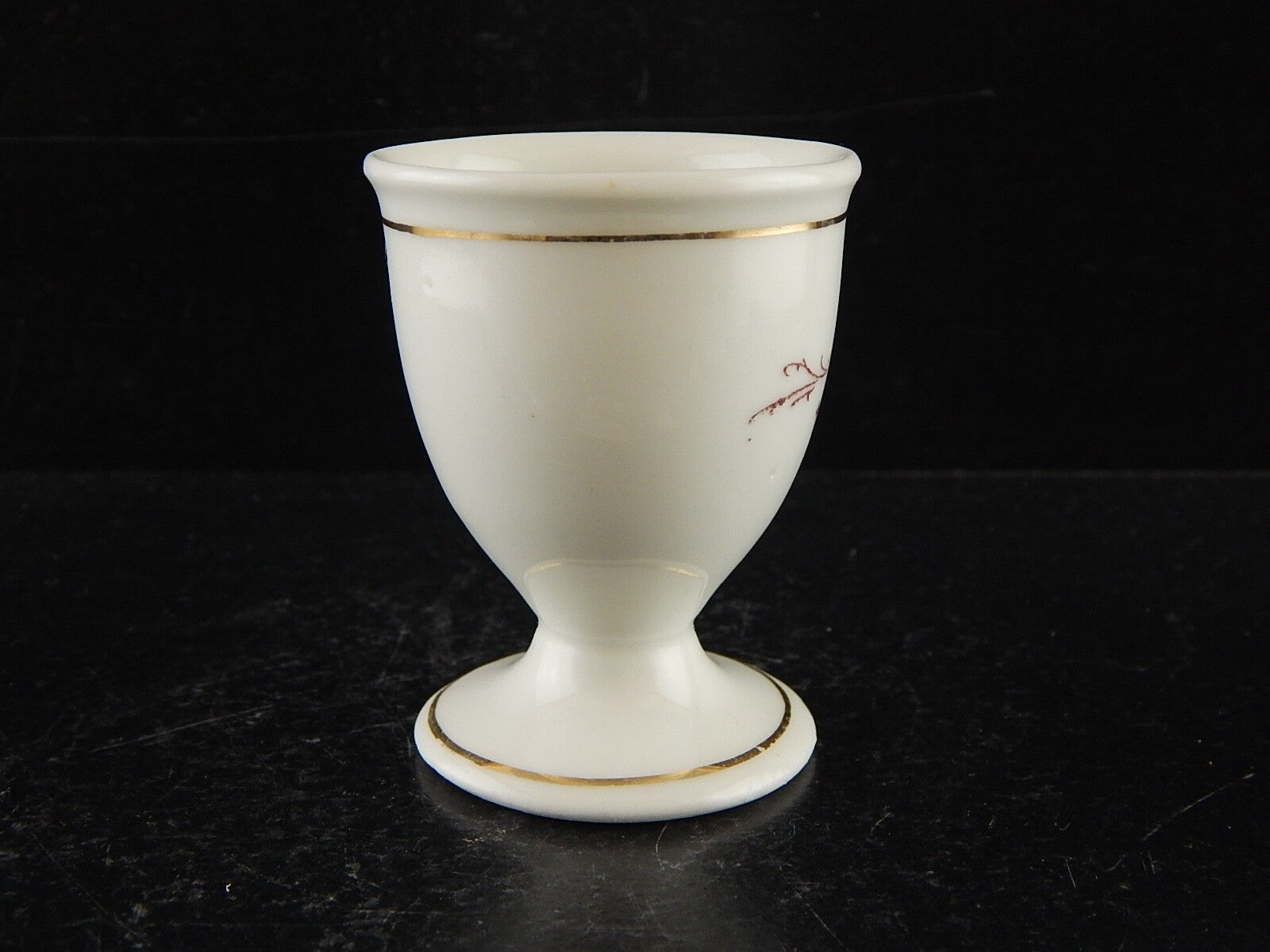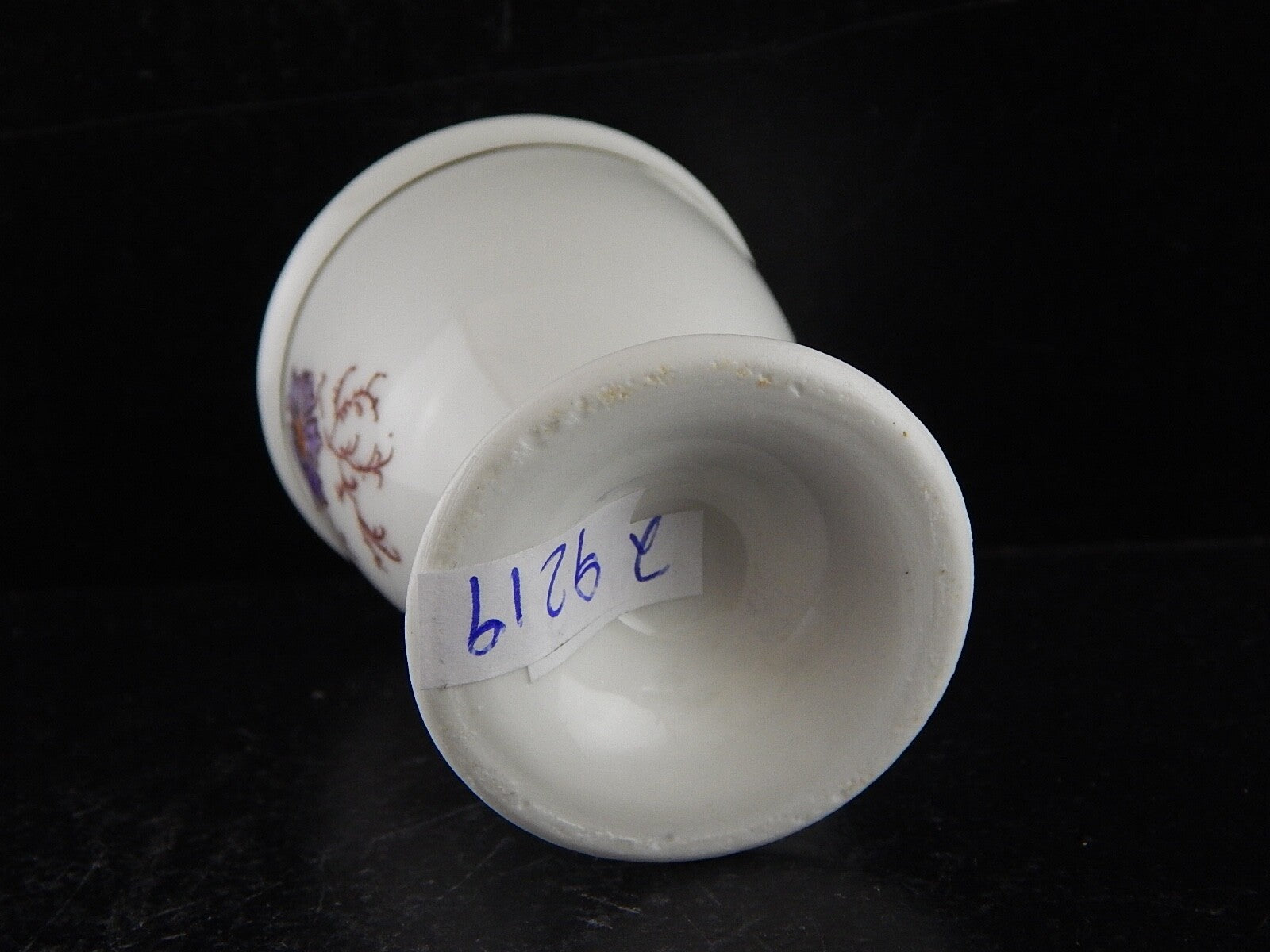 Il porta uovo in porcellana bianca con decoro policromo dipinto a mano e profili in oro zecchino misura 4,7 cm di diametro e 6 cm di altezza, come si può vedere dalle foto ha un difetto di fabbrica, è leggermente storto