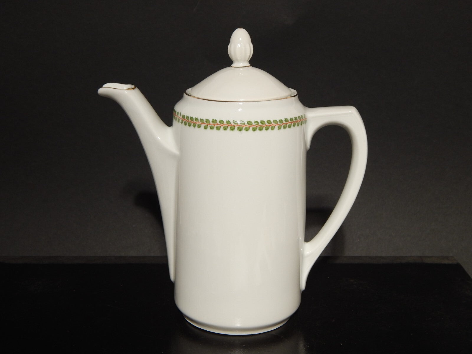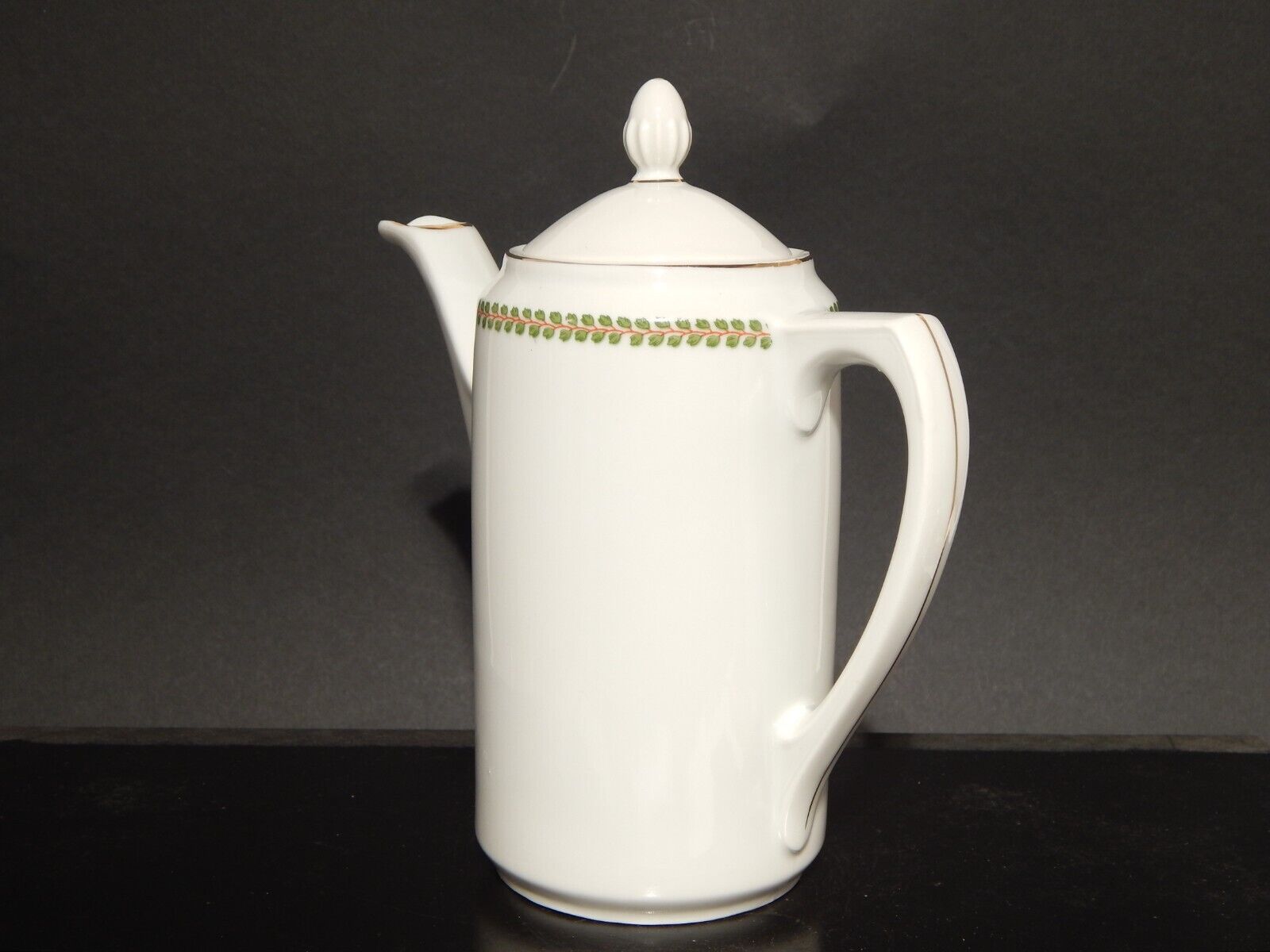 In questa inserzione viene presentato un antico servizio da caffè in porcellana bianca elegantemente decorato con ghirlande di piccole foglie verdi.