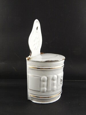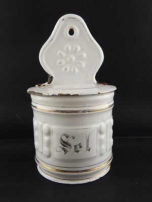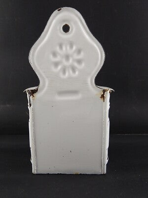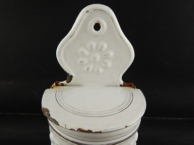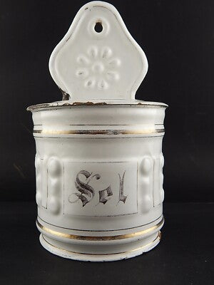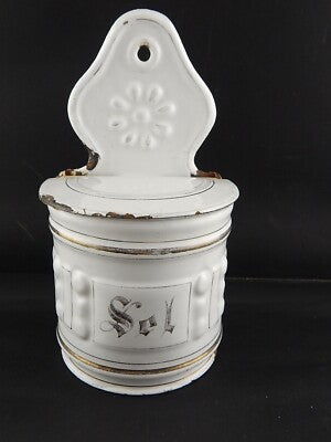 In questa inserzione viene presentato un'antico contenitore per il sale da parete in metallo smaltato
