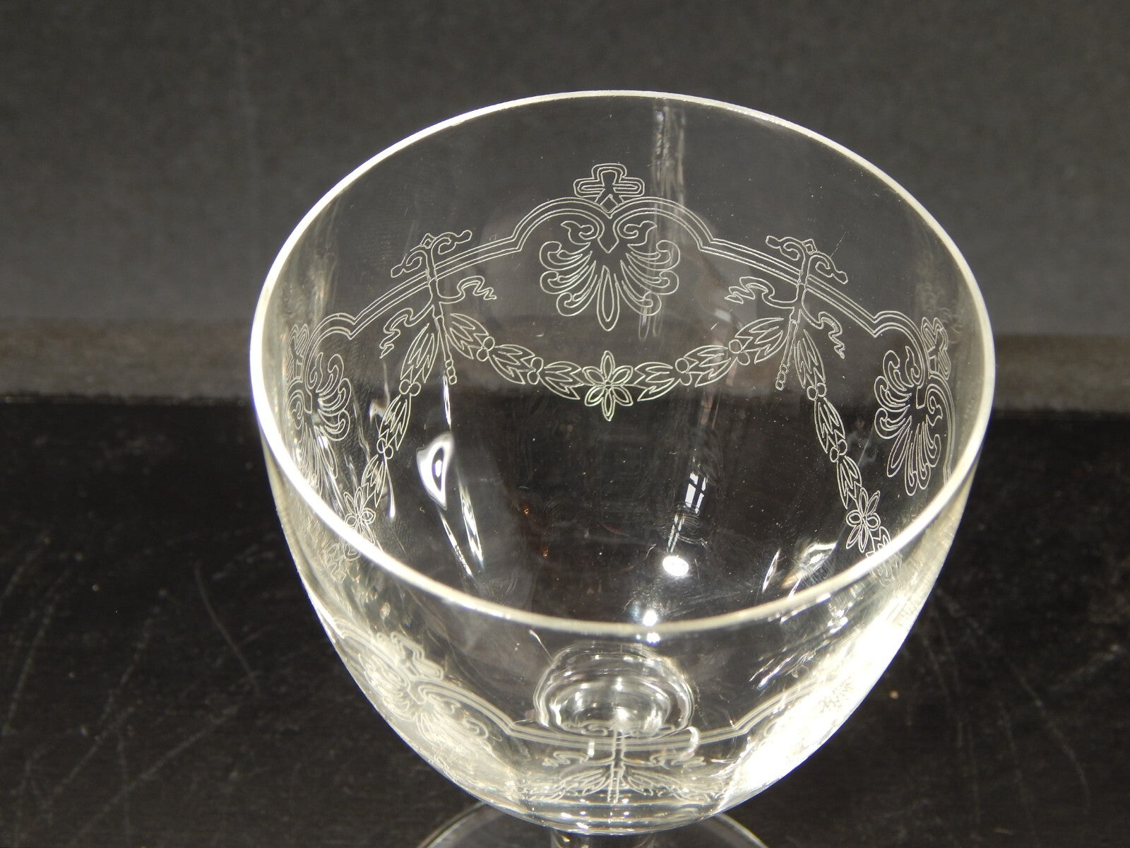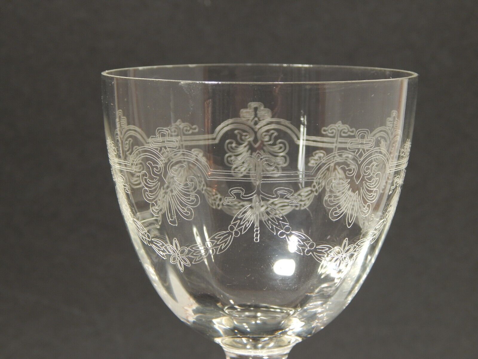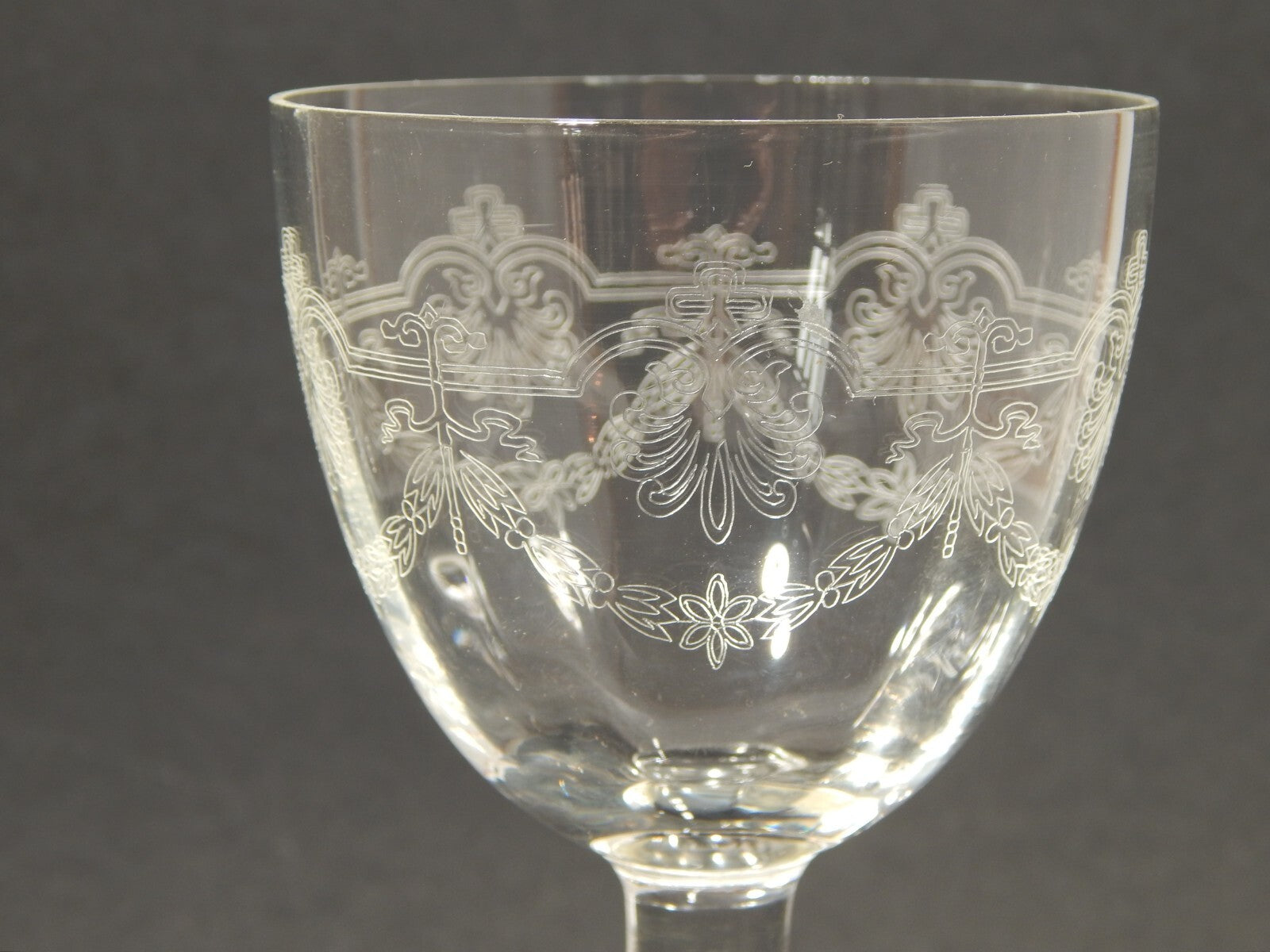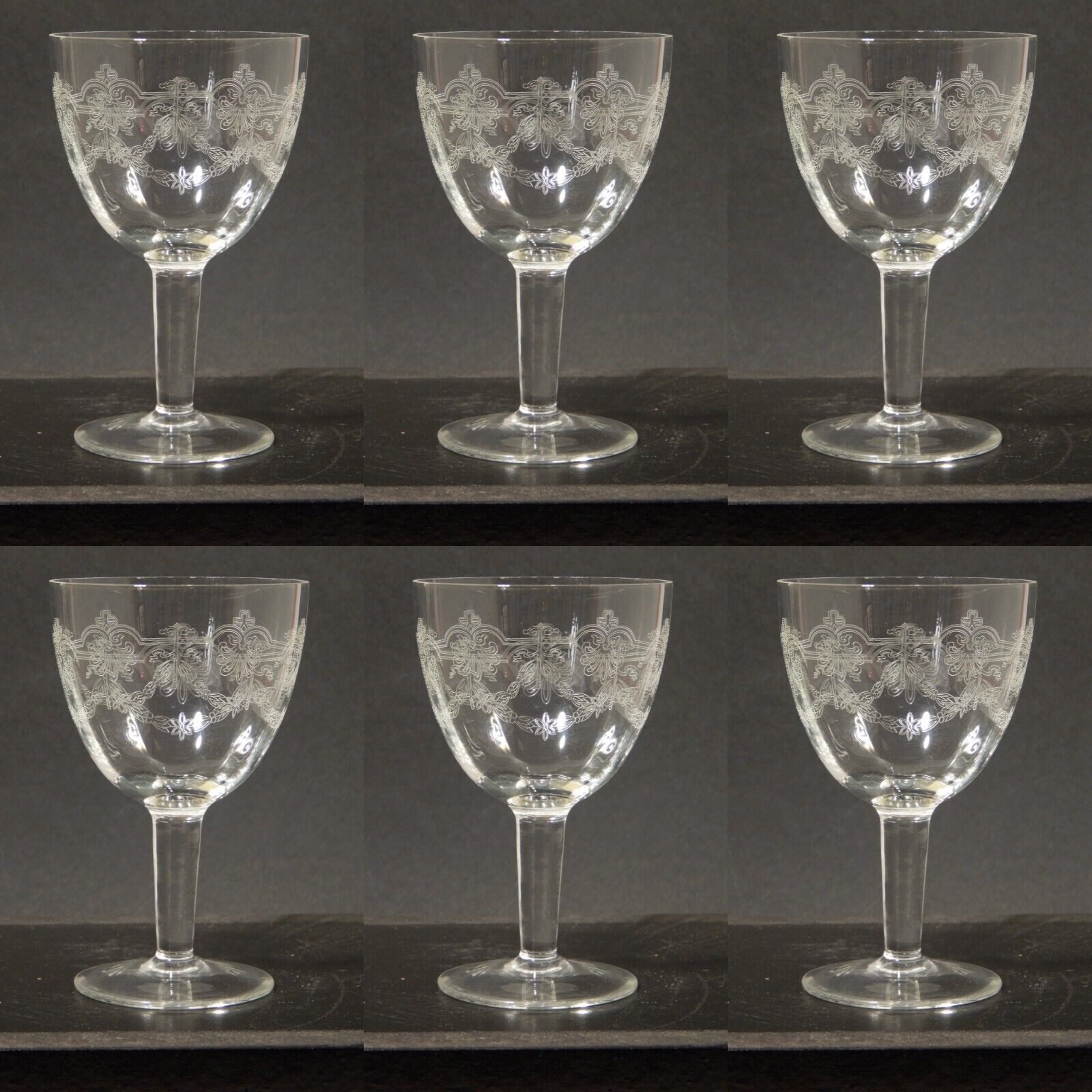 In questa inserzione viene presentato un set composto da 6 antichi bicchieri a calice di cristallo decorati con ghirlanda incisa dei primi decenni del 1900