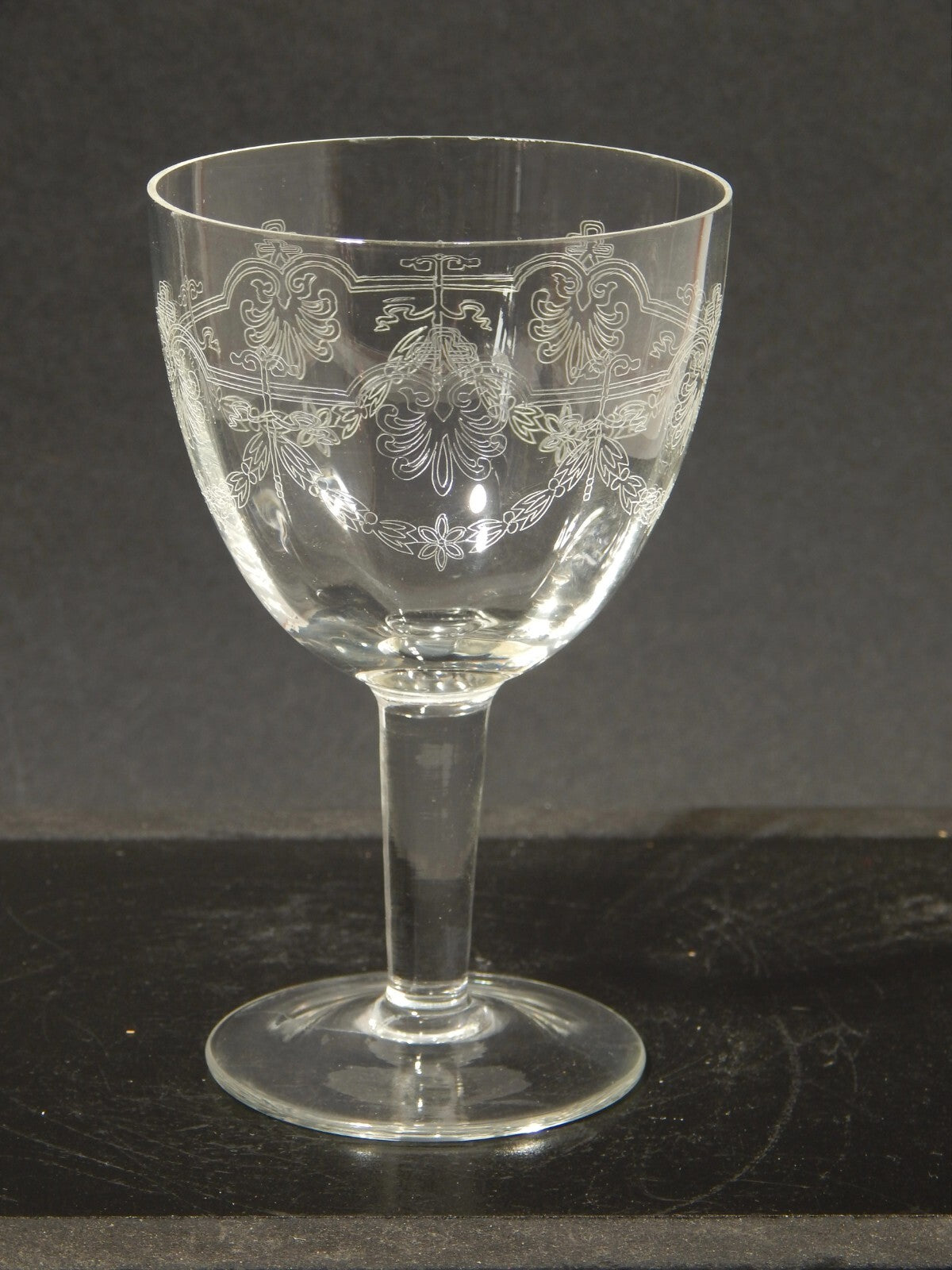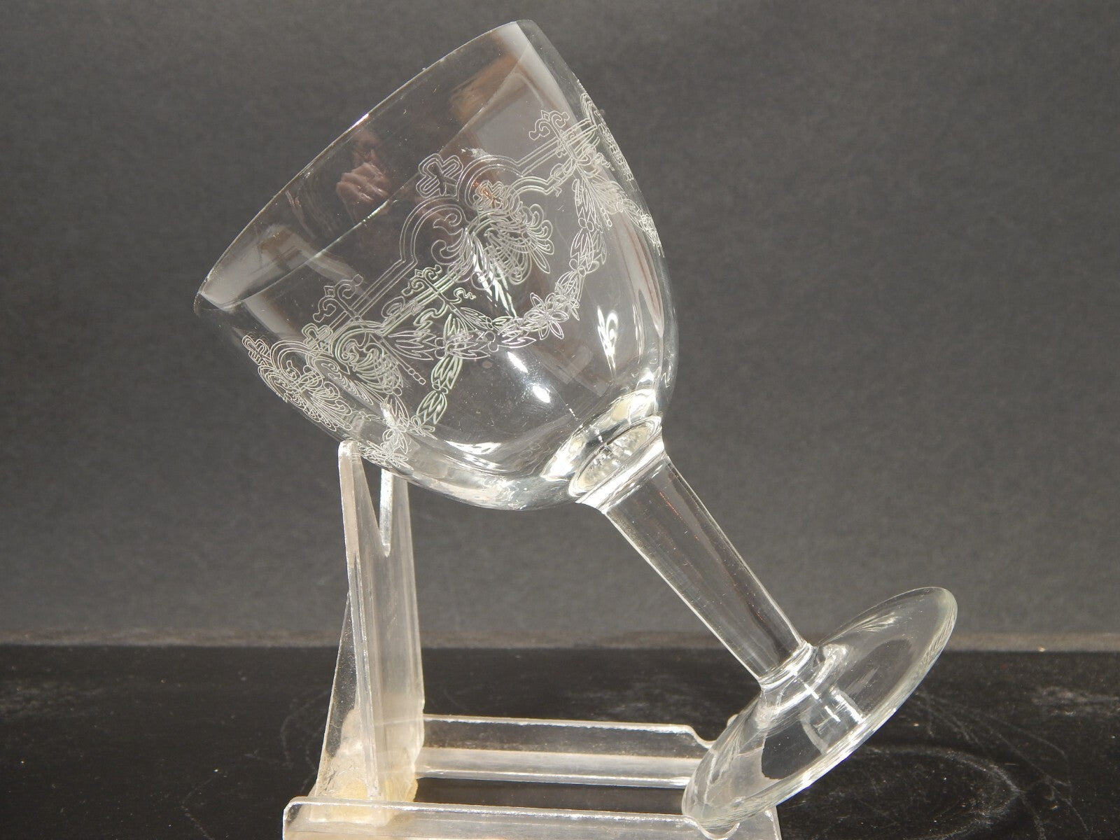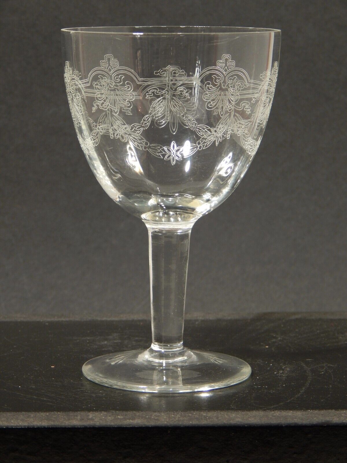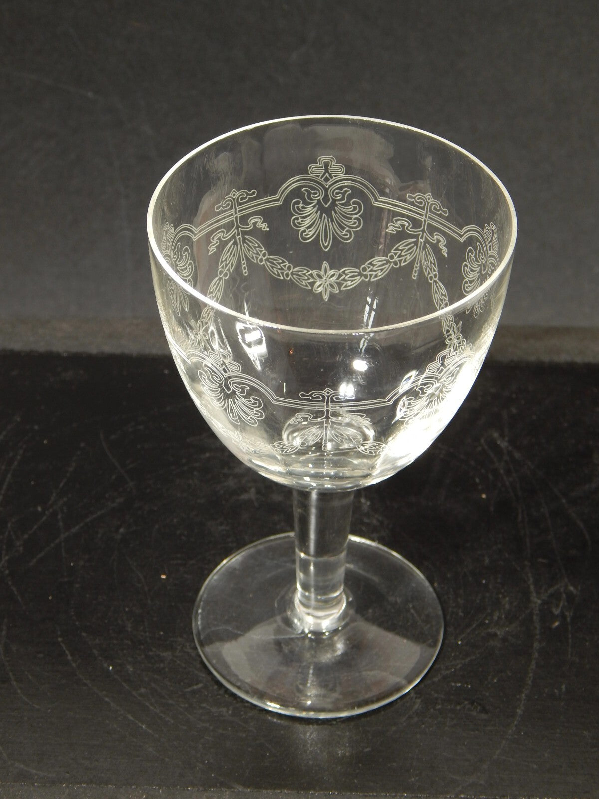 In questa inserzione viene presentato un set composto da 6 antichi bicchieri a calice di cristallo decorati con ghirlanda incisa dei primi decenni del 1900