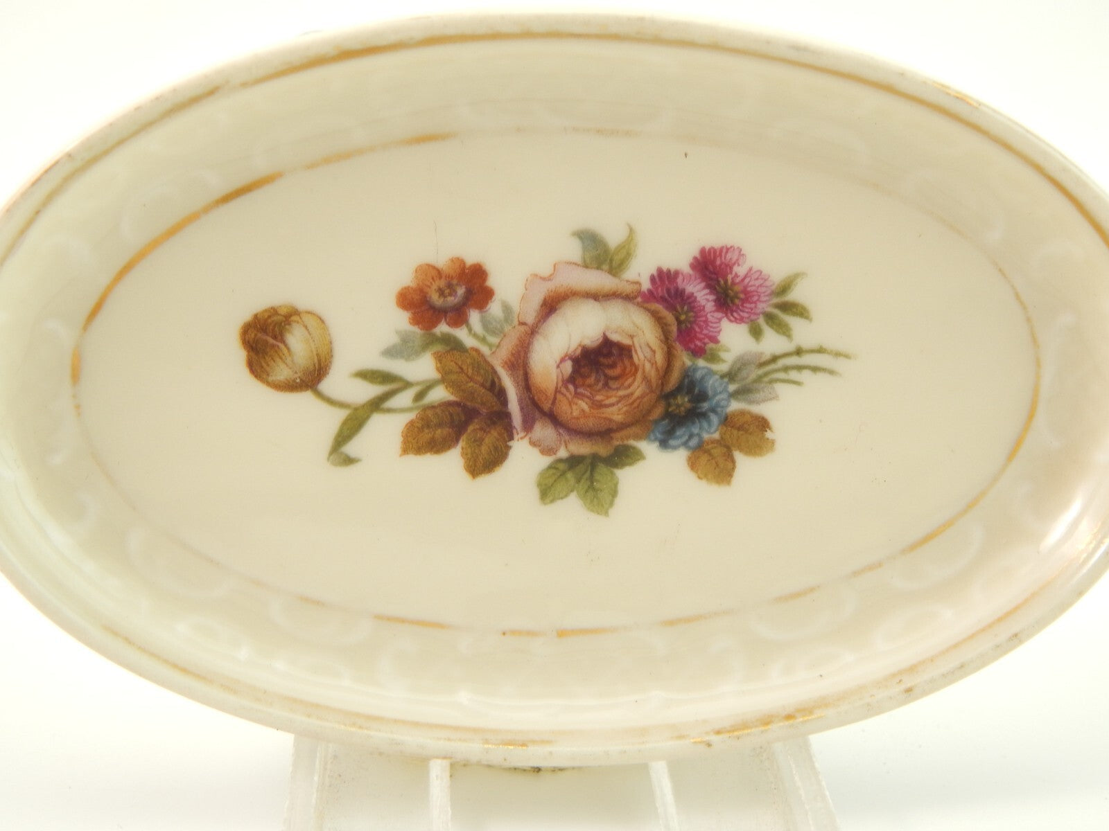 ANTICO PIATTINO OVALE KPM COPENHAGEN PORCELLANA BOUQUET DI FIORI E ORO DEL 1924