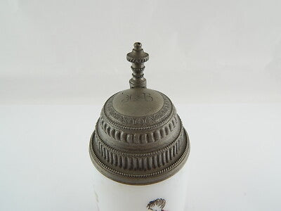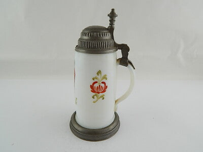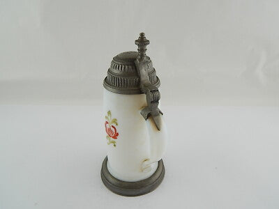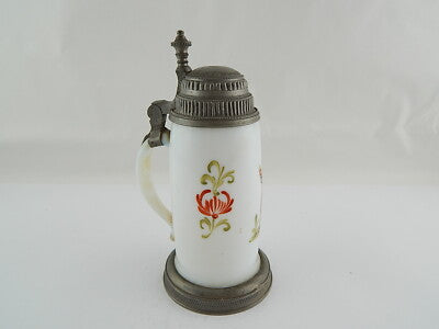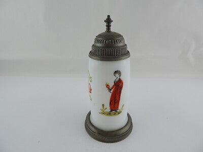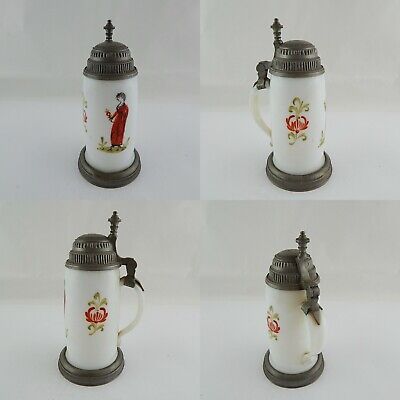 In questa inserzione viene presentato un antico e prezioso boccale in vetro opalino soffiato (come si può vedere sul fondo) dipinto finemente a mano, con coperchio in peltro lavorato risalente all'epoca Biedermeier intorno al 1820.