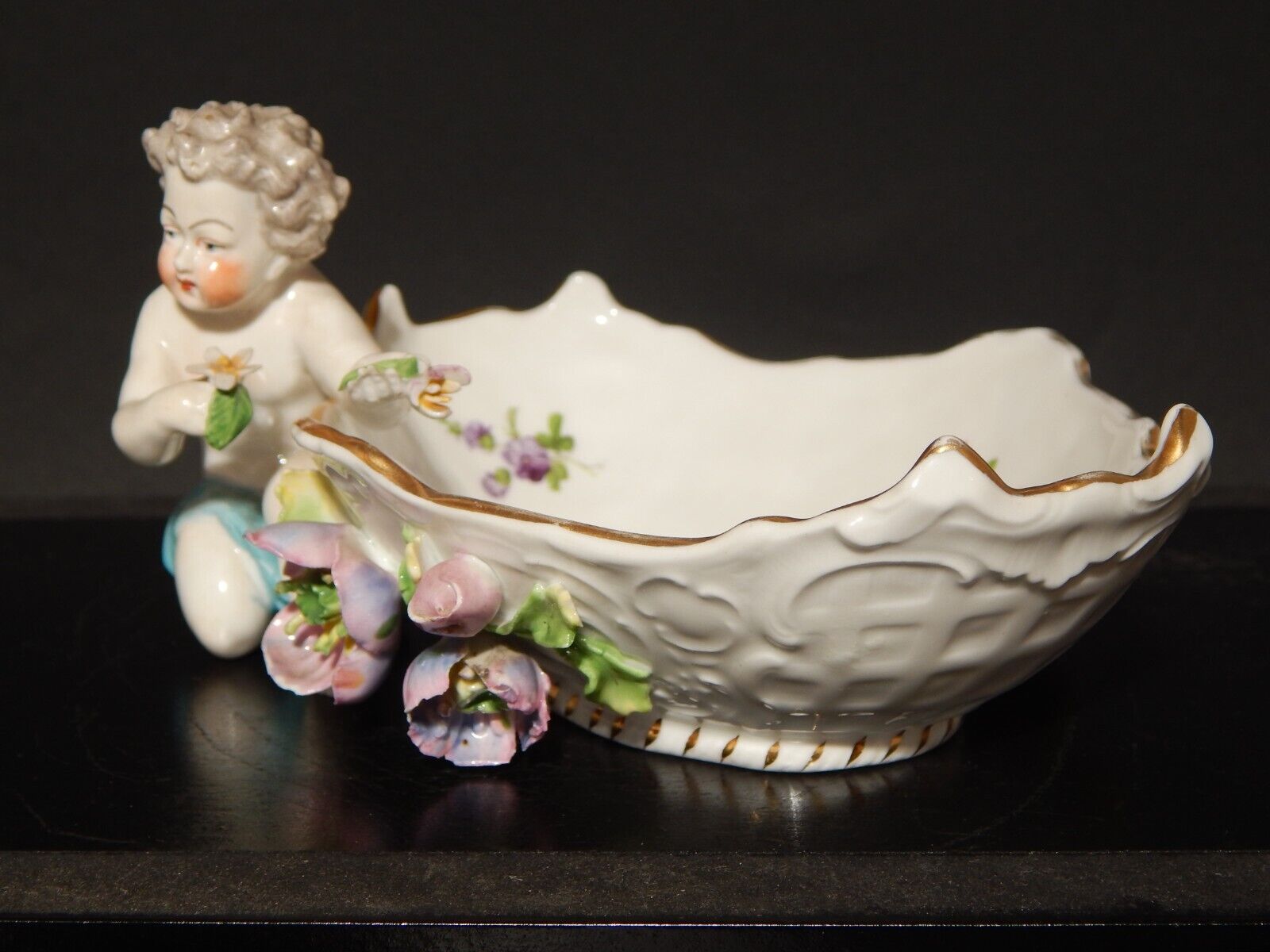 In questa inserzione viene presentato un antico soprammobile in porcellana a pasta dura realizzato in Germania nei primi anni del 900 ((1902/1925): l'oggetto raffigura un putto con ciotola finemente decorato a mano in policromia con fiori e rifiniture in oro da Carl Thieme di Potschappel, importante ceramista decoratore tedesco.