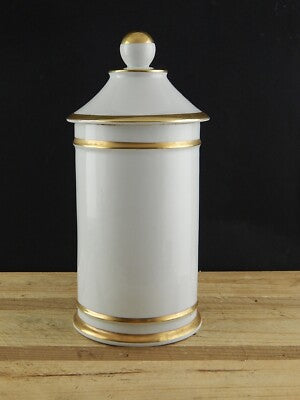 In questa inserzione viene presentato un antico vaso da farmacia in porcellana bianca dipinto a mano e rifinito in oro zecchino