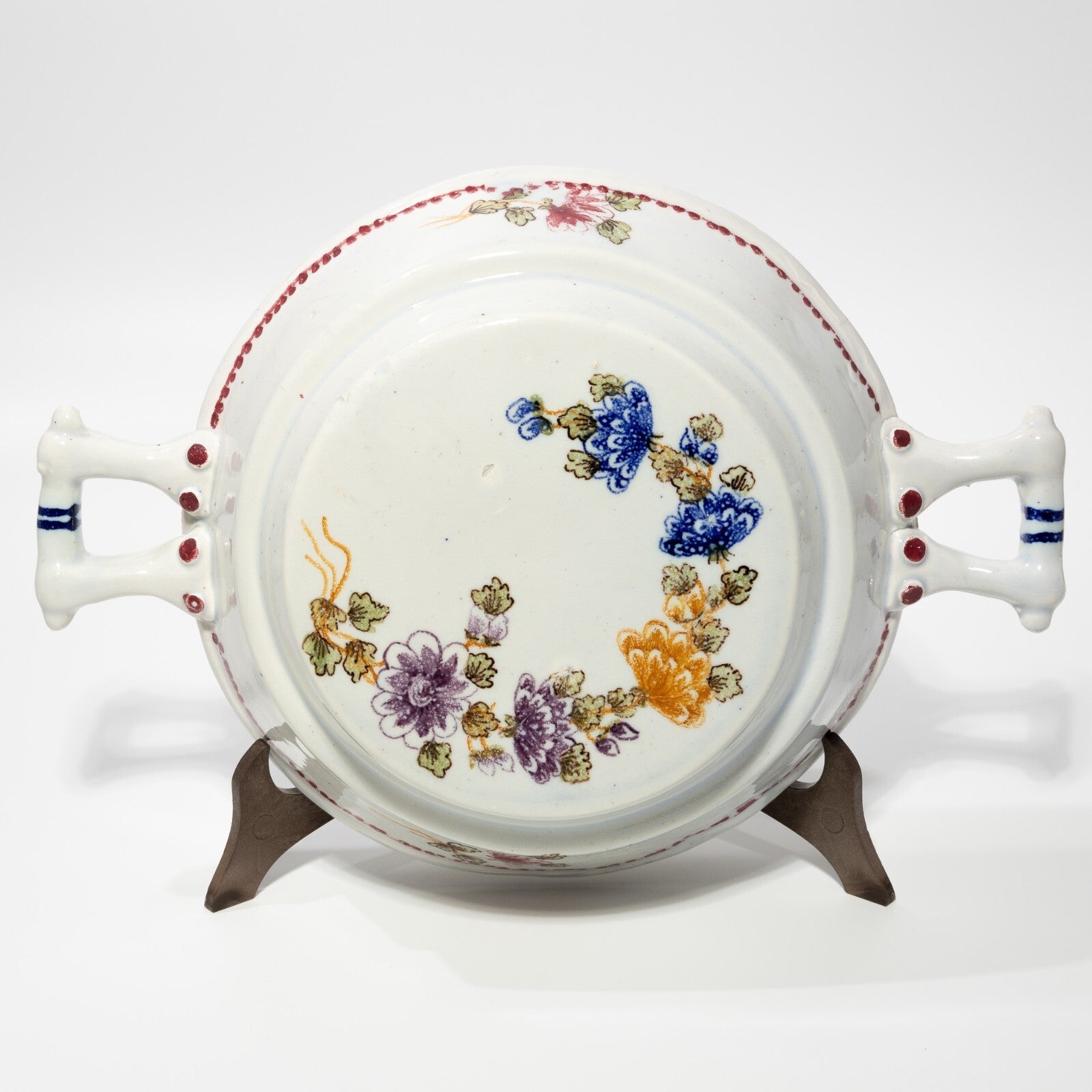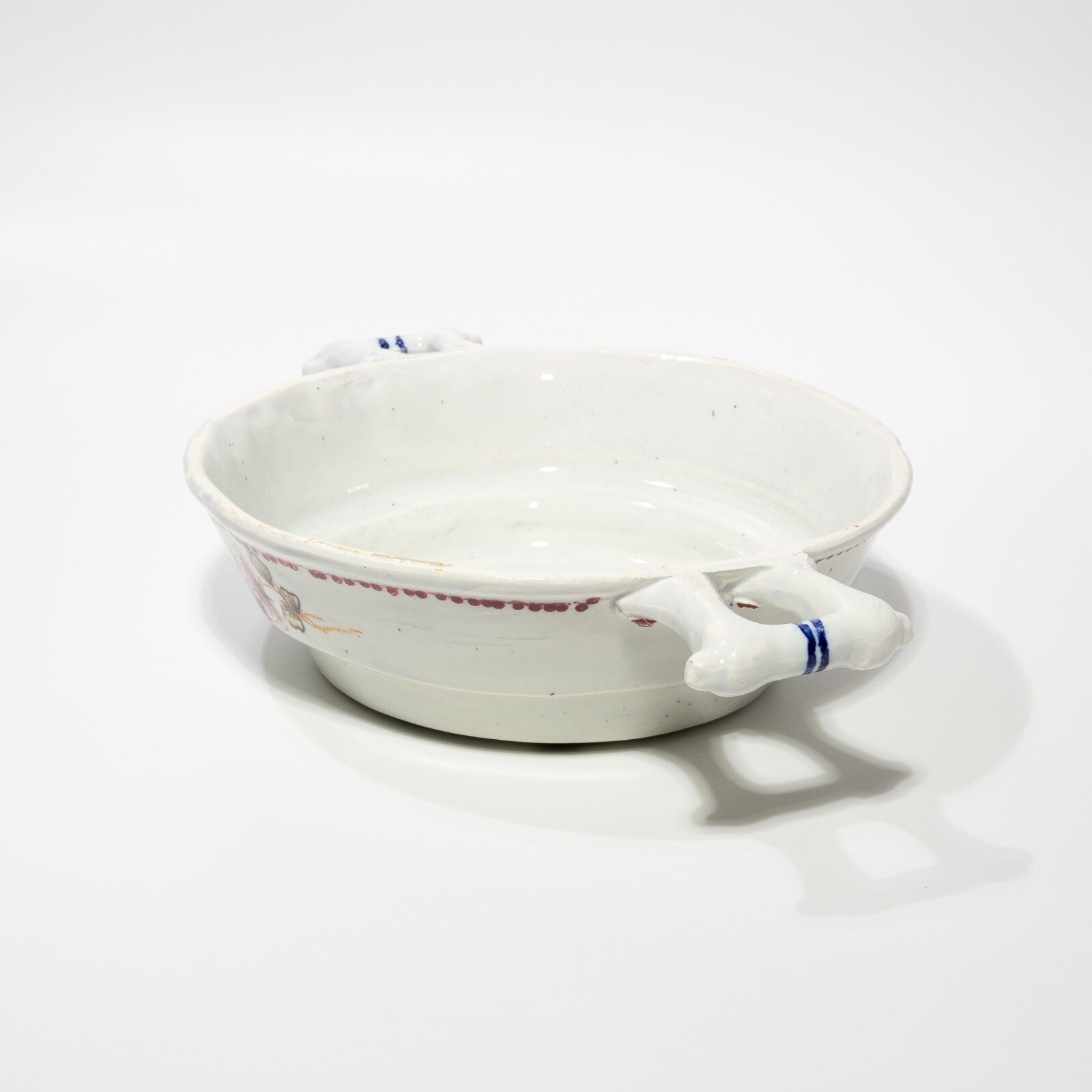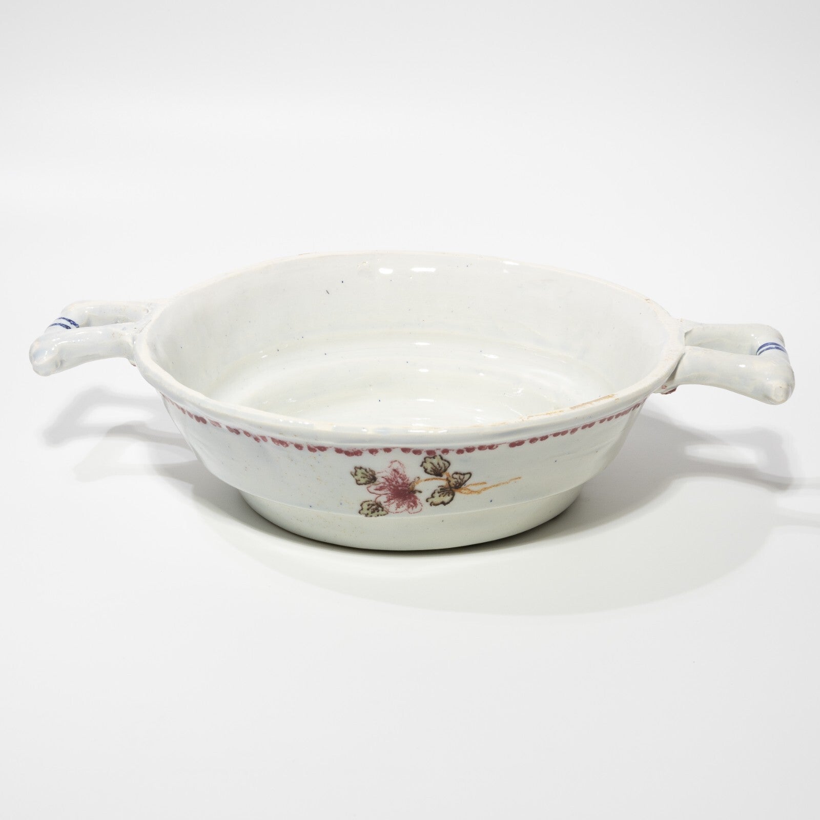 In questa inserzione viene presentato un antico tegamino in ceramica o maiolica smaltata con decori floreali dipinti a mano