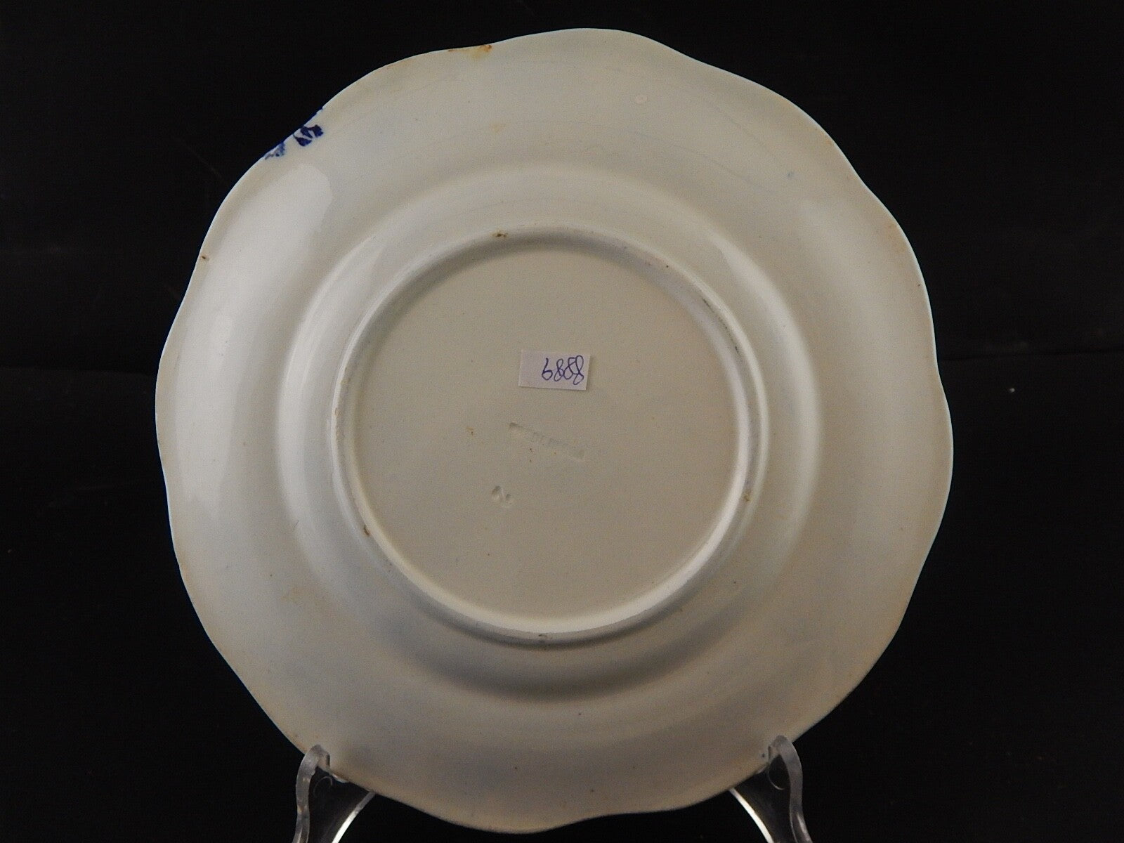 Il piatto con bordo polibolato è stampato a mano sotto smalto in blu cobalto con motivi a fiori e insetti, misura 21,5 cm. di diametro