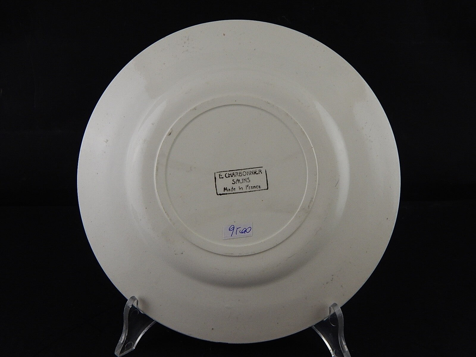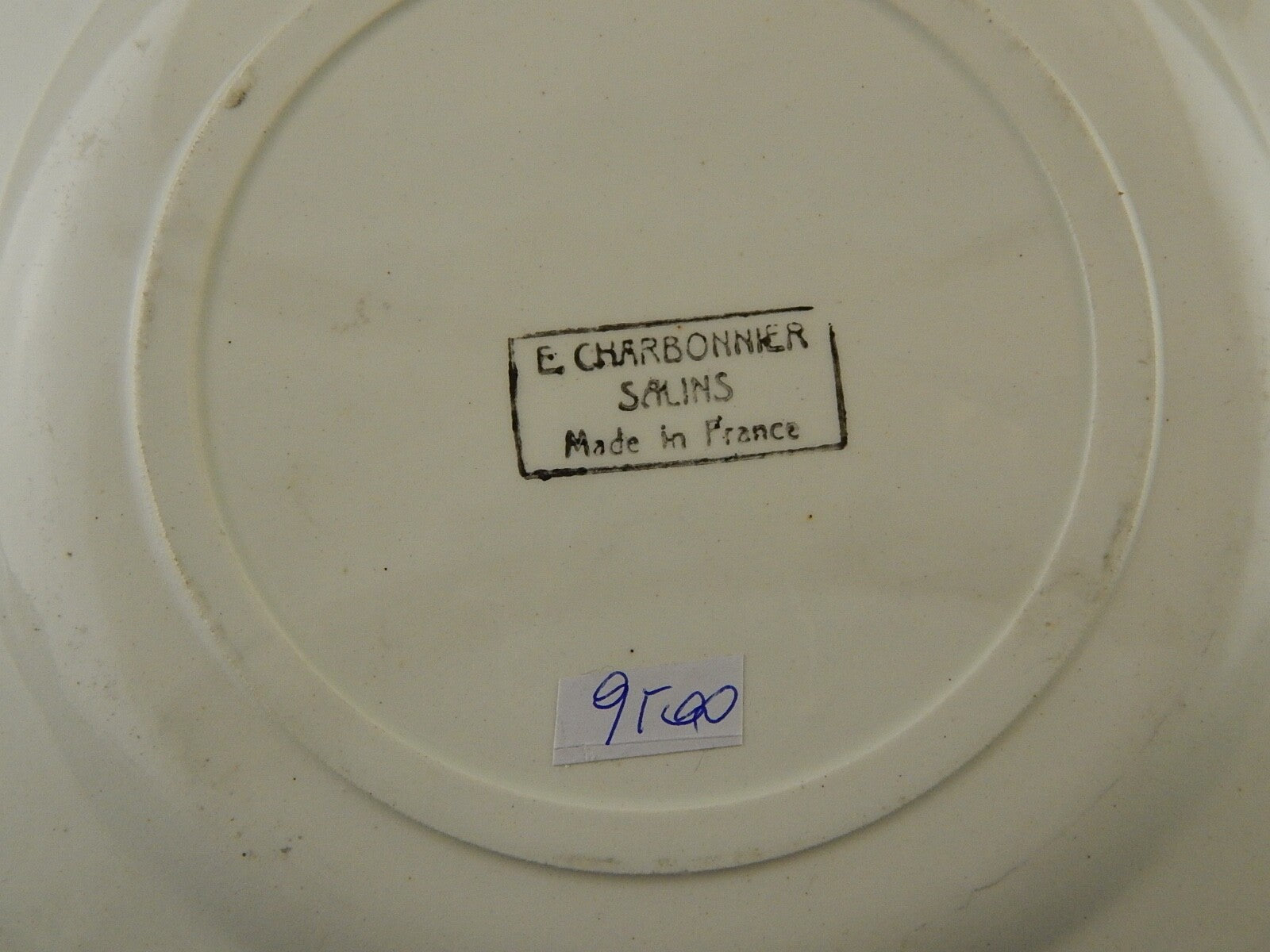 In questa inserzione viene presentato un piatto antico in ceramica realizzato in Francia dalla Faiencerie E. Charbonnier di Salins
