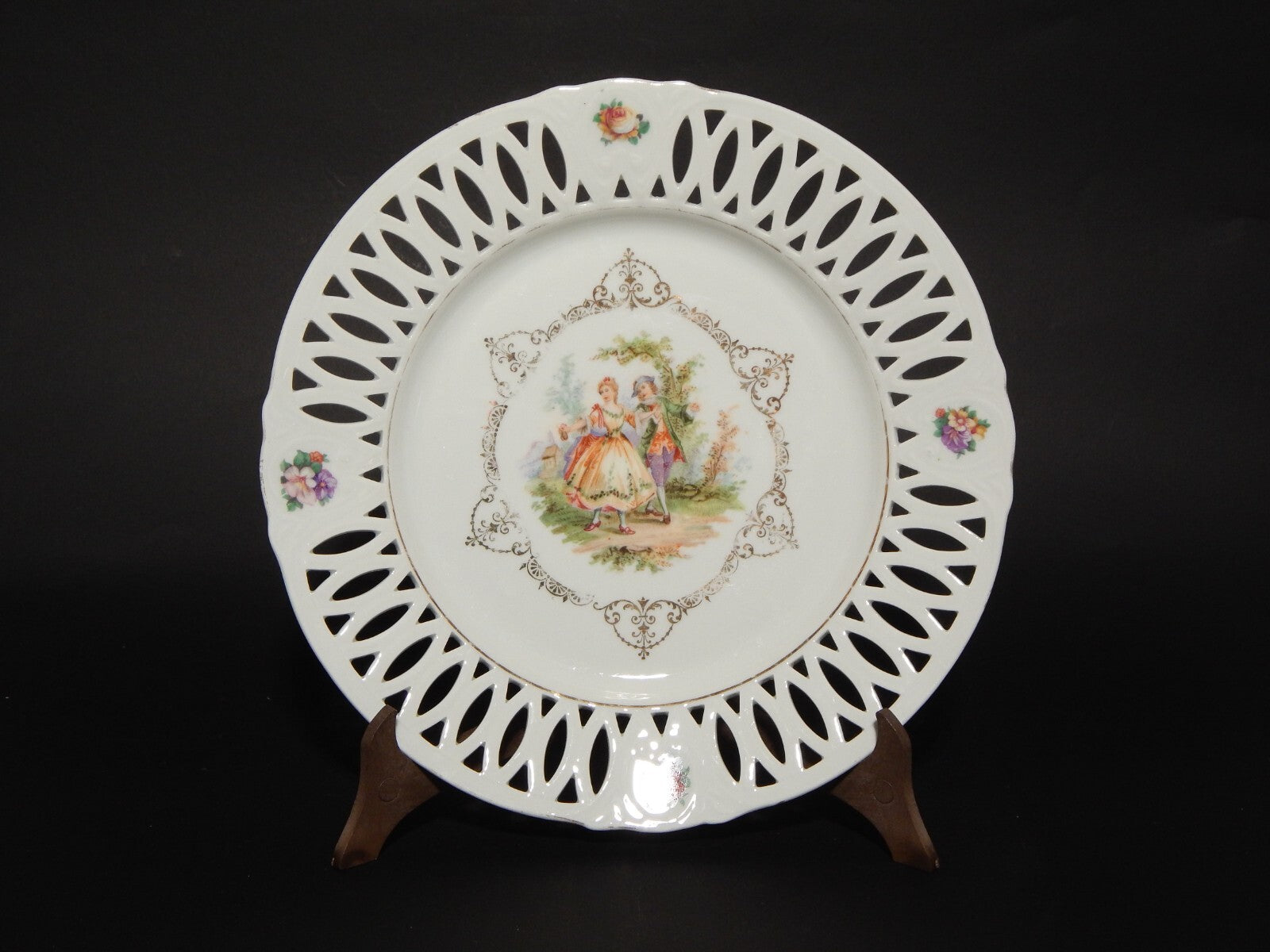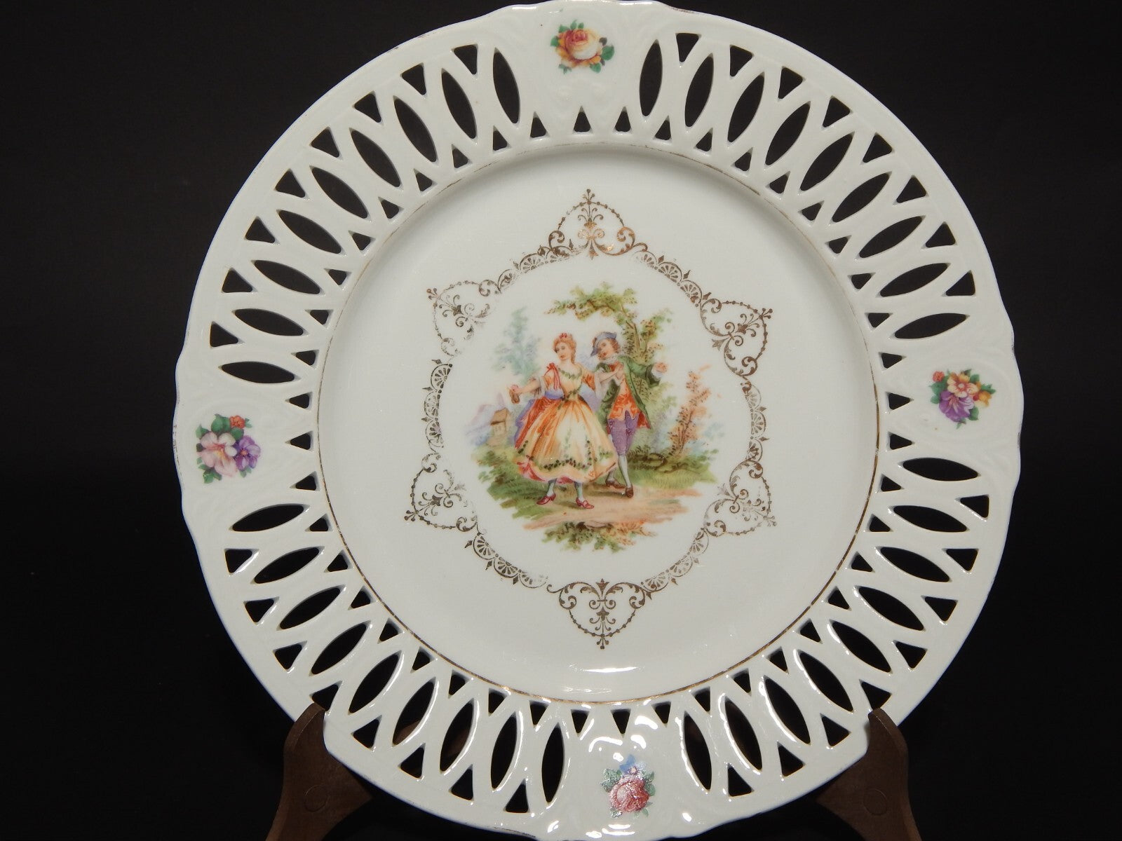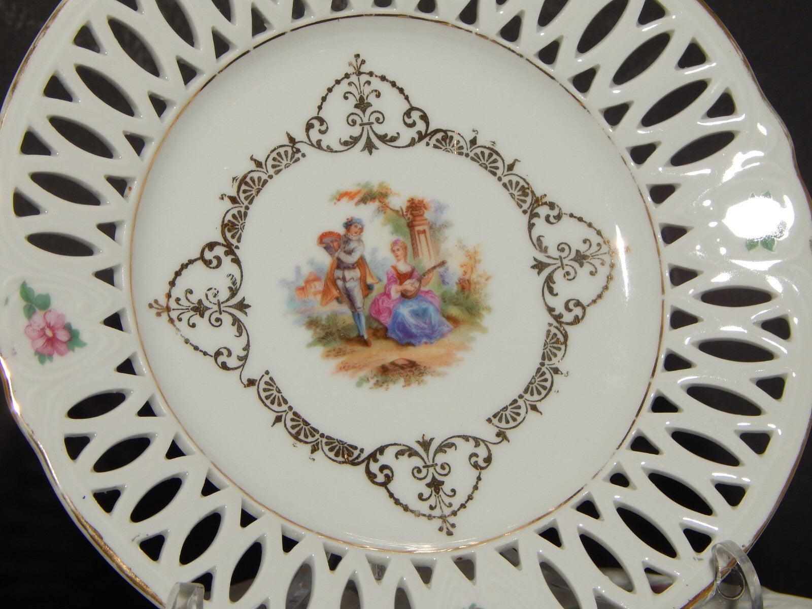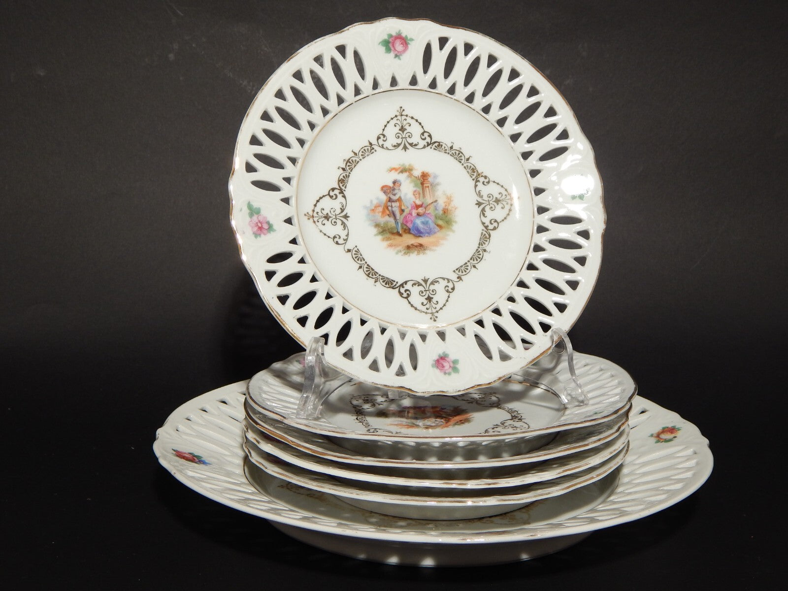 ANTICO RARO ROMANTICO SET 6 PIATTI PORCELLANA TRAFORATI CON SCENE GALANTI