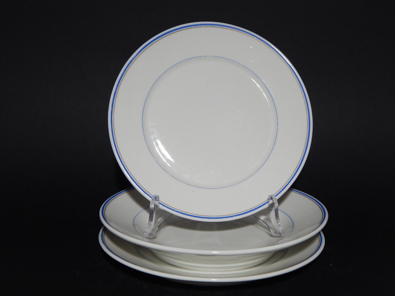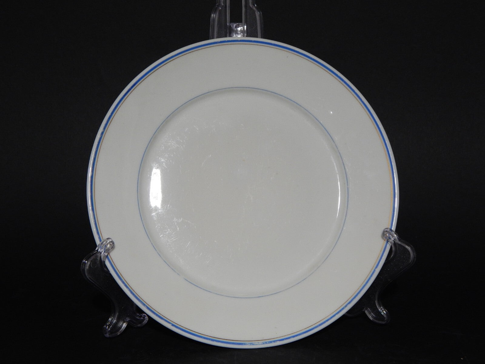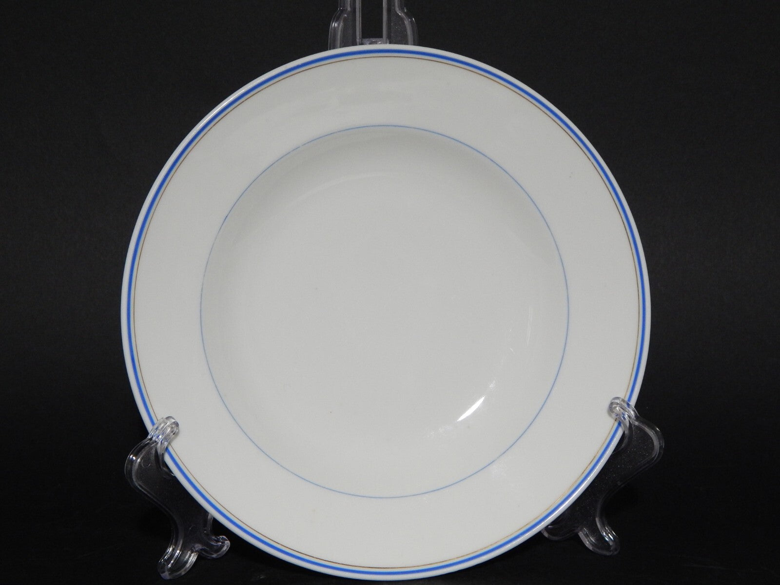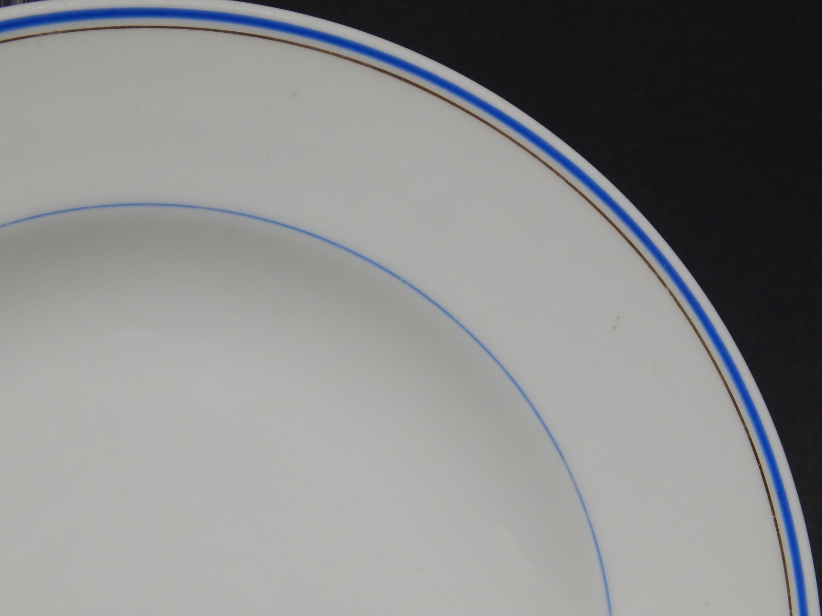 Il servizio decorato a mano con profili blu e oro nello stabilimento Ginori a Doccia è composto da 6 piatti piani che misurano 23 cm di diametro, 6 piatti fondi che misurano 23 cm di diametro e 6 piatti da dessert che misurano 21,5 cm di diametro