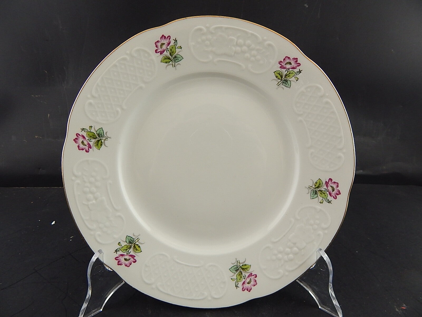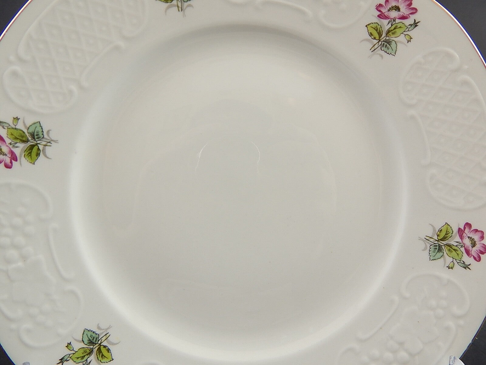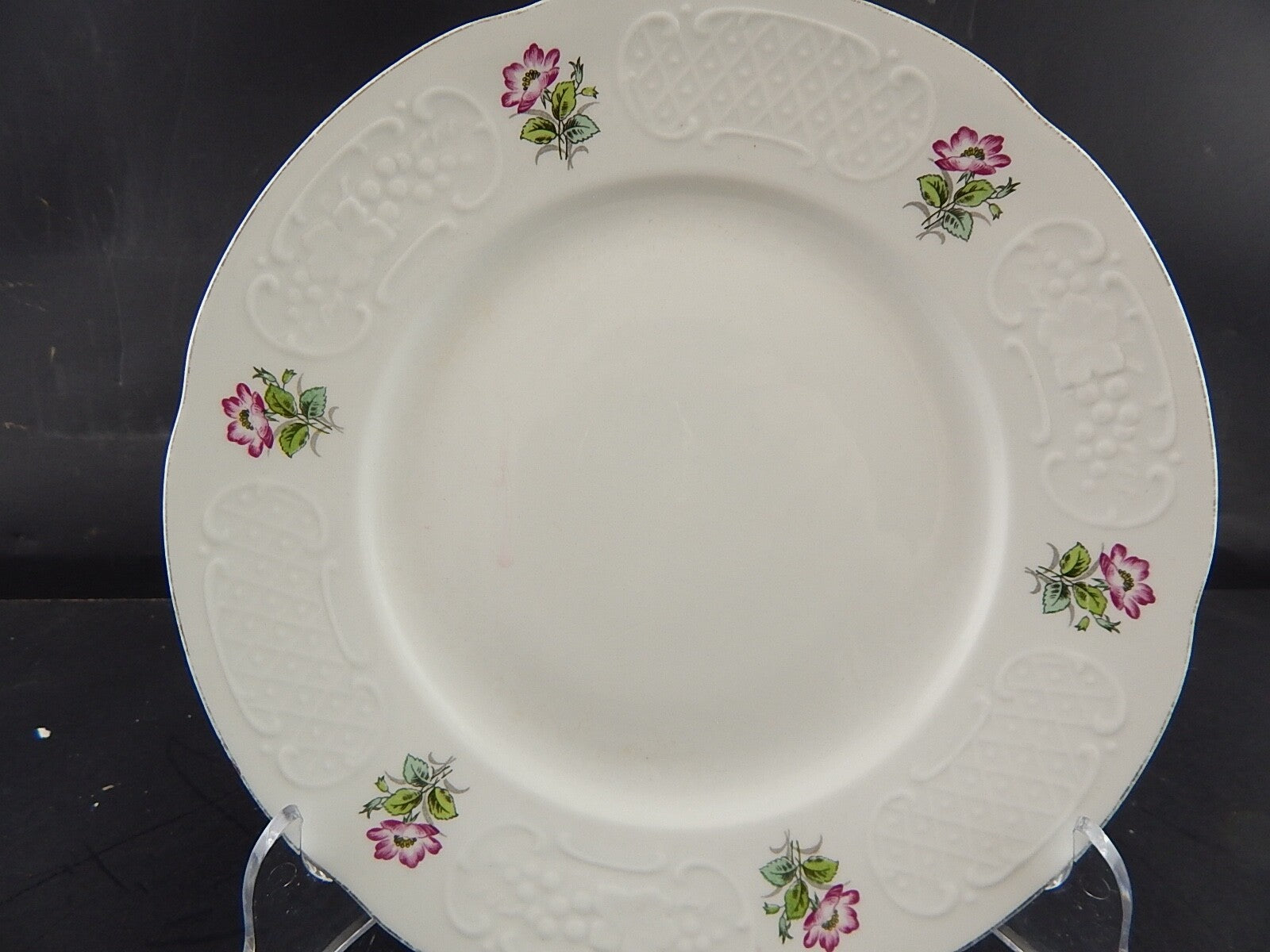 Il piatto in porcellana bianca è decorato con la rosa canina e misura 24 cm di diametro pur essendo privo di scheggiature e filature presenta piccoli segni del tempo tra cui il profilo in oro un po' sbiadito