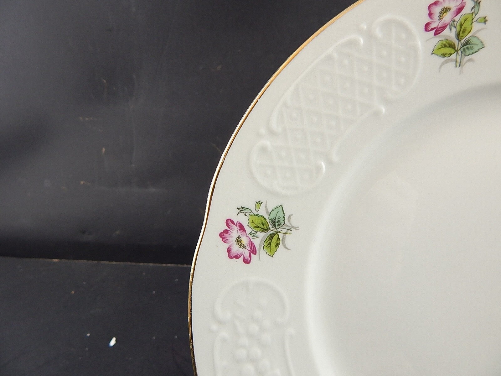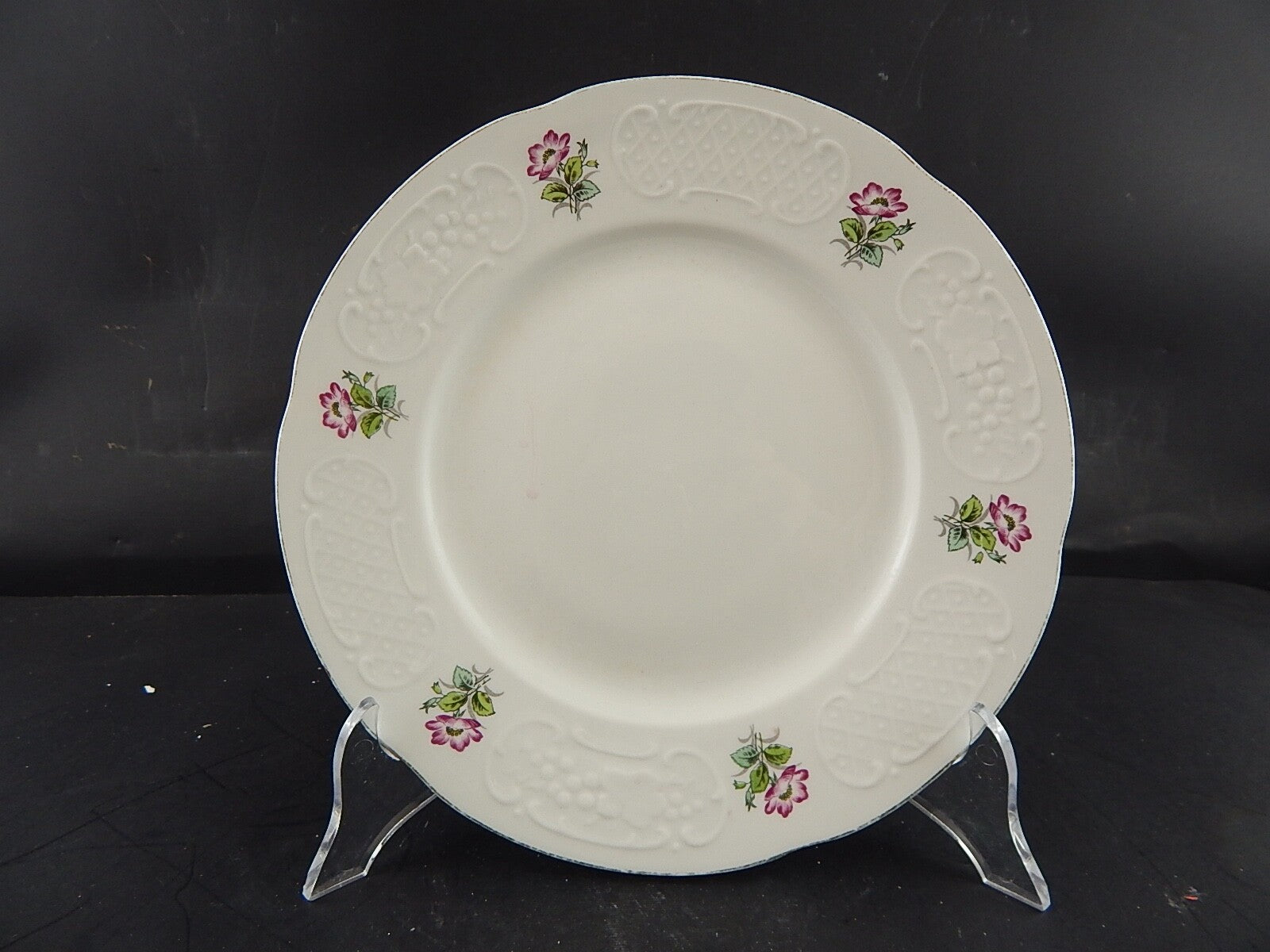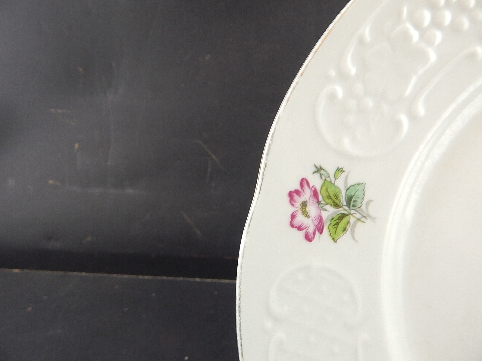 Il piatto in porcellana bianca è decorato con la rosa canina e misura 24 cm di diametro pur essendo privo di scheggiature e filature presenta piccoli segni del tempo tra cui il profilo in oro un po' sbiadito