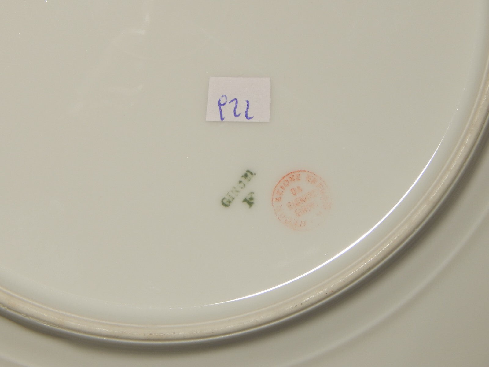 Il servizio è composto da 4 piatti piani che misurano 25 cm di diametro, 4 piatti fondi che misurano 24,5 cm di diametro e 6 piatti da dessert che misurano 21,5 cm di diametro, come si può vedere dalle foto tutti i piatti presentano piccole scheggiature sul bordo