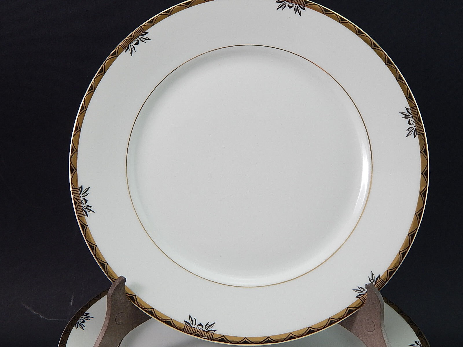 Il servizio composto da 6 piatti piani è stato realizzato in porcellana color avorio e decorato a mano in nero e oro zecchino
